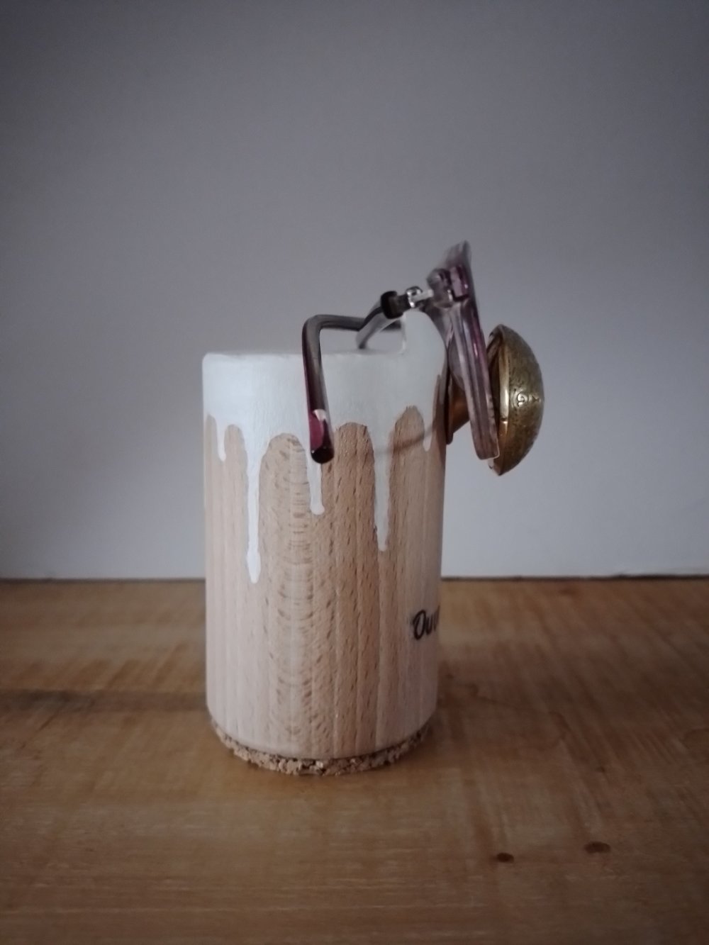 Il est réalisé avec un pied de lit "non conforme à la vente " et un bouton de porte ou de tiroir au rayon "liquidation ".