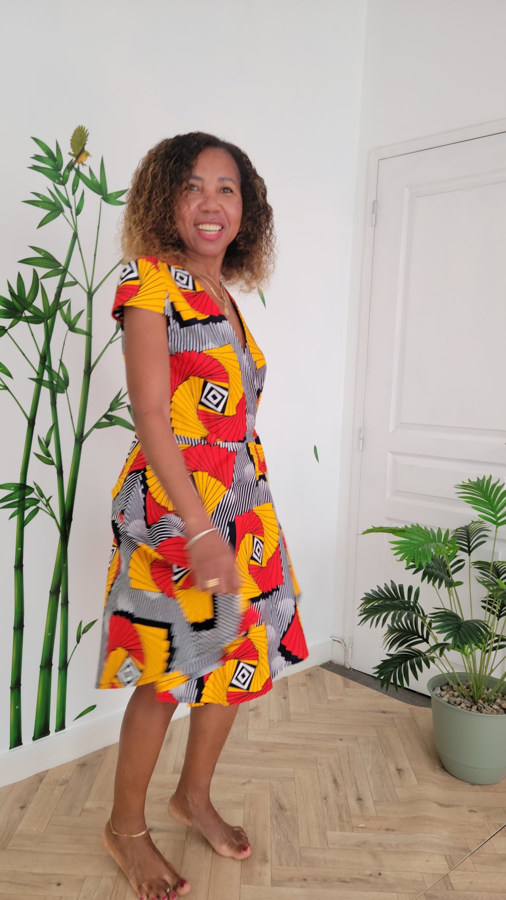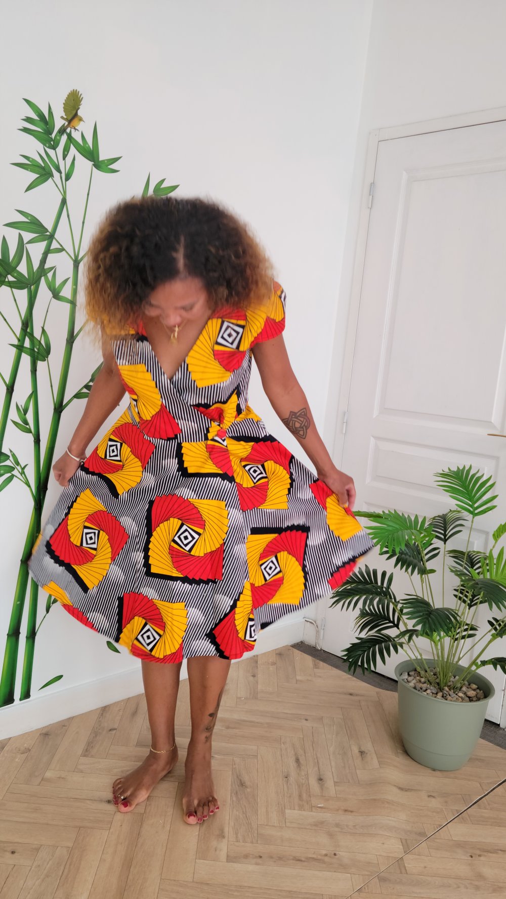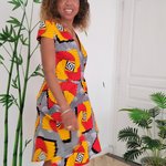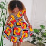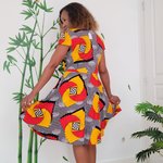Robe courte portefeuille, en tissu wax coloré, elegante, feminine,