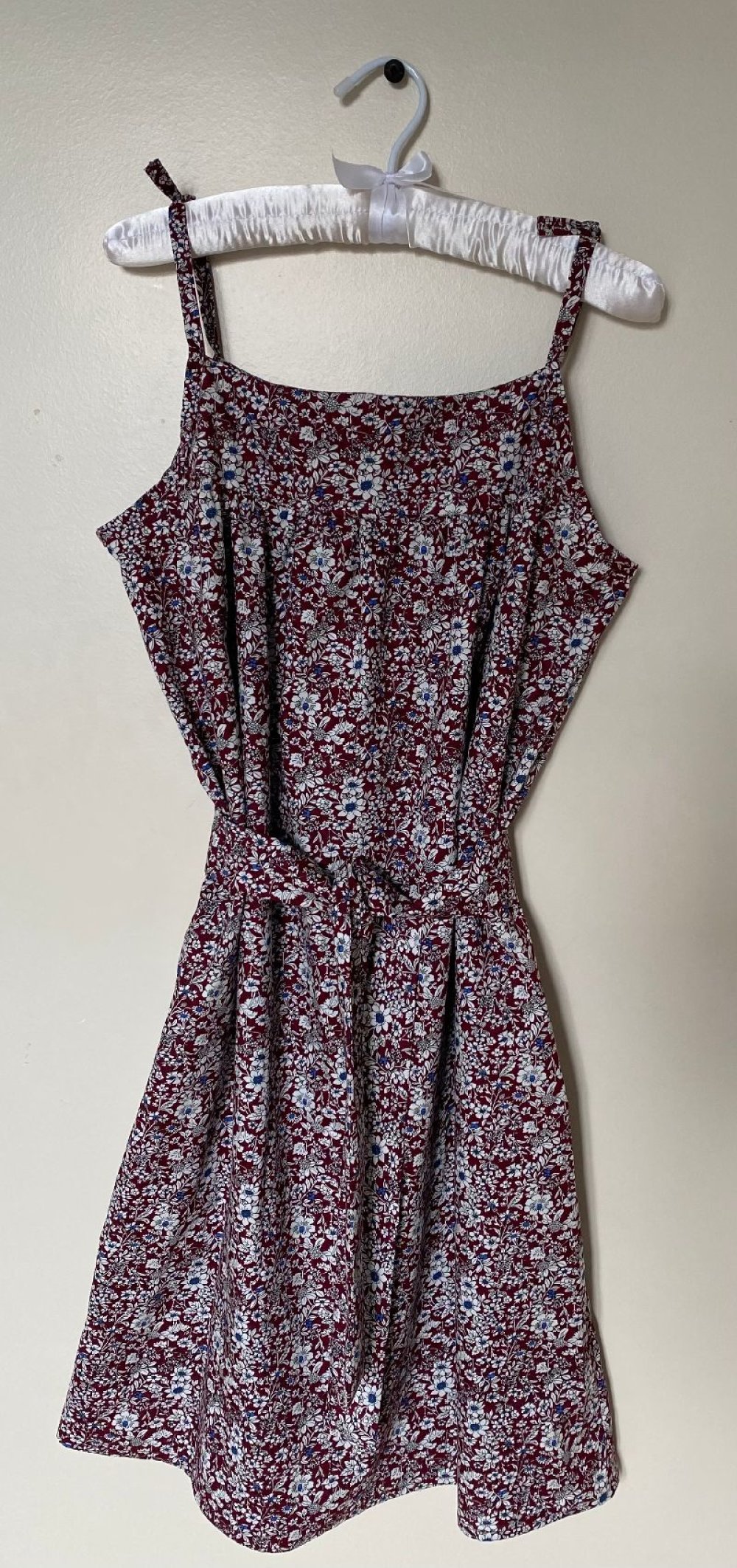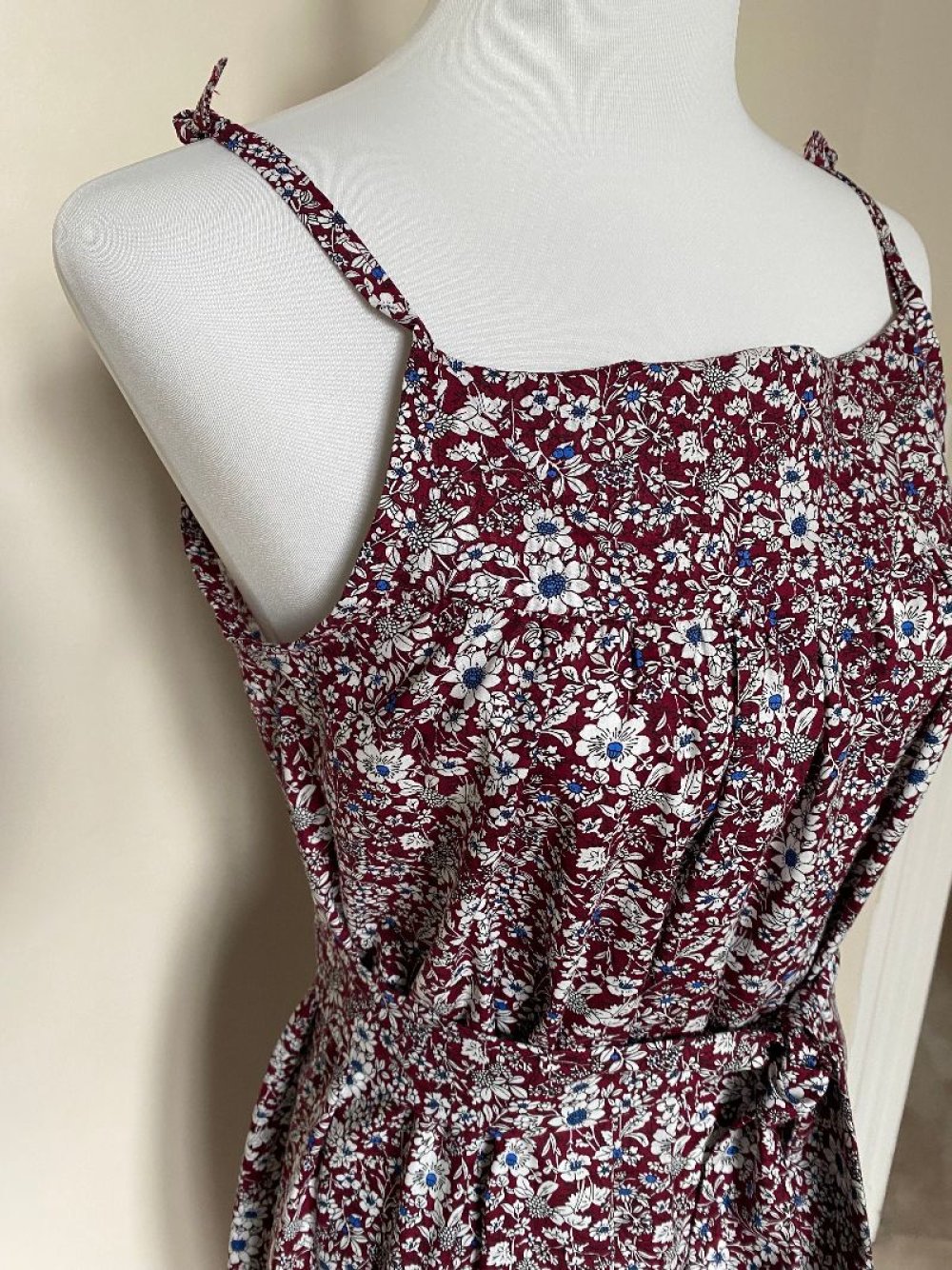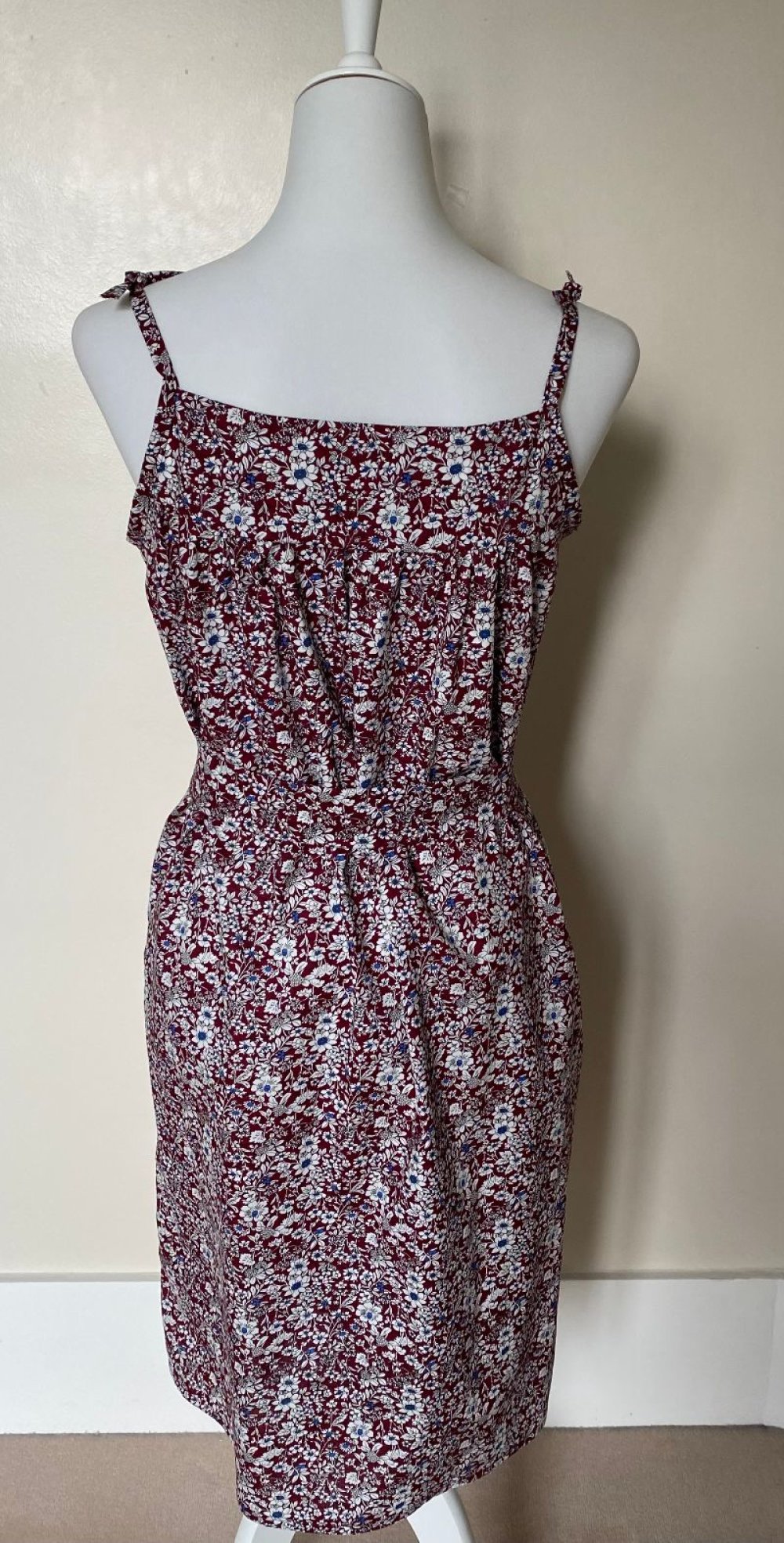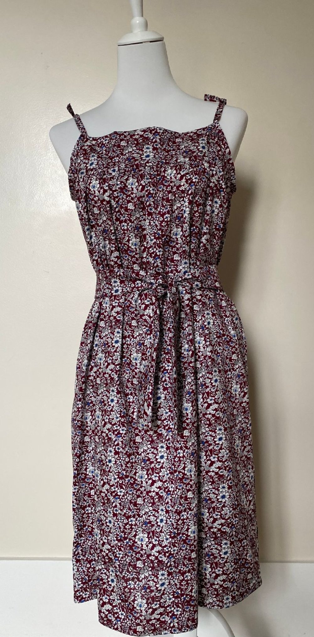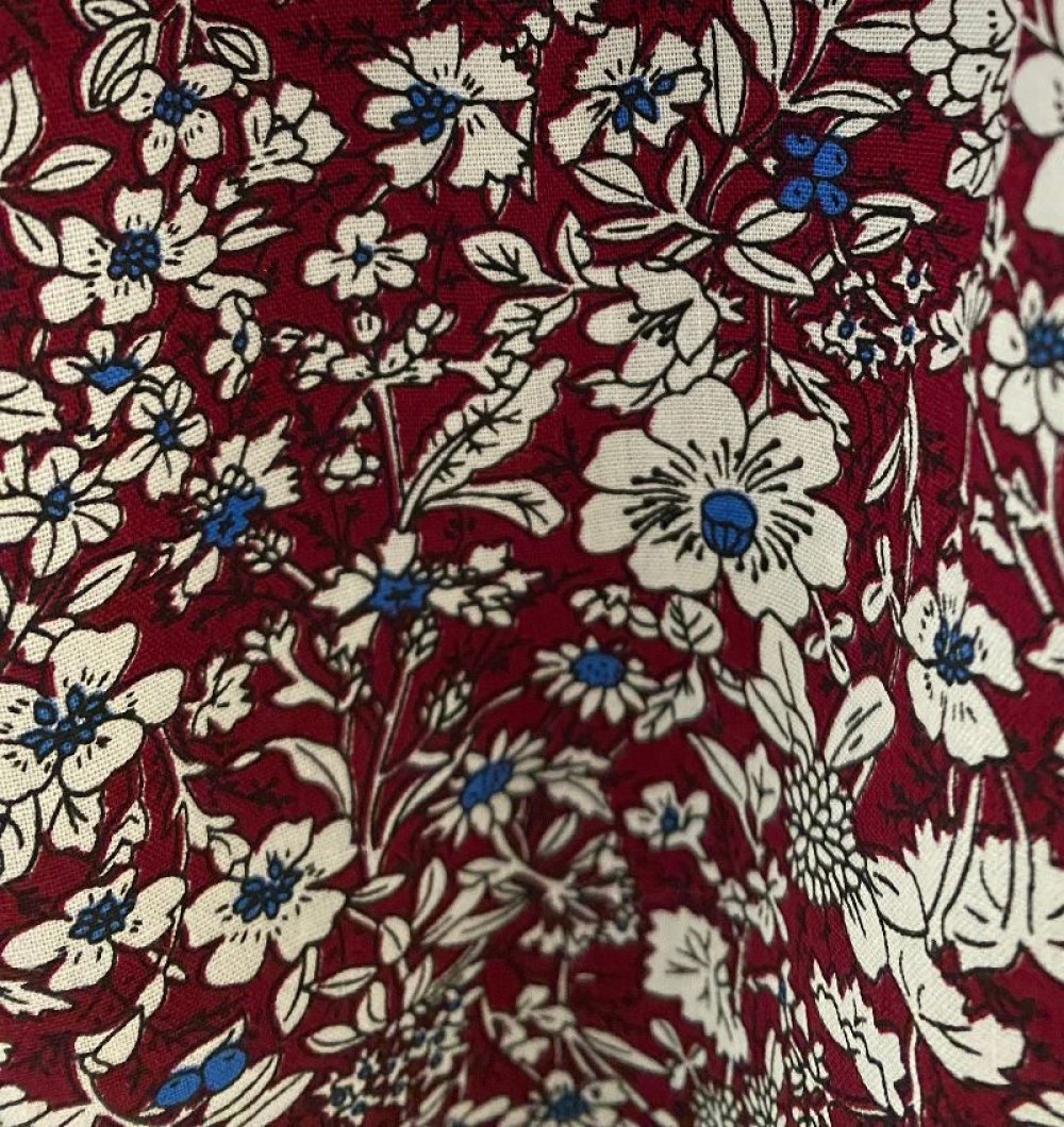 Dans un très joli coton fleuri japonais, dans les tons de bordeaux, une robe à nouettes réglables.