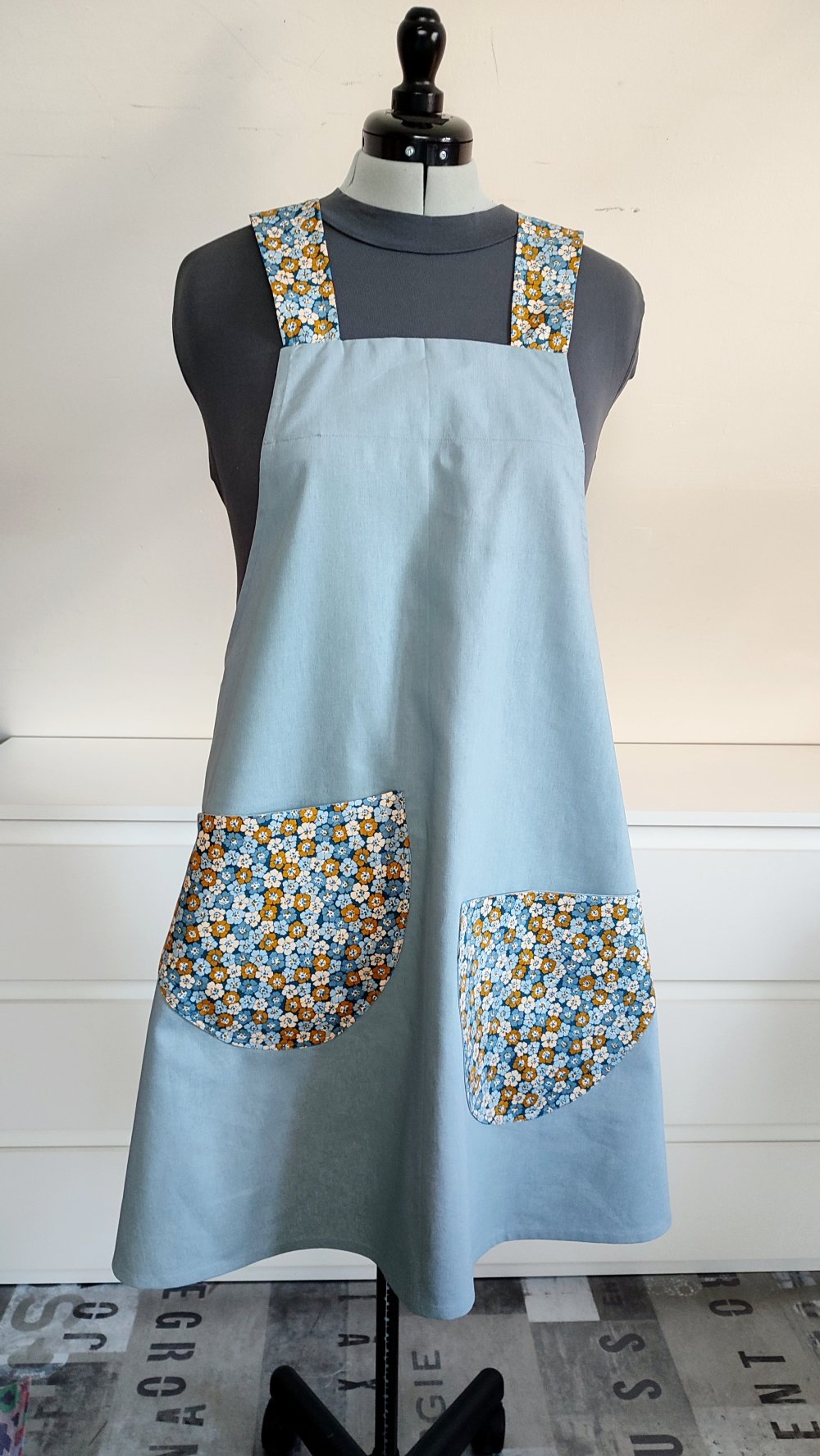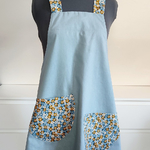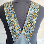 La robe/tablier est réalisée dans un tissu 55% lin et 45% coton. Les poches et parmentures sont en coton liberty.