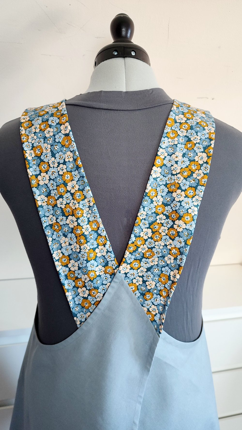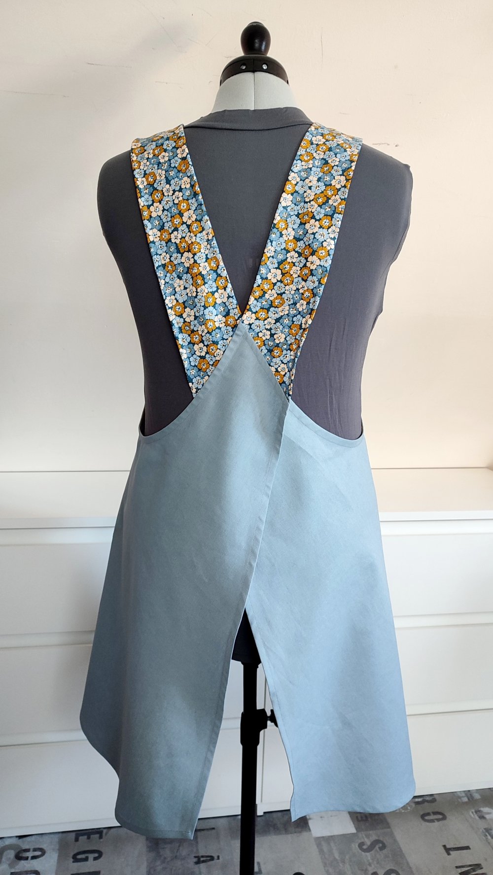 La forme du tablier permet de porter le vêtement tel quel pour un usage en tant que tablier ou en tant que sur-robe sur une blouse longue ou une jupe pour un effet loose et décontracté.