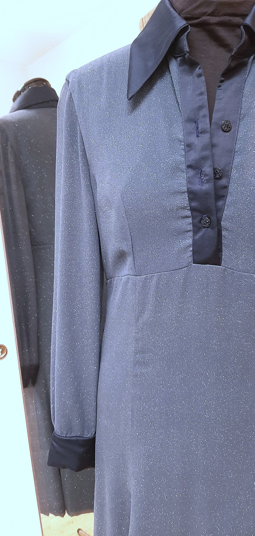 La doublure de satin de coton bleu nuit est très douce et agréable sur la peau s'associe et rehausse le tissu en mousseline à fines paillettes intégrées, de la robe.