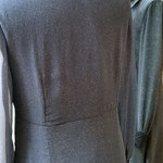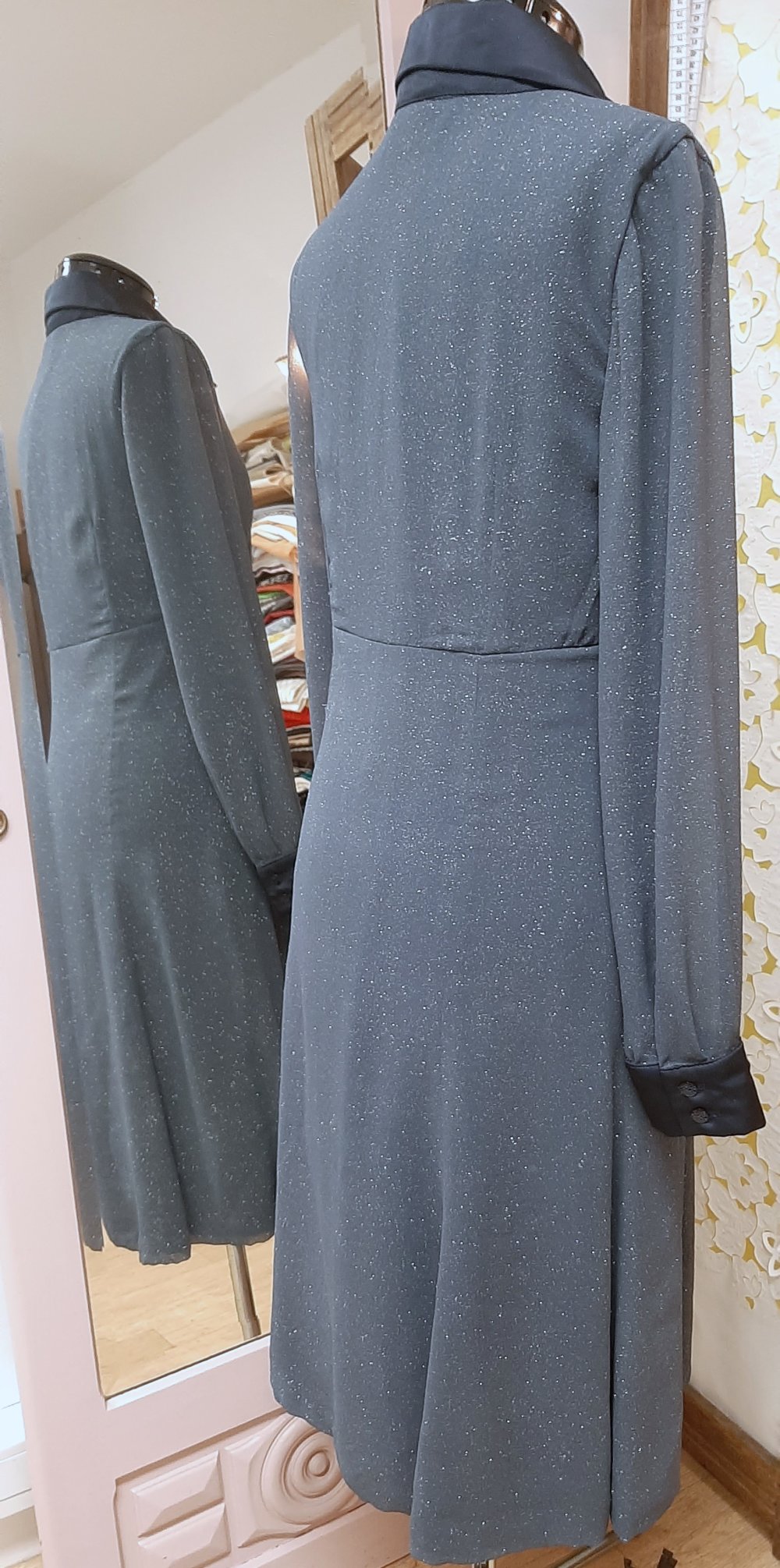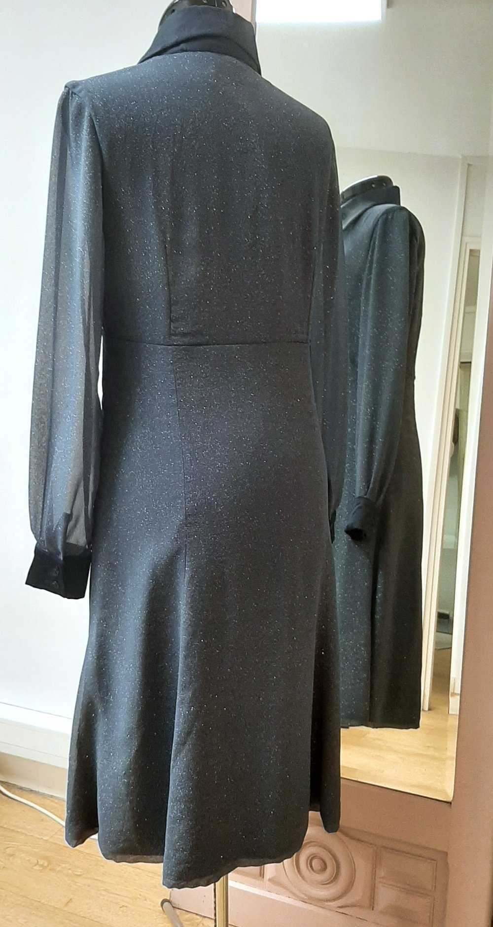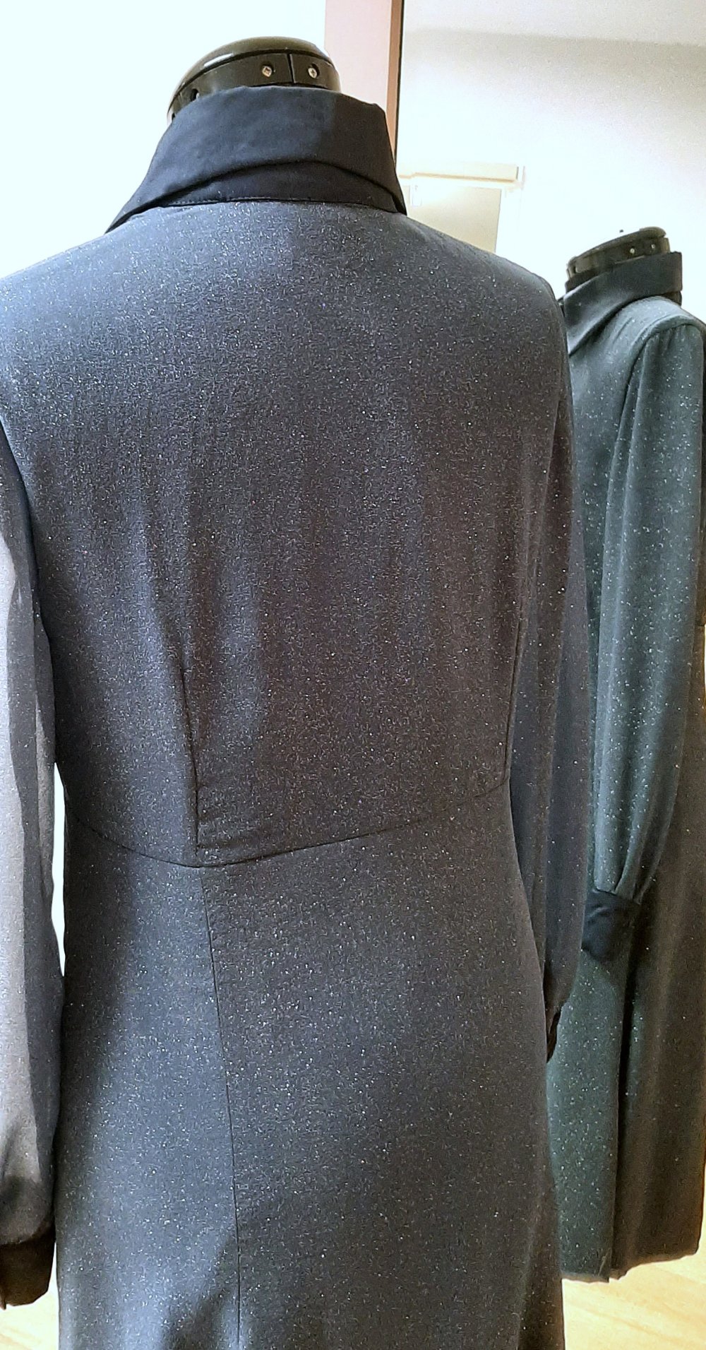 Un col satiné termine l'encolure qui est ouverte grâce à une patte de boutonnage et de petits boutons plats décorés - que l'on retrouve sur les poignets.