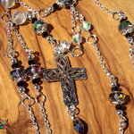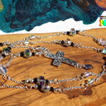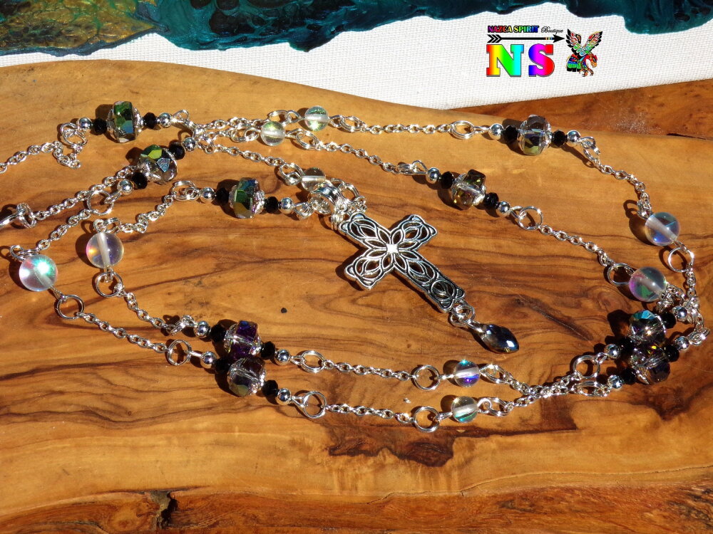 Je vous présente un superbe collier sautoir rosaire réalisé à partir de chaîne plaqué argent, de perles facettées en cristal de bohème Tchèque, de perles rondes Cristal Angel Aura Imitation Moonstone, de petites perles rondes plaqué argent et de perles facettées spinel noir.