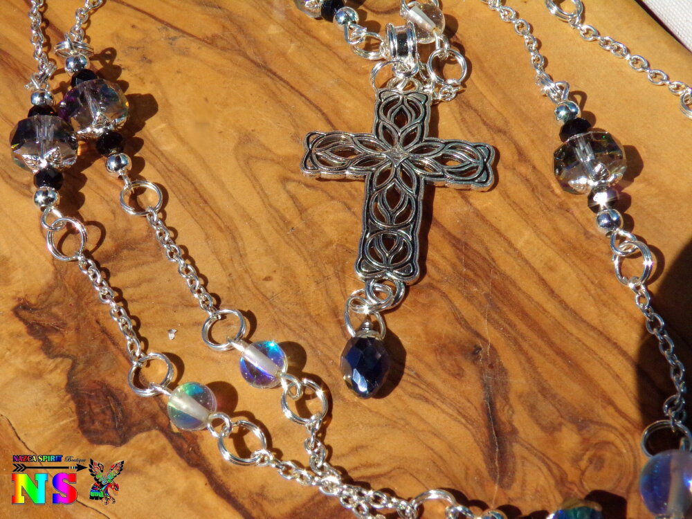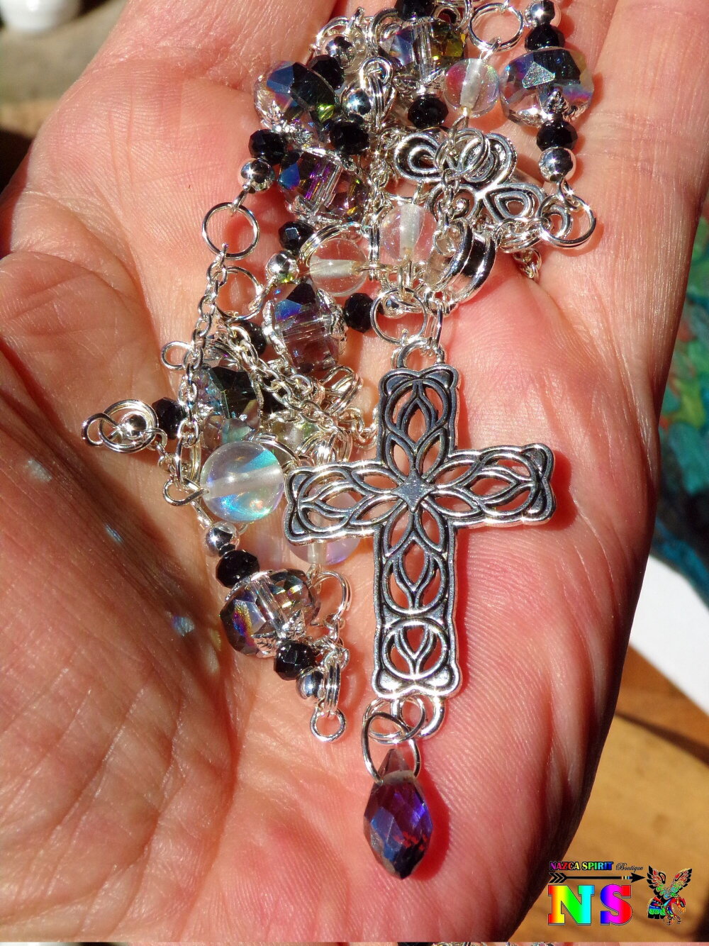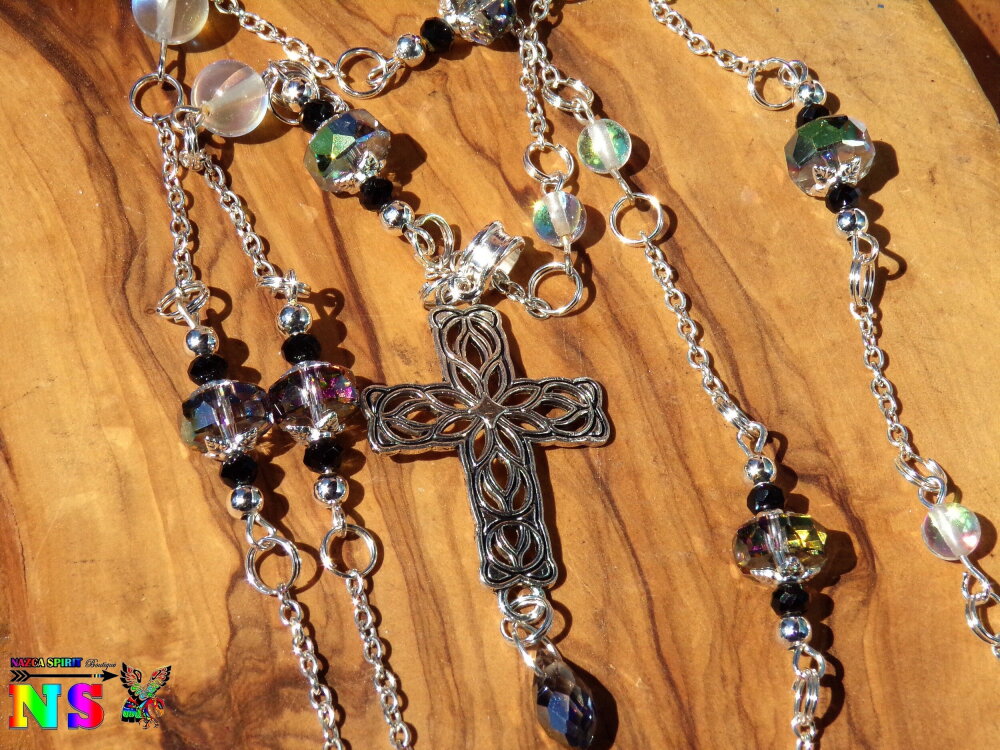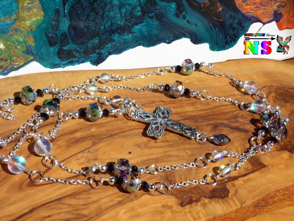 Rosaire Collier Chapelet 115 cm ("45.27) Plaqué Argent, Pendentif Croix Ciselée, Perles Facettées Cristal de Bohème Iridescent et Moonstone