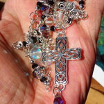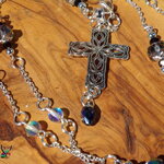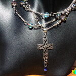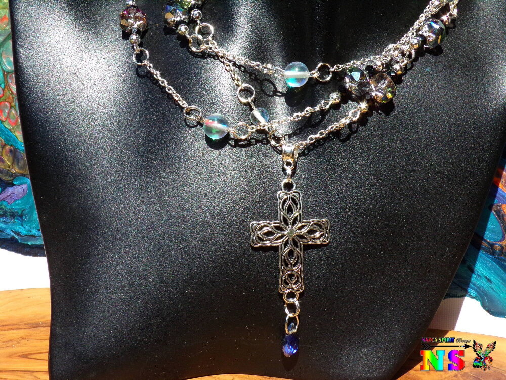 J'ai relié au sautoir, à l'aide d'une jolie bélière plaqué argent, une magnifique croix ciselée en alliage tibétain au bout de laquelle j'ai relié une perle goutte facettée en cristal de bohème bleu iridescent.