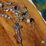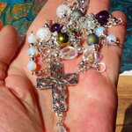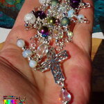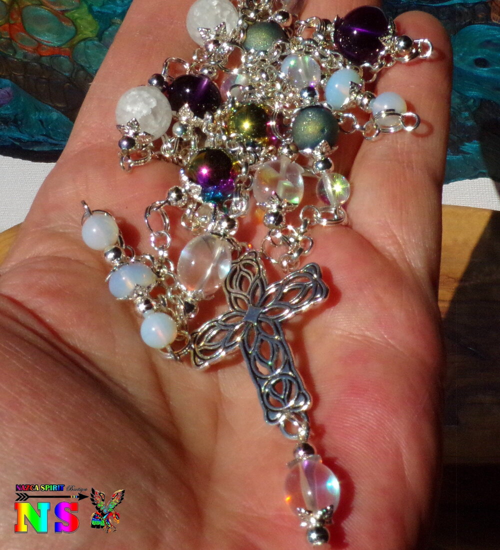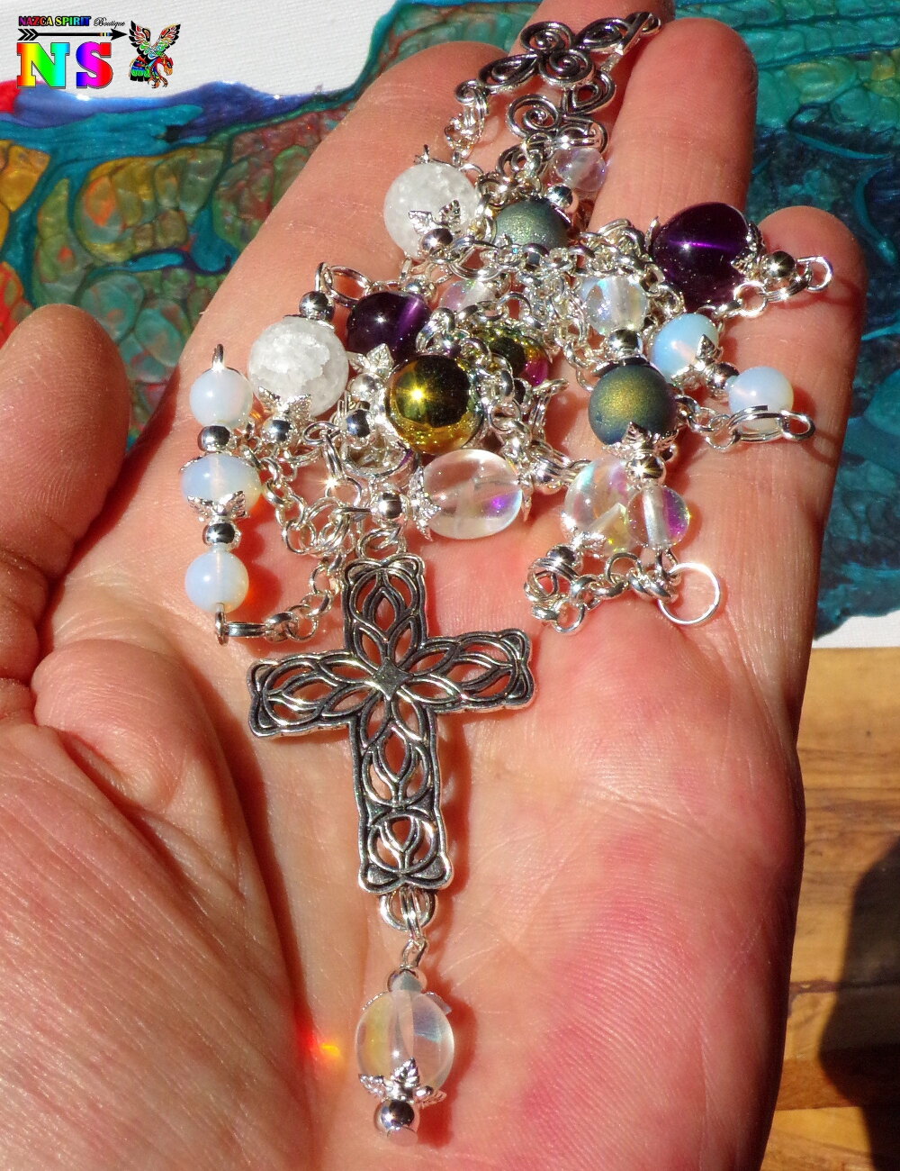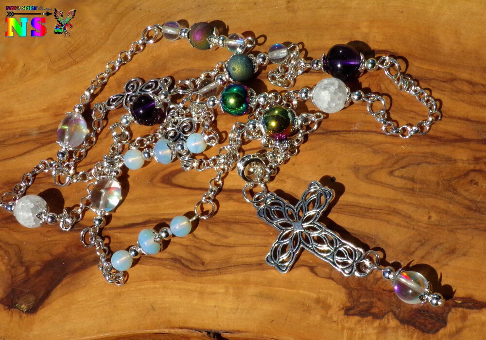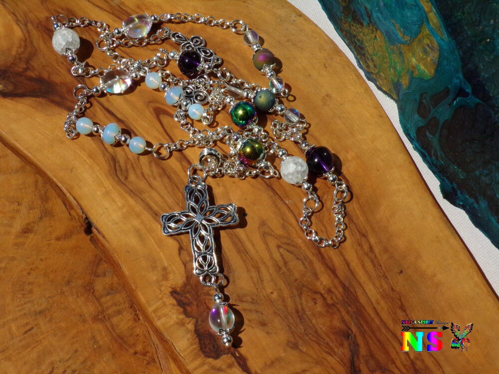 Je vous présente un superbe collier sautoir rosaire réalisé à partir de chaîne plaqué argent, de perles en opaline, de perles en cristal de bohème imitation perles de lune iridescents, de perles rondes cristal angel aura et de pierres fines : cristal de roche craquelé dépoli, hématite arc-en-ciel, améthystes, agates géode pourpre iridescent.