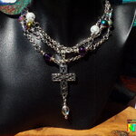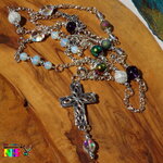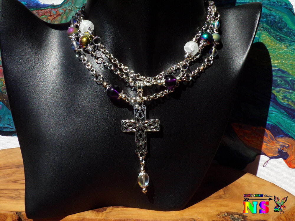 J'ai relié au sautoir, à l'aide d'une jolie bélière plaqué argent, une magnifique croix ciselée en alliage tibétain au bout de laquelle j'ai relié une perle ovale en cristal angel aura.
