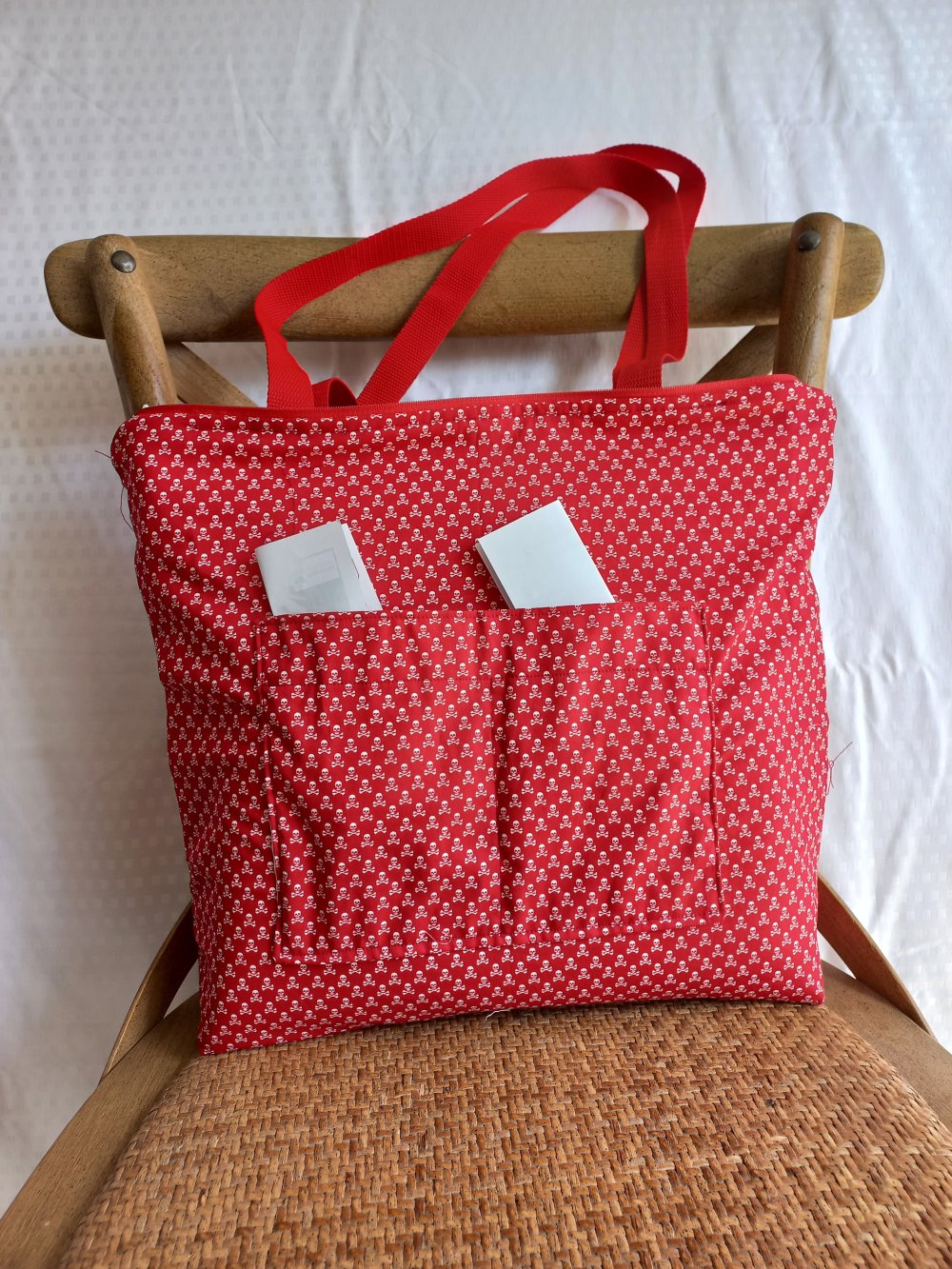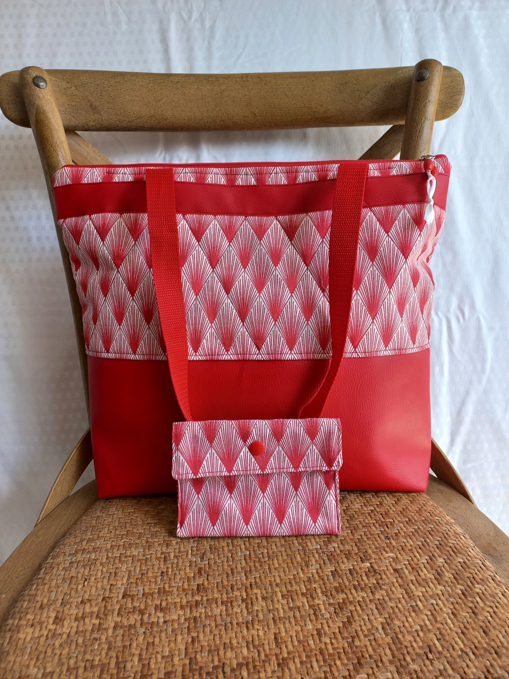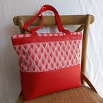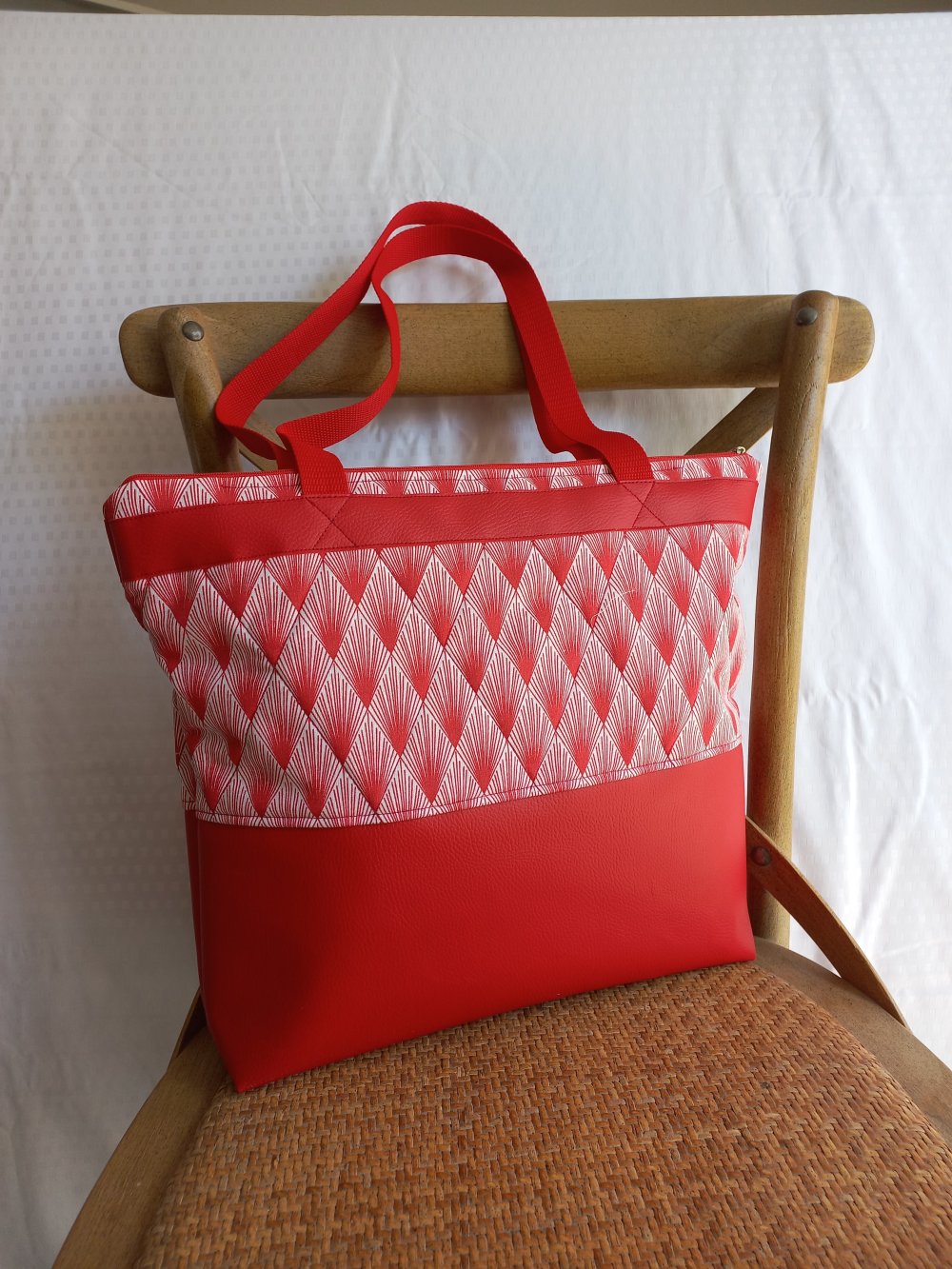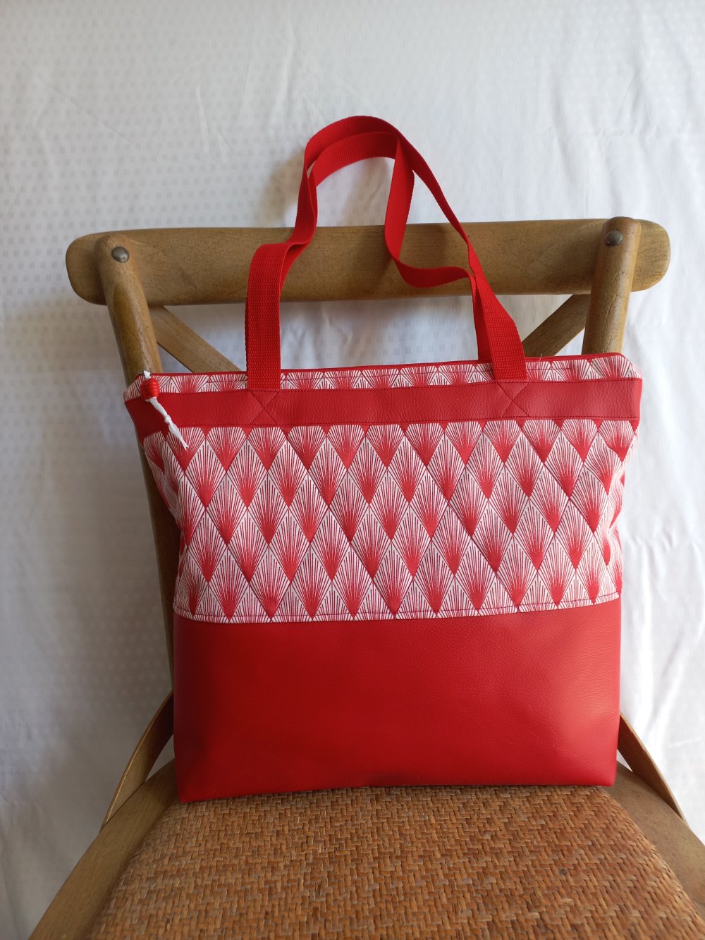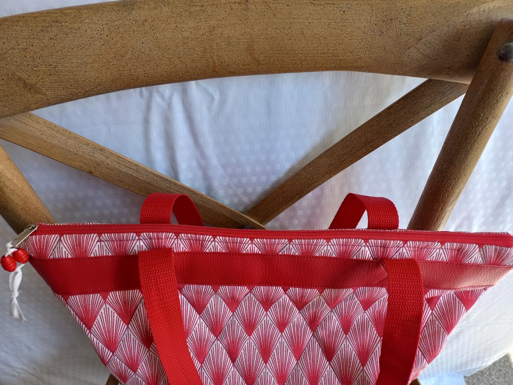 sac cabas port à l'épaule,simili et sangle rouge,tissu motifs éventails rouges,fermeture éclair rouge.doublé avec poches intérieurs
