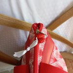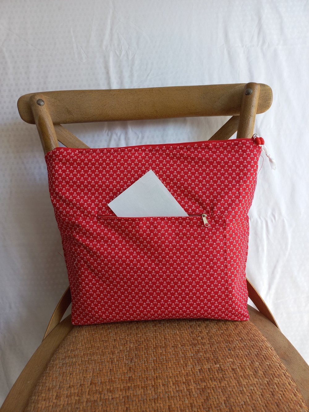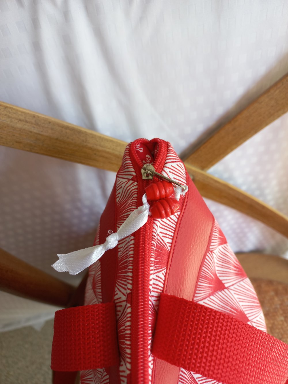 il se ferme avec une fermeture éclair rouge,le curseur est agrémenté d'un ruban blanc et 2 perles rouges.