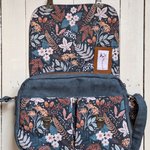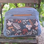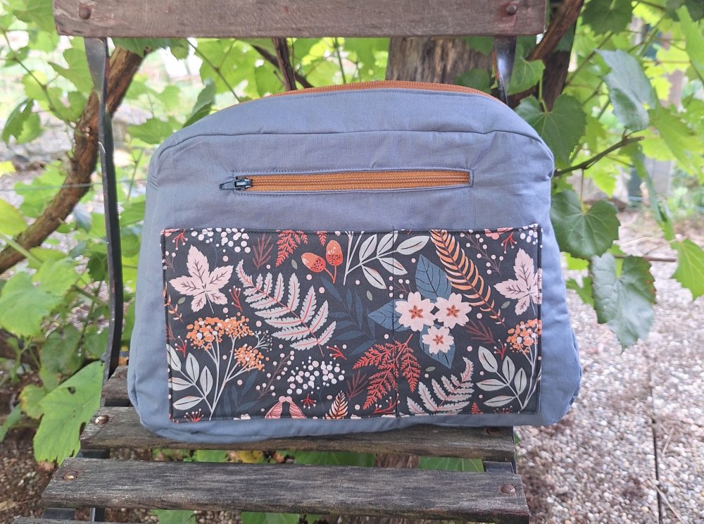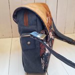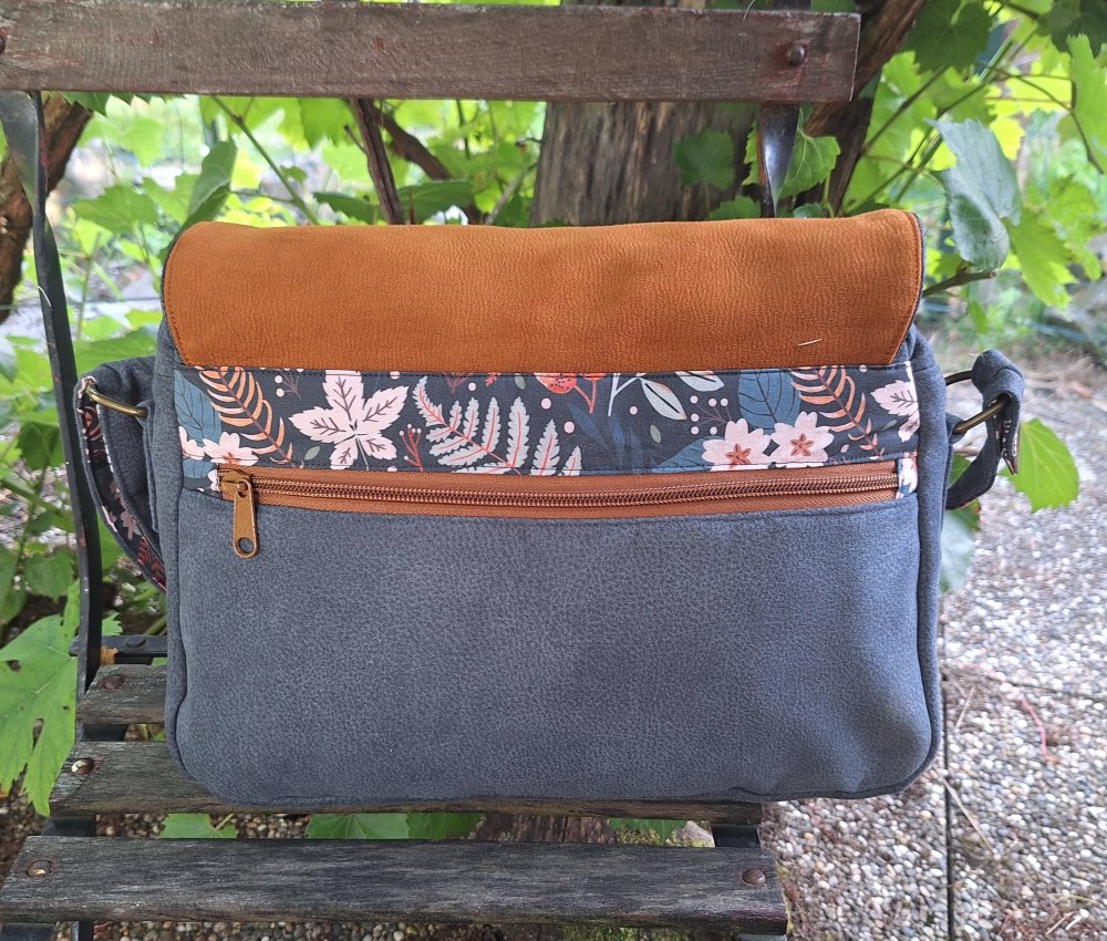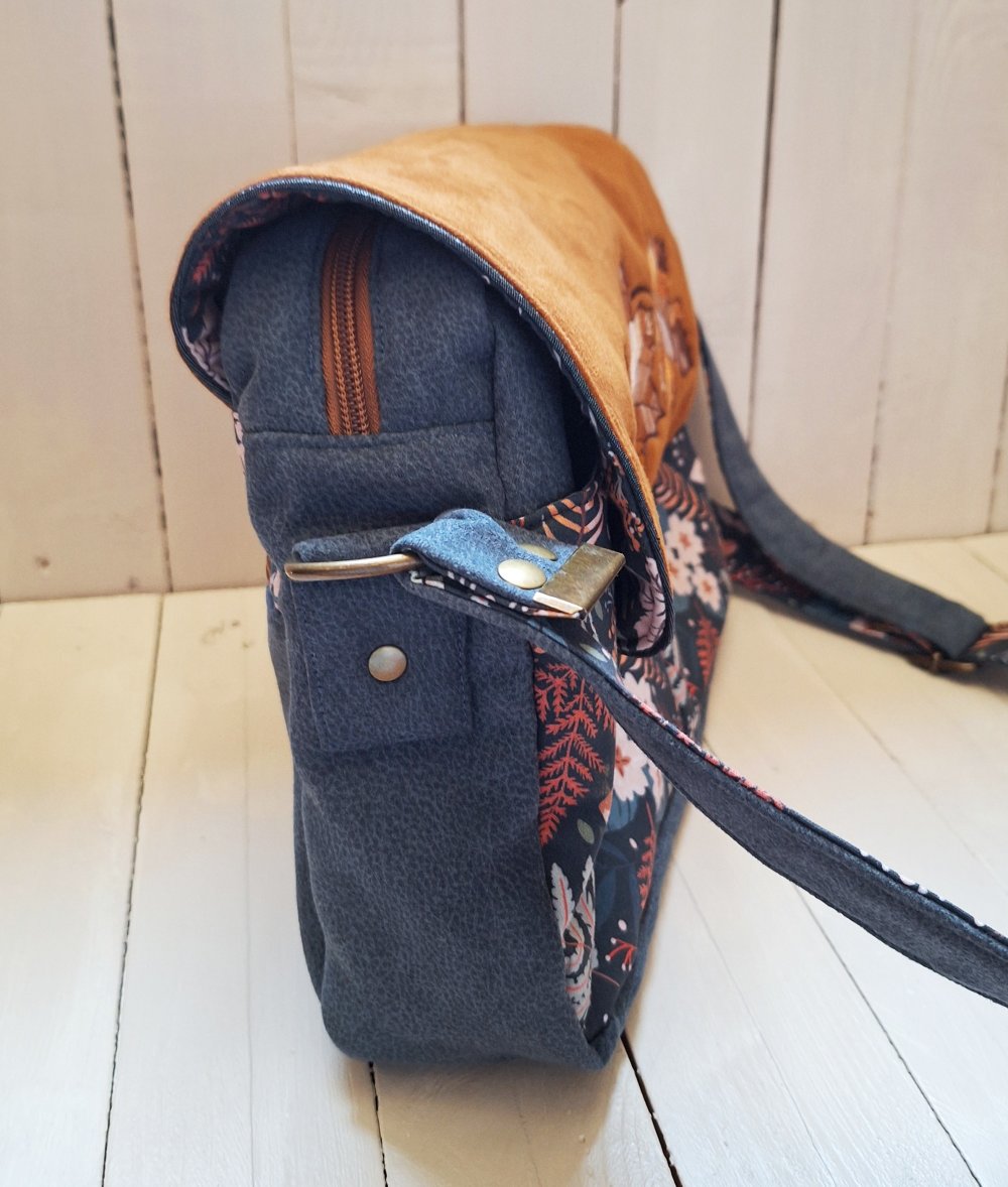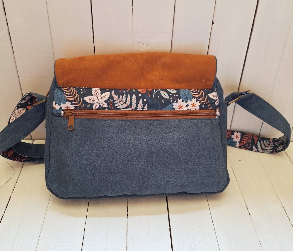 L'extérieur de la besace est en faux cuir cuivré imitation daim, en similicuir bleu jean et en tissu en coton noir avec des feuilles et des fougères dans des couleurs automnales.