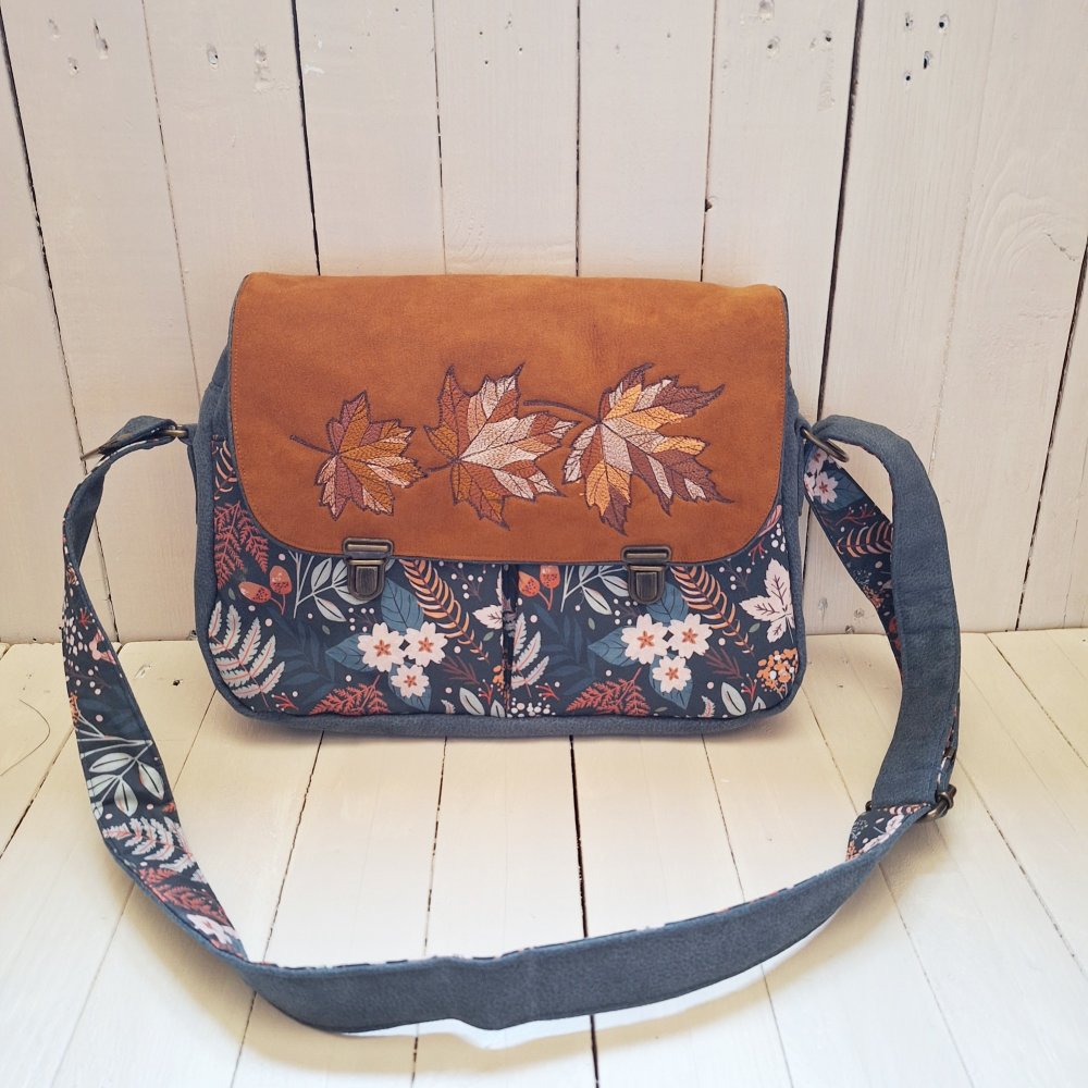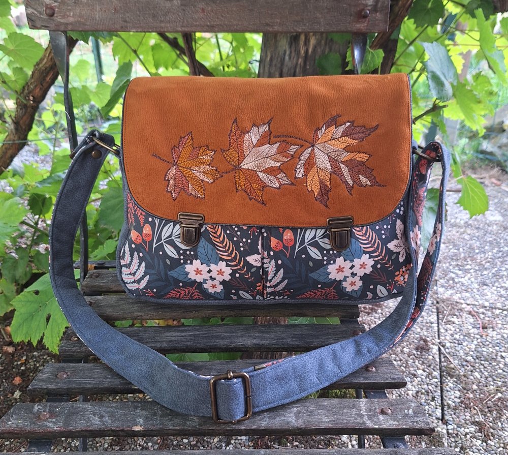 Besace cartable pour femme, sac à bandoulière avec broderie feuilles d'automne en faux cuir cuivre et bleu jean et coton avec des fougères