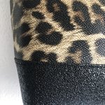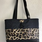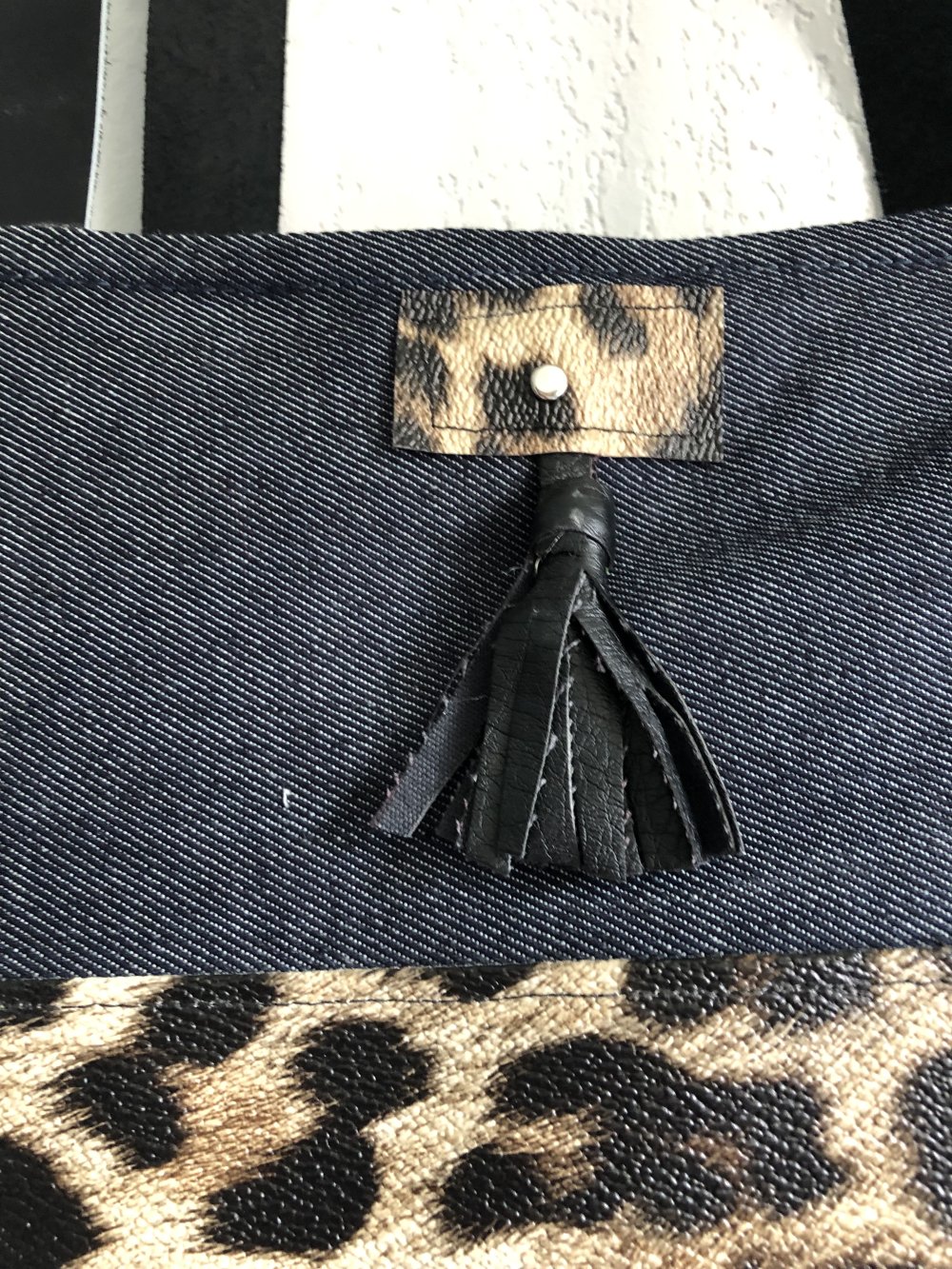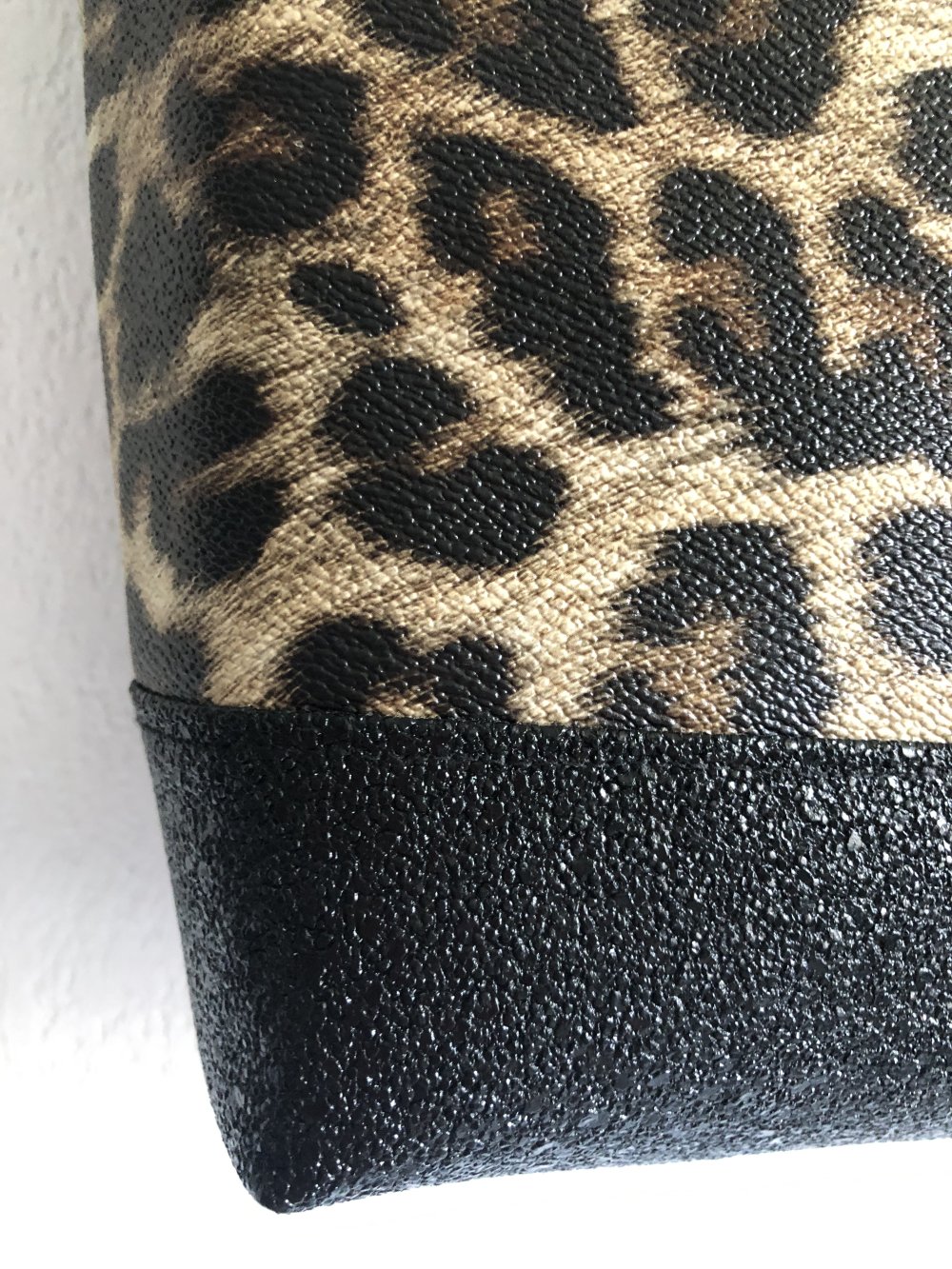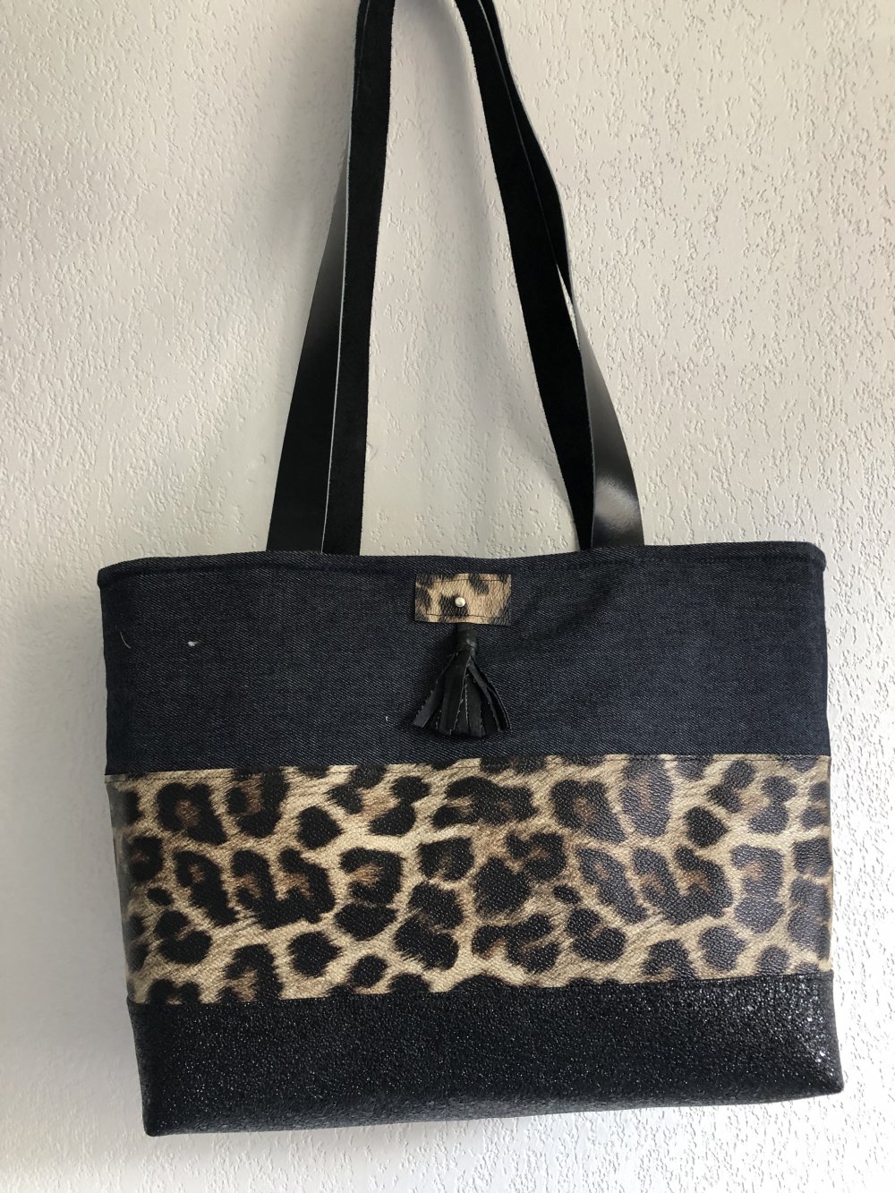 CABA 3 MATIÈRES :SIMILI NOIR LÉOPARD JEAN’S FINITIONS ANSES CUIR LISSE NOIRES ET POMPON