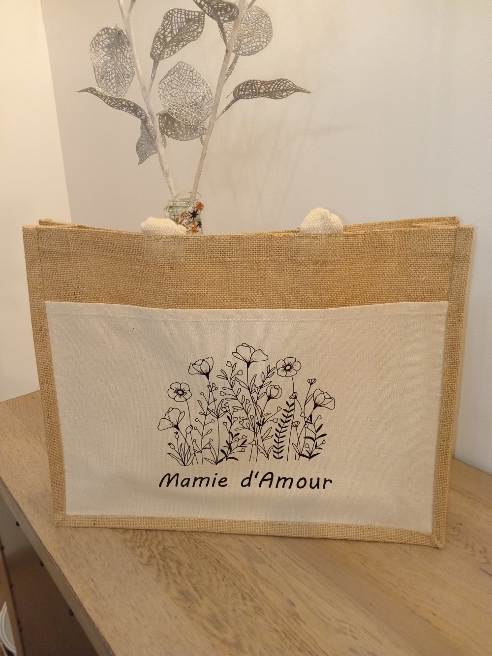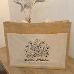 Grand sac cabas en toile de jute avec une poche en coton pour nos mamies adorées.