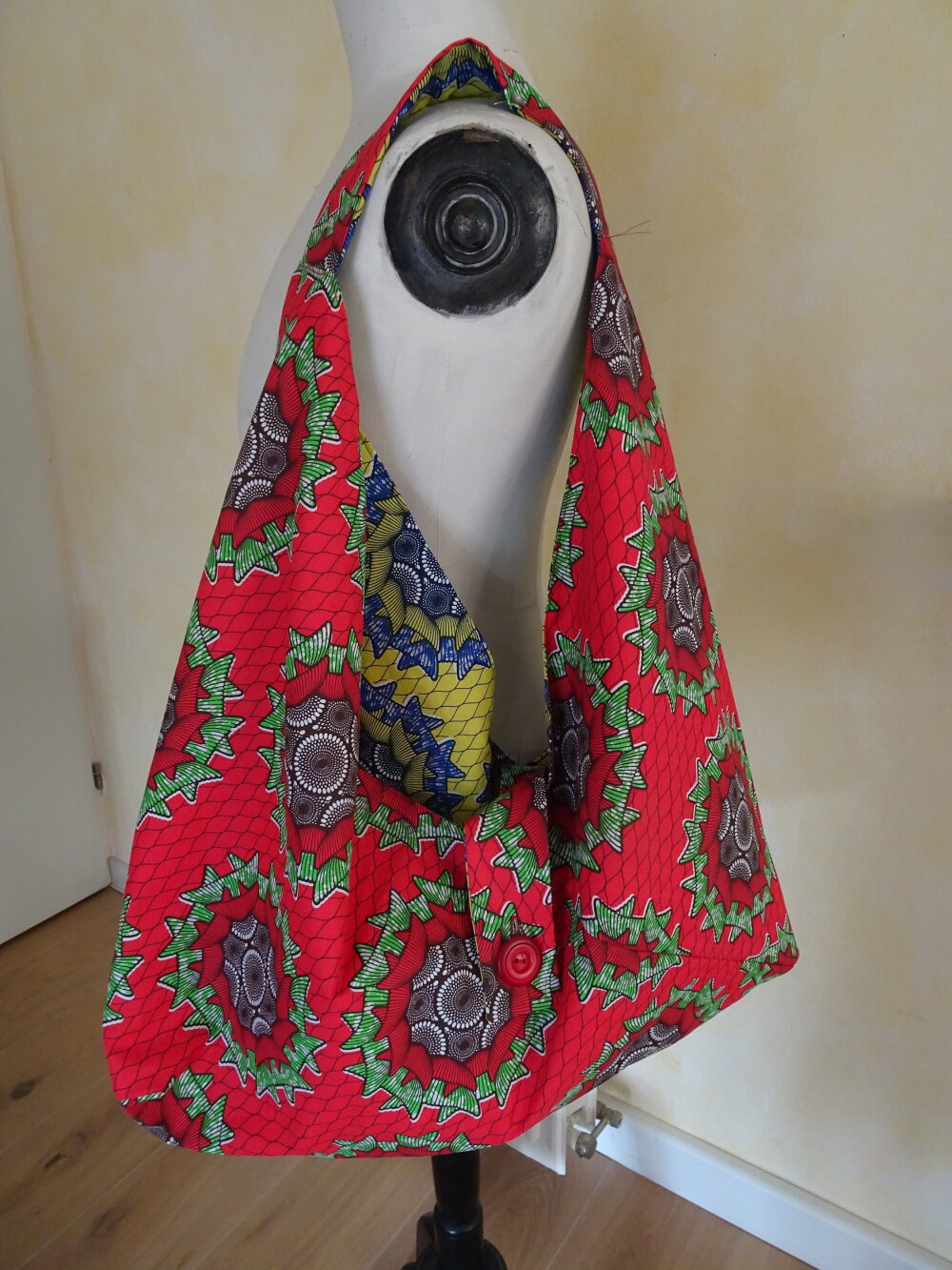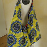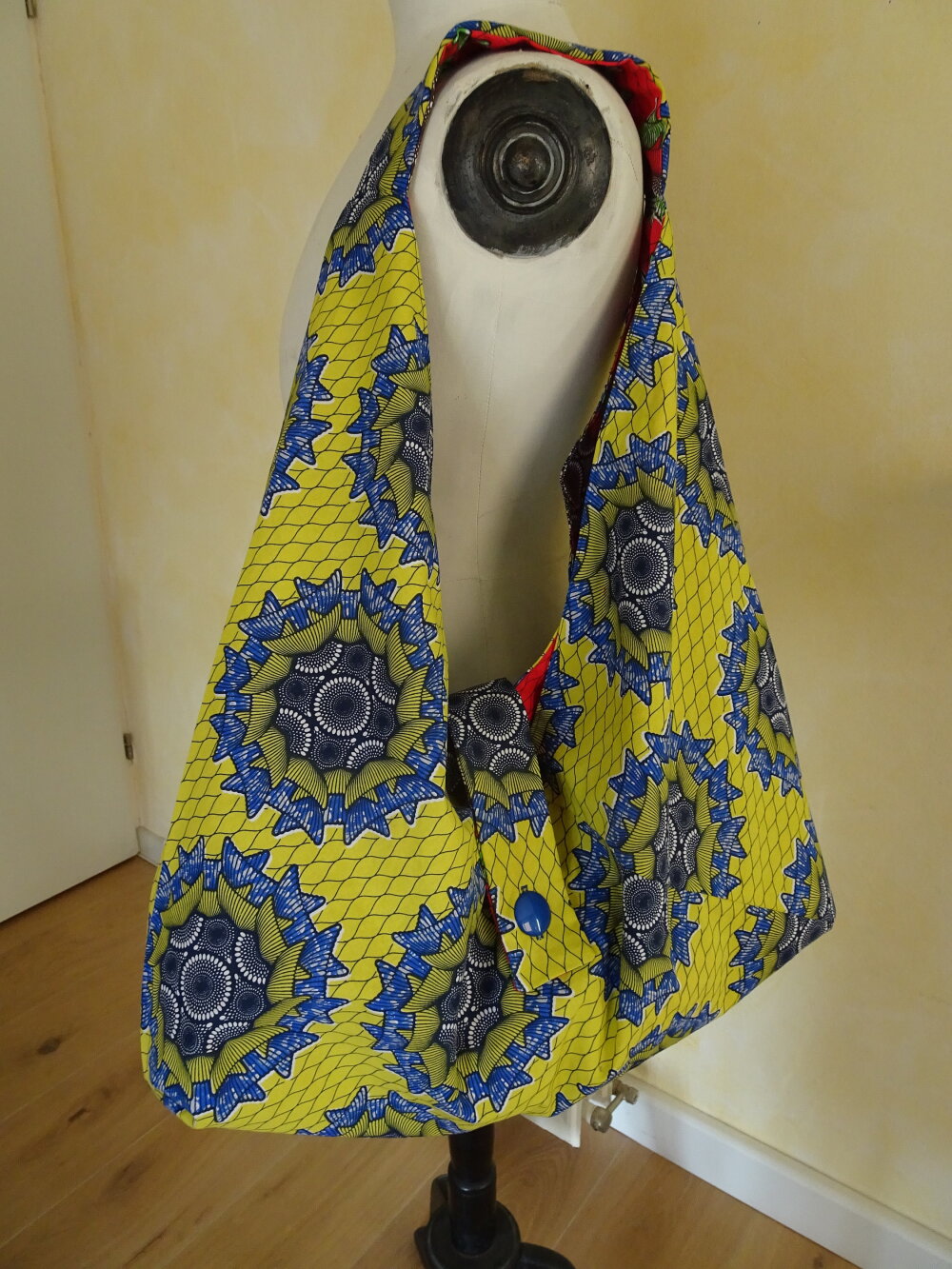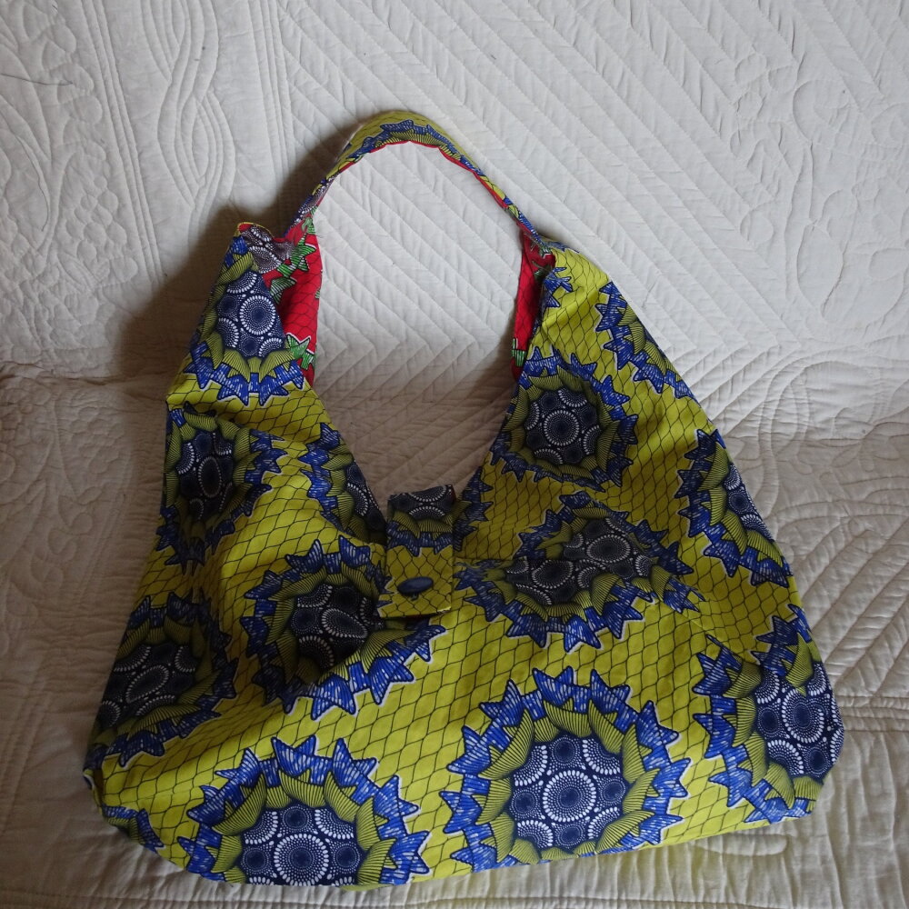 Voilà un grand sac origami réversible fait avec une cotonnade motif wax. Il se ferme avec une patte munie d'un bouton bleu du côté jaune et rouge de l'autre côté.