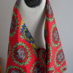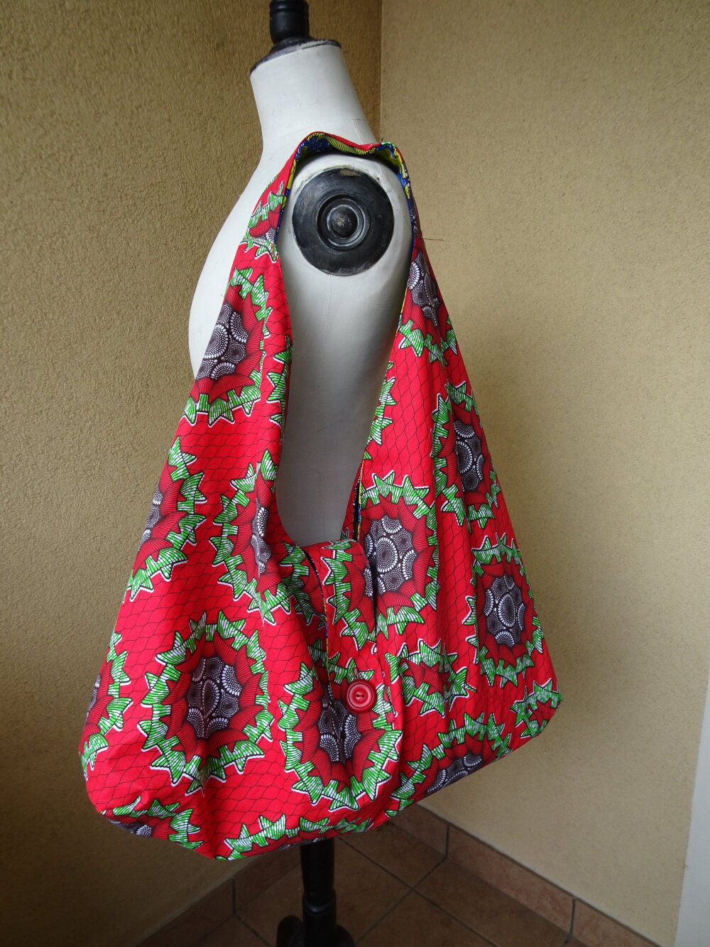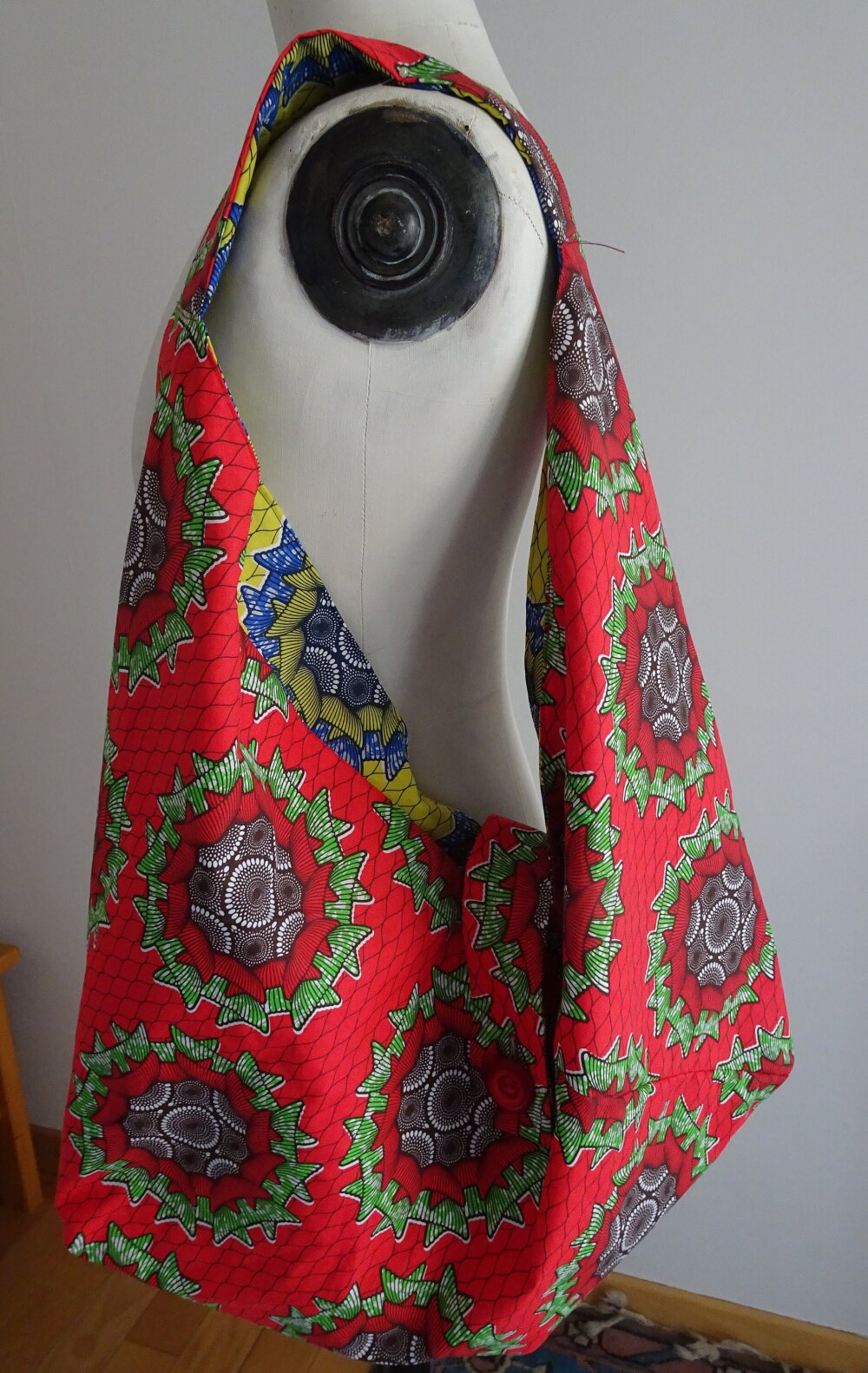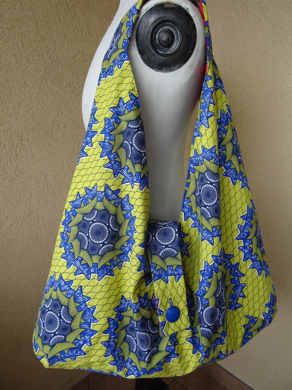 Voilà un grand sac origami réversible fait avec une cotonnade motif wax. Il se ferme avec une patte munie d'un bouton bleu du côté jaune et rouge de l'autre côté.
