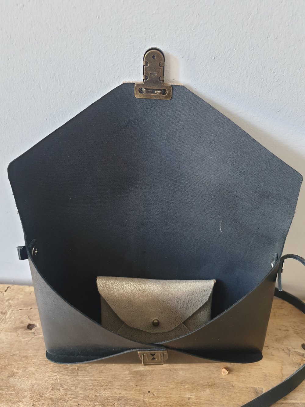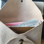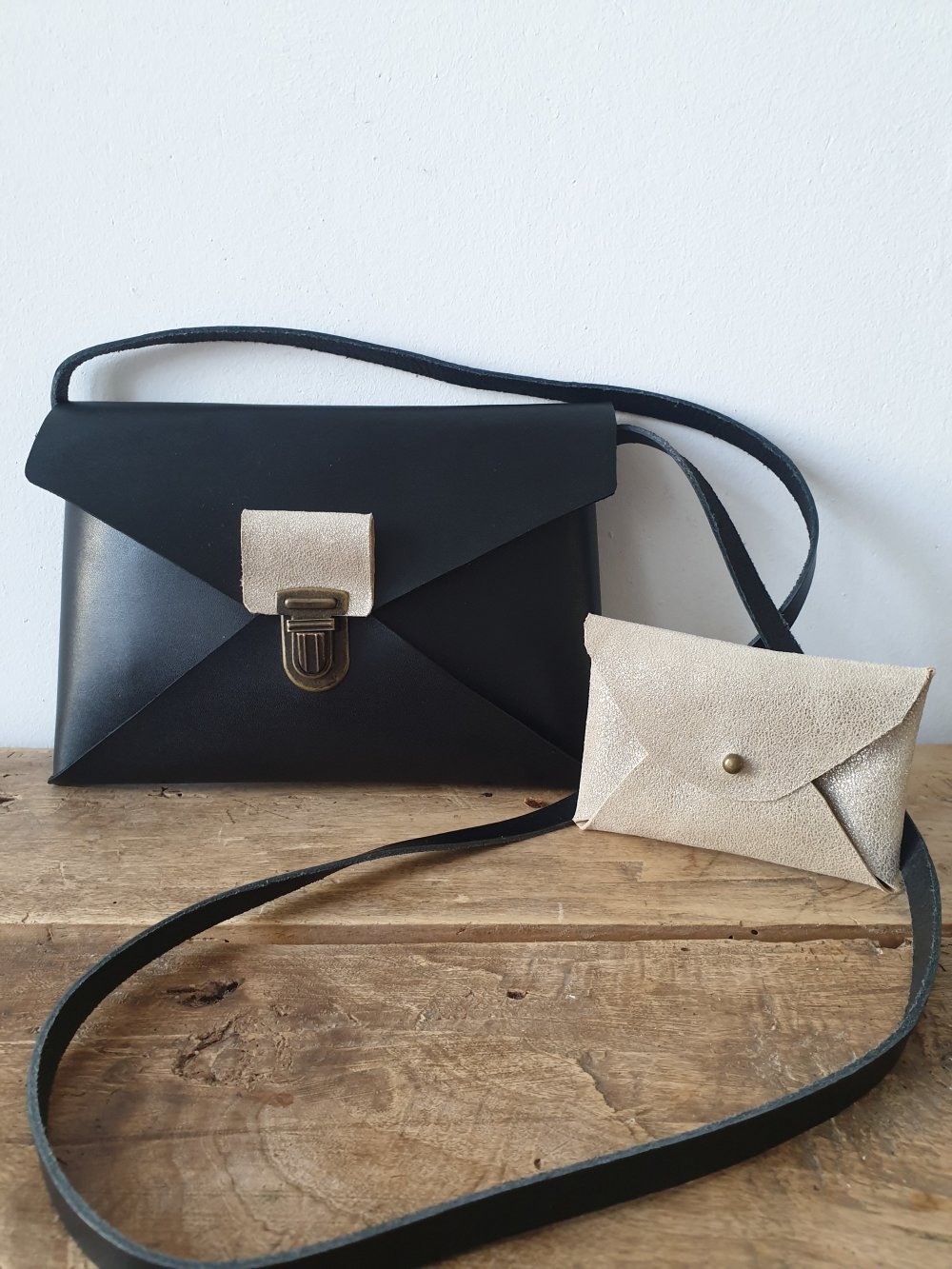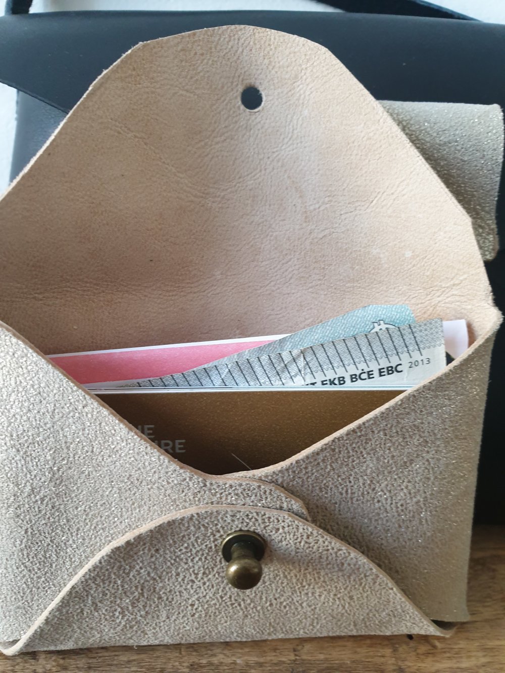 Avec son porte cartes ou porte monnaie en cuir dorée.