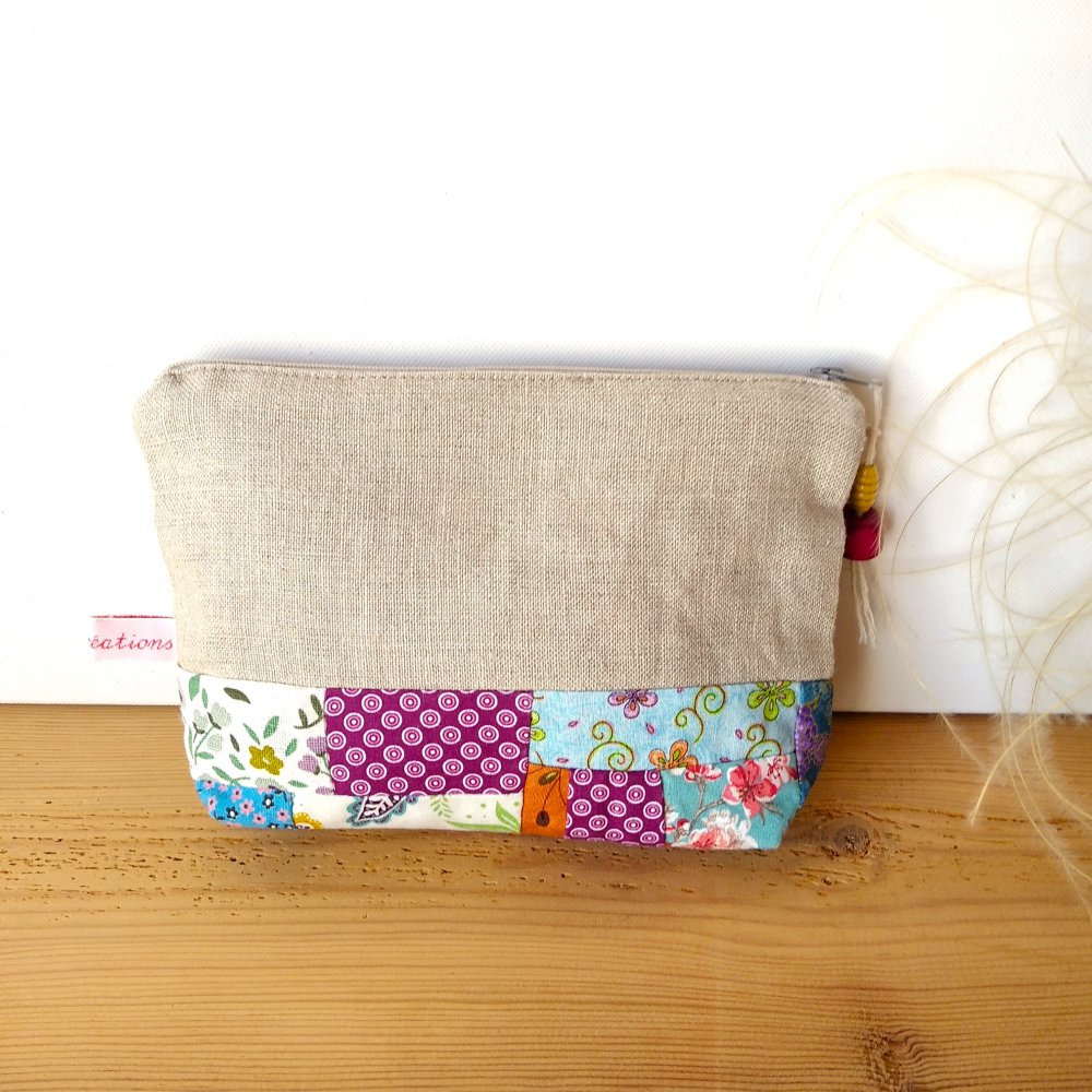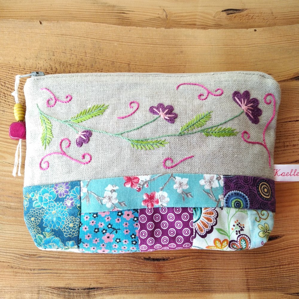 Pochette en lin naturel écru brodée à la main. Vous pouvez l'utiliser comme pochette à maquillage ou pochette de rangement pour vos voyages.