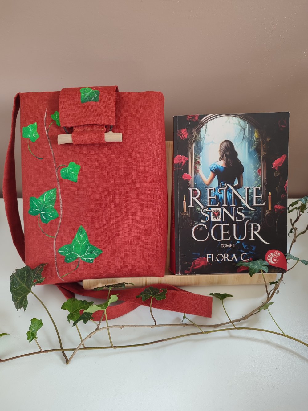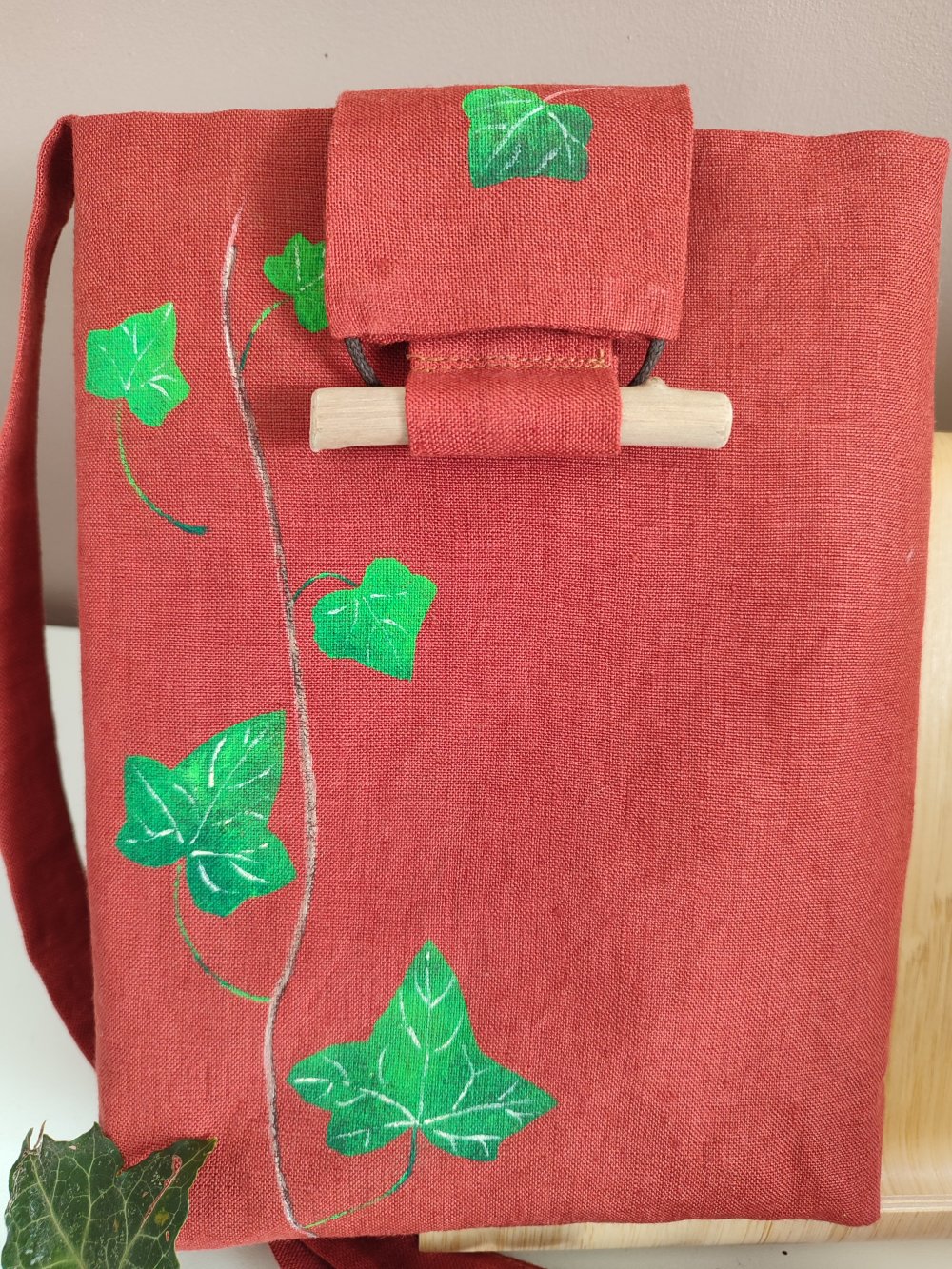 Pochette livre à porter en bandoulière, motif lierre peint à la main