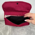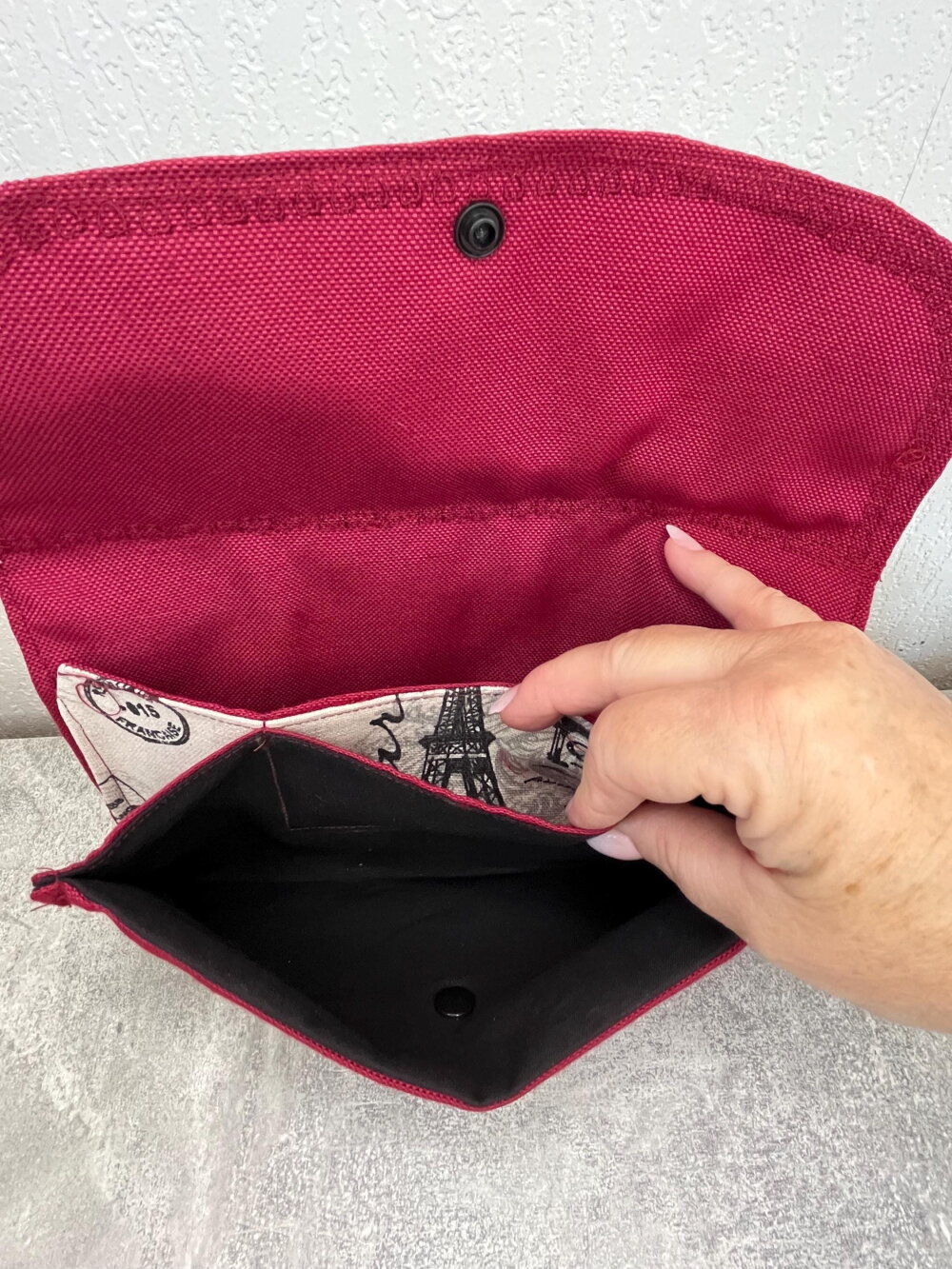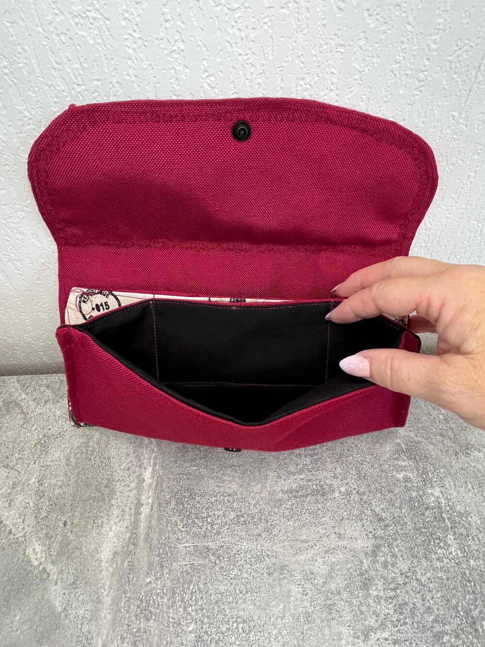 À l’intérieur, la pochette révèle de pratiques compartiments pour organiser vos essentiels avec élégance : téléphone, clés, maquillage, papiers… tout trouve sa place.