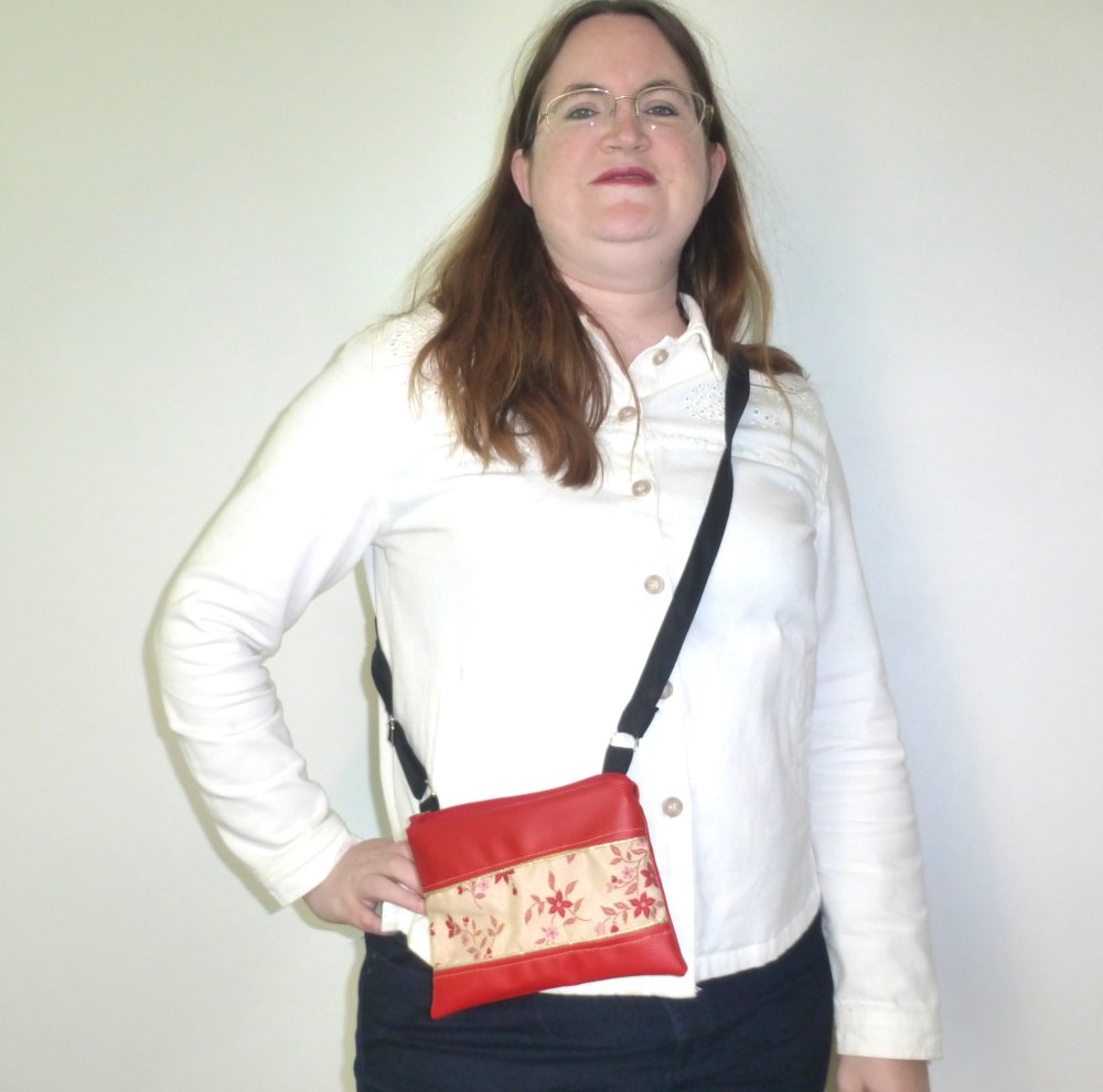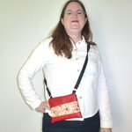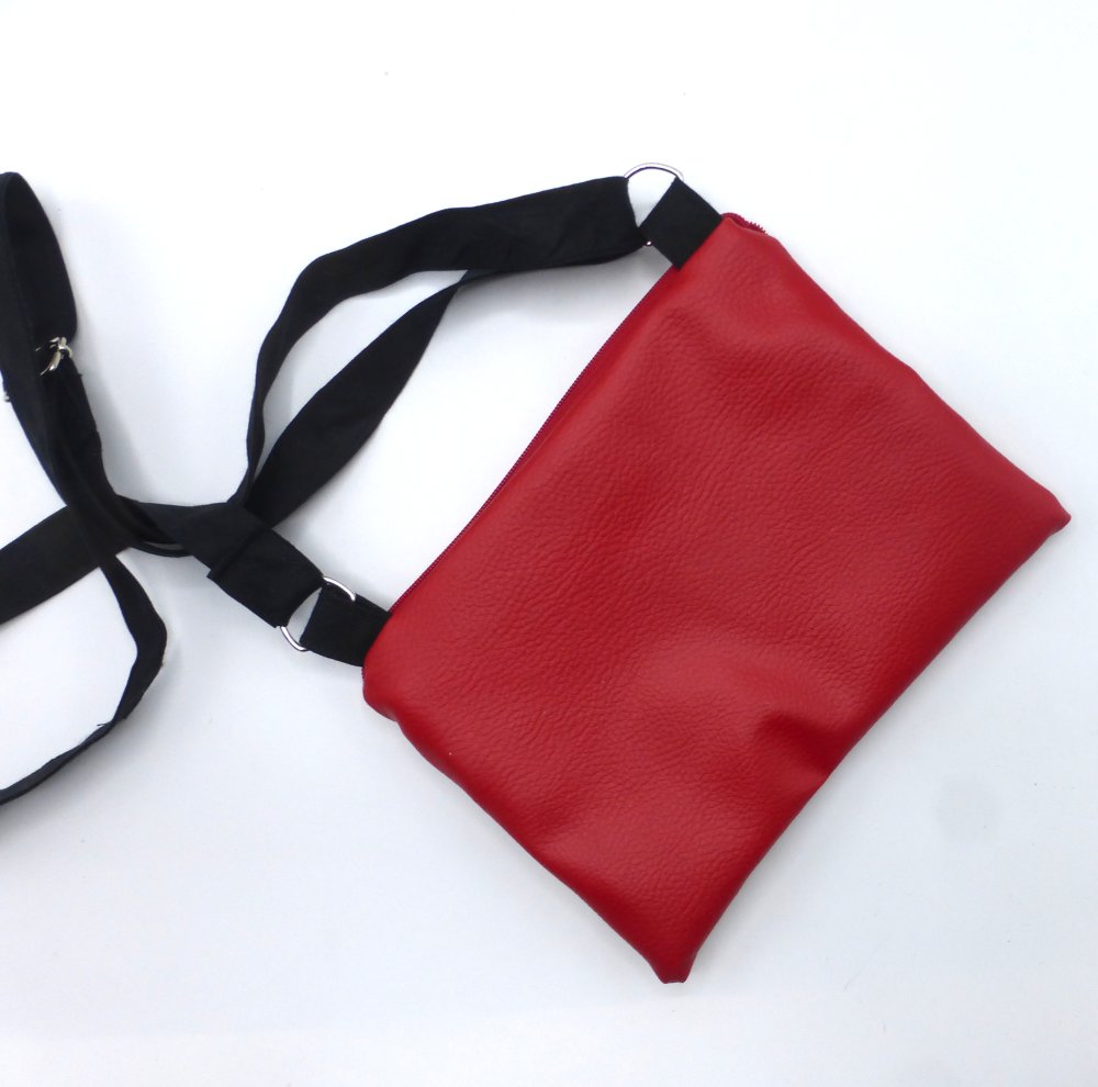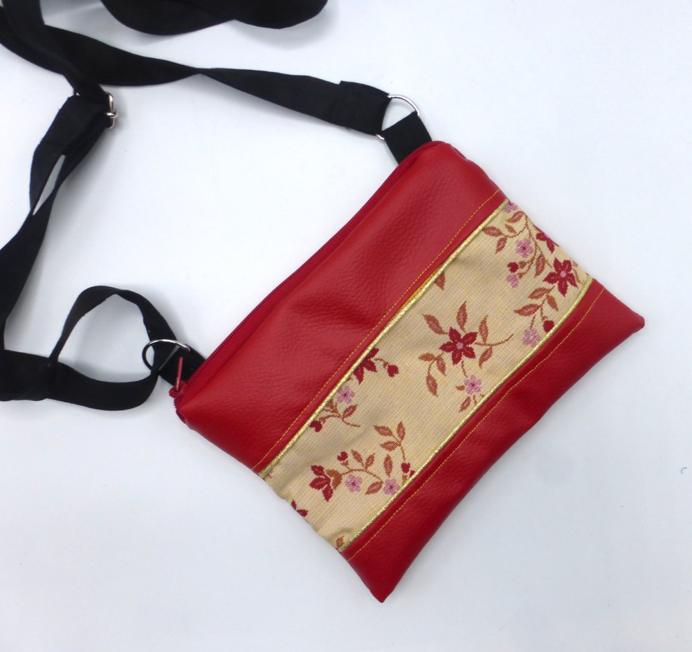 Ce petit sac plat façon pochette à bandoulière est fabriqué avec du coton et du simili cuir rouge soulignés par du passepoil doré.