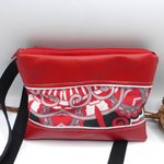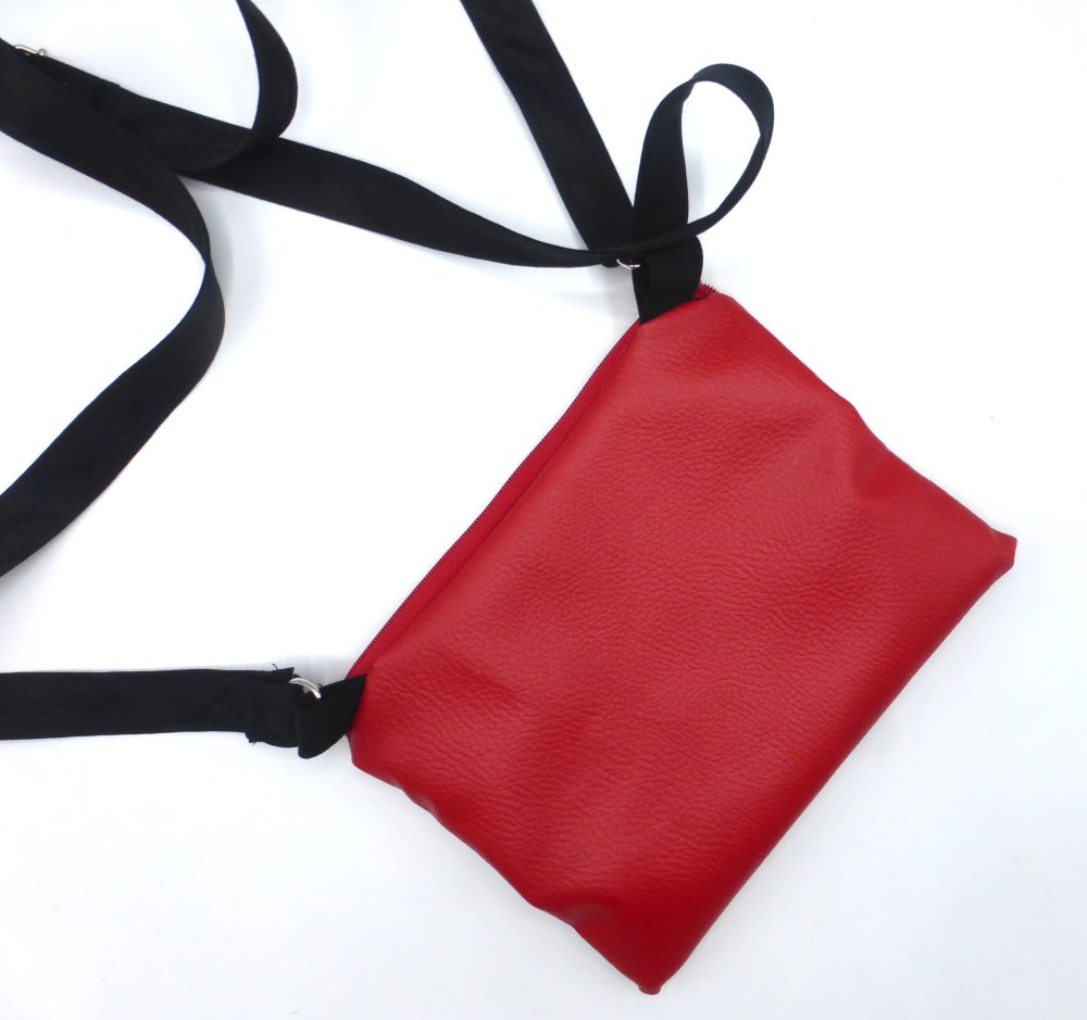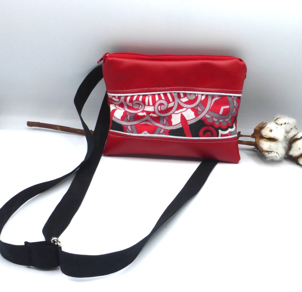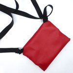 Ce petit sac plat façon pochette à bandoulière est fabriqué avec du coton et du simili cuir rouge soulignés par du passepoil argenté.