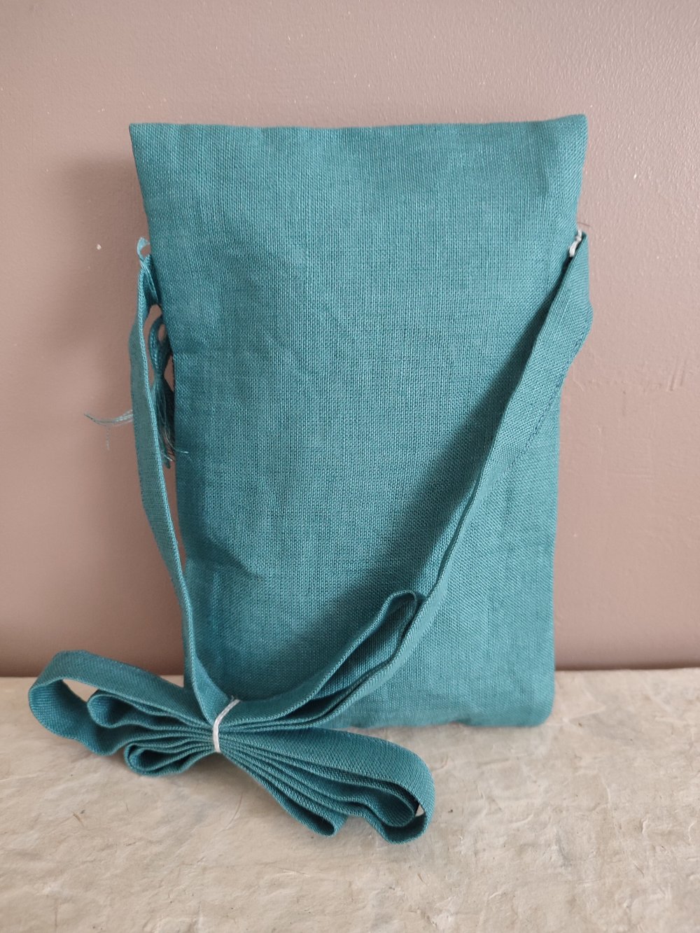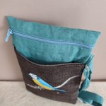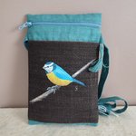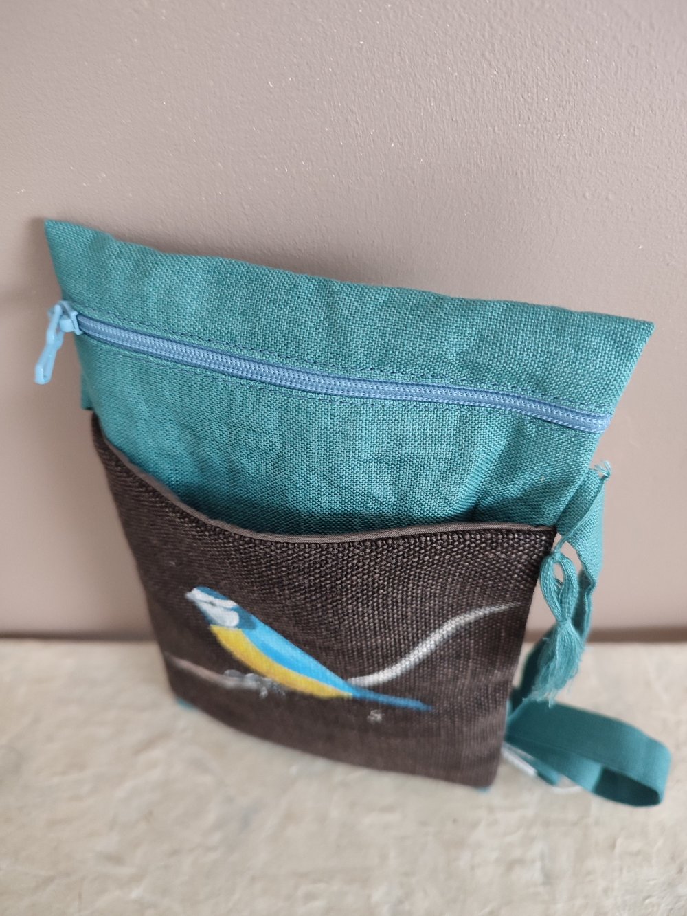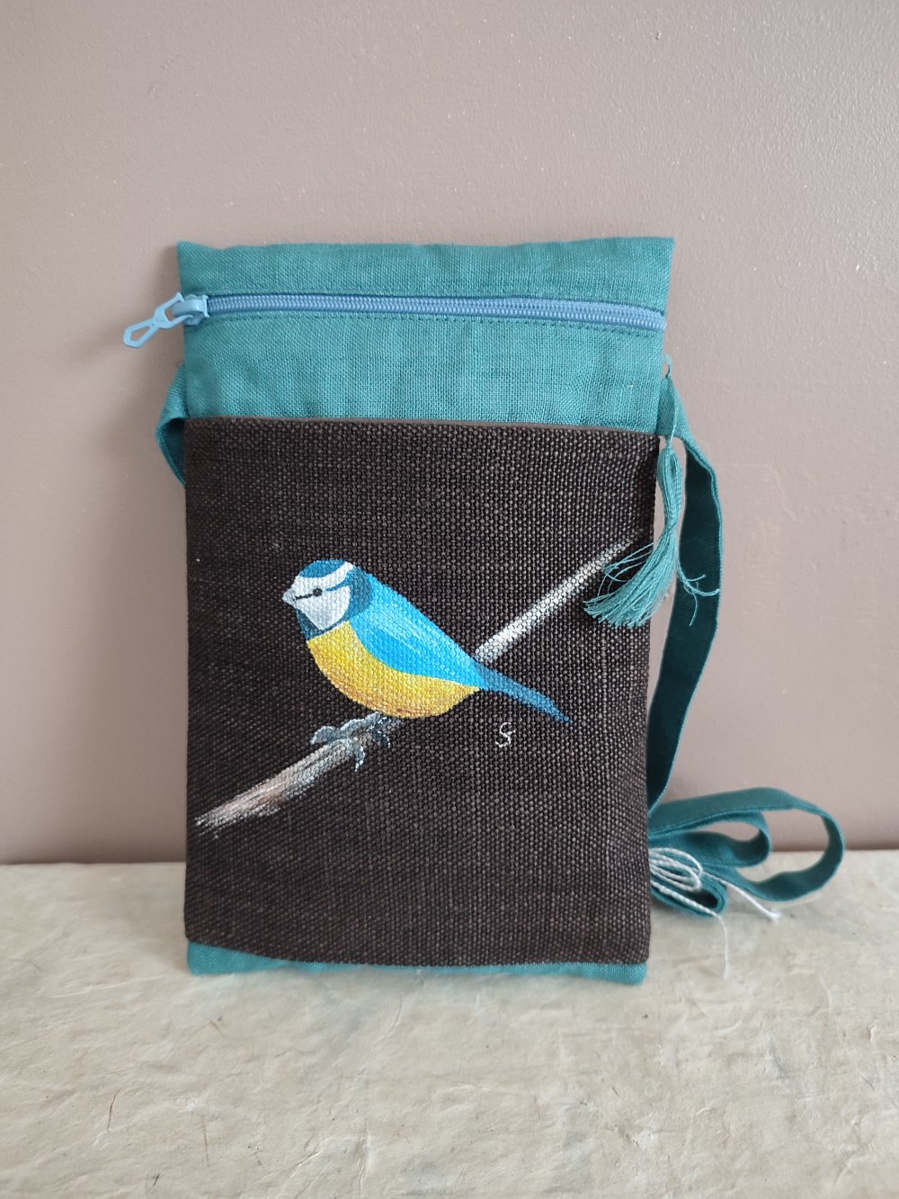Le tissu principal extérieur est 100% en lin. Le choix du tissu est en harmonie avec le motif peint à la main : une mésange du jardin. J'utilise une peinture spéciale textile.