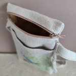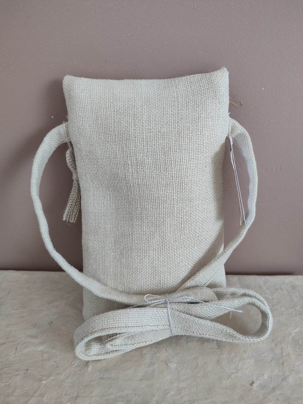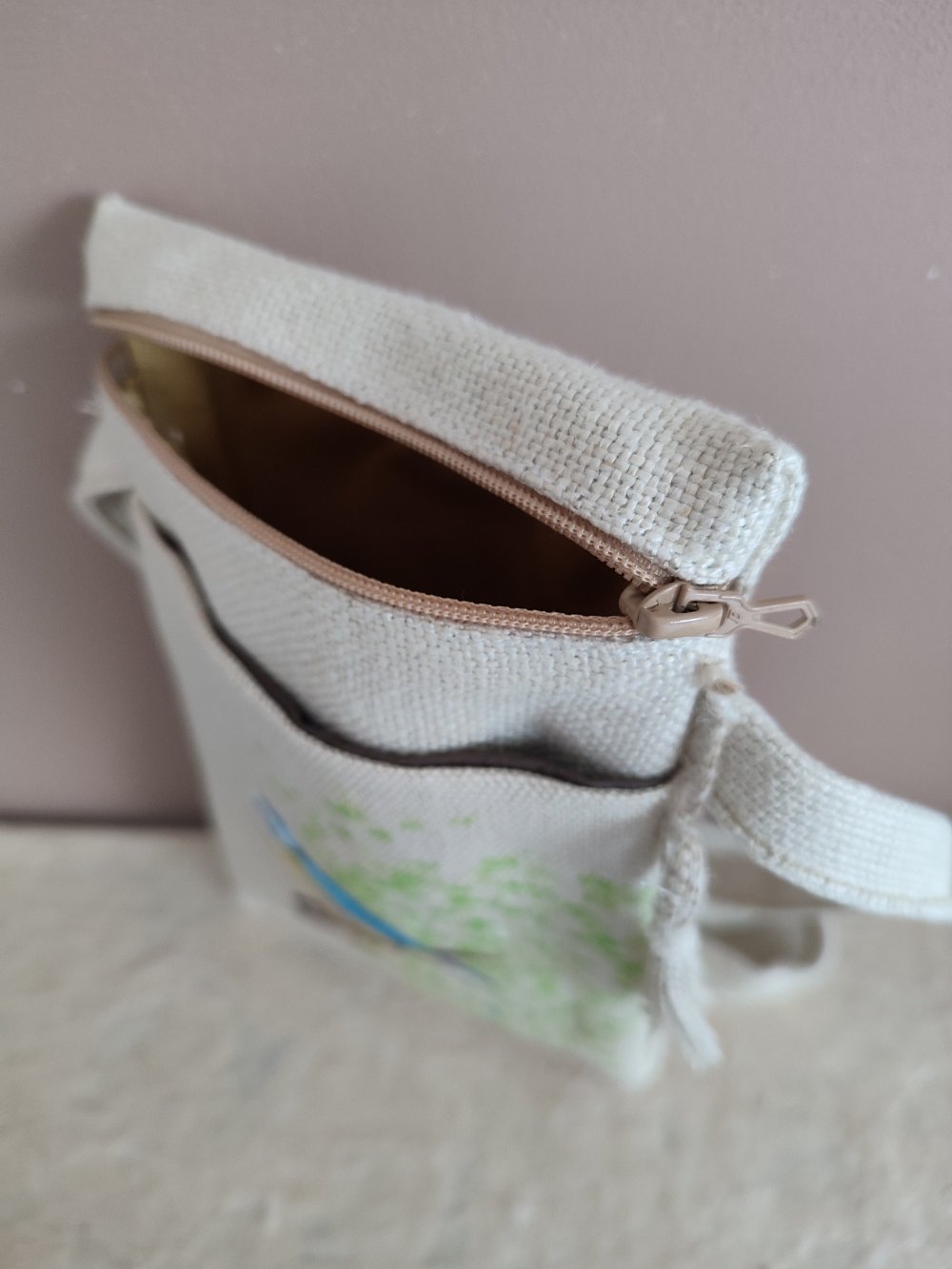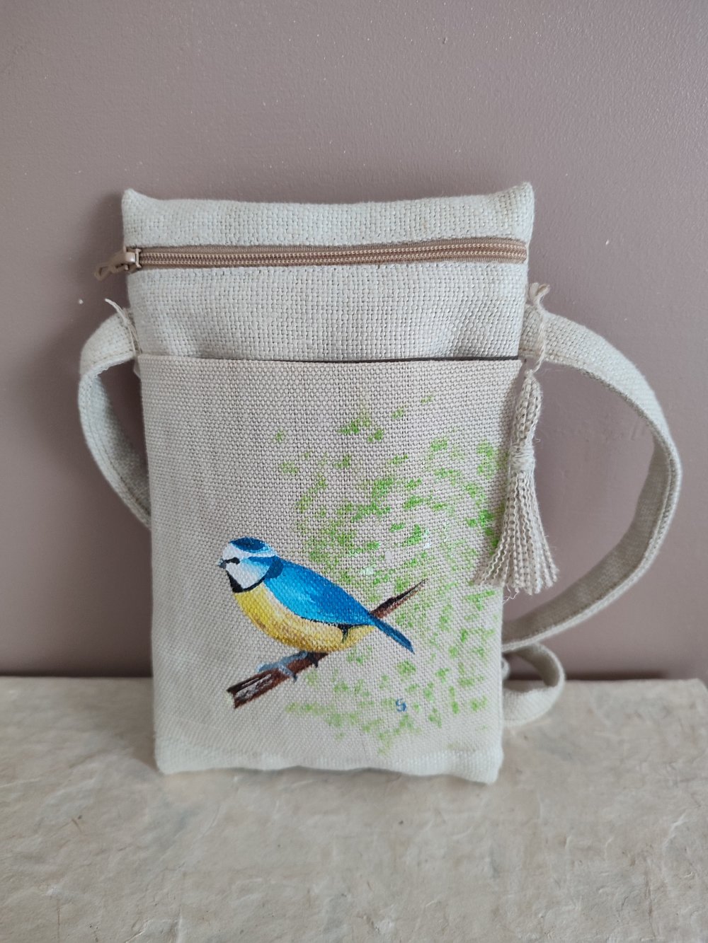 Le tissu principal extérieur est 100% en lin. Le choix du tissu est en harmonie avec le motif peint à la main : une mésange du jardin. J'utilise une peinture spéciale textile.