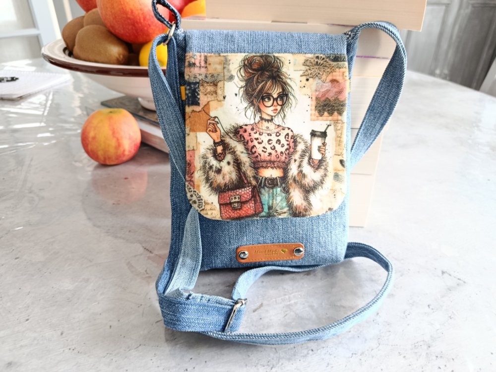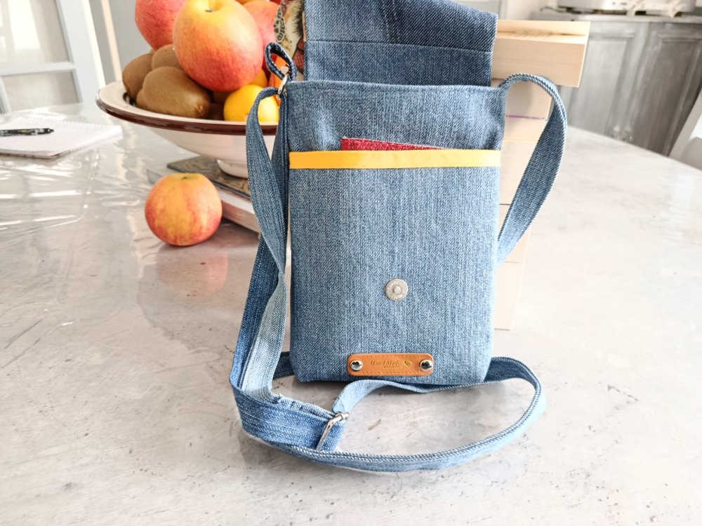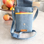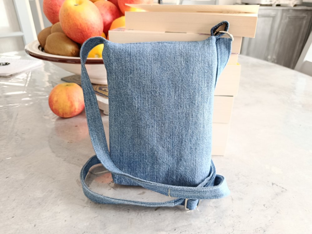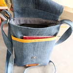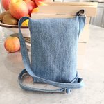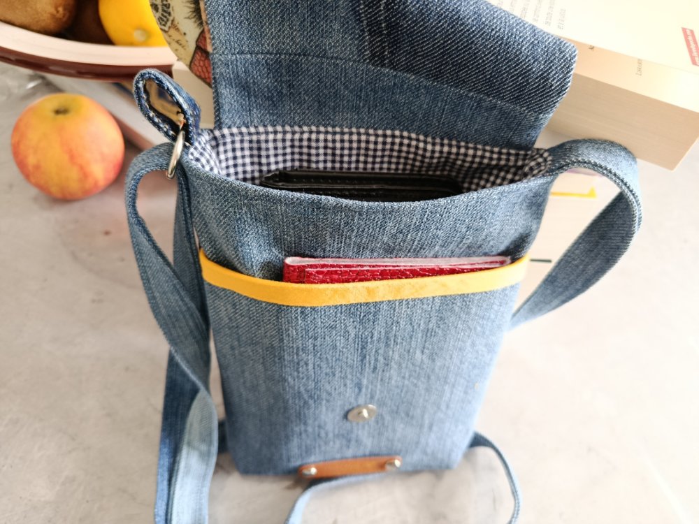 Cette pochette en jean recyclé est doublée en tissu popeline.