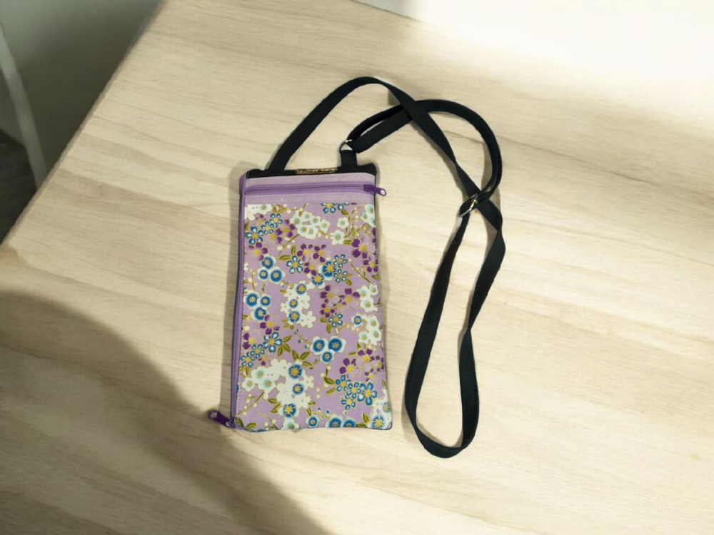 Il se compose d'une poche zippée devant pour le téléphone et d'une grande poche zippée sur le côté pour le reste.