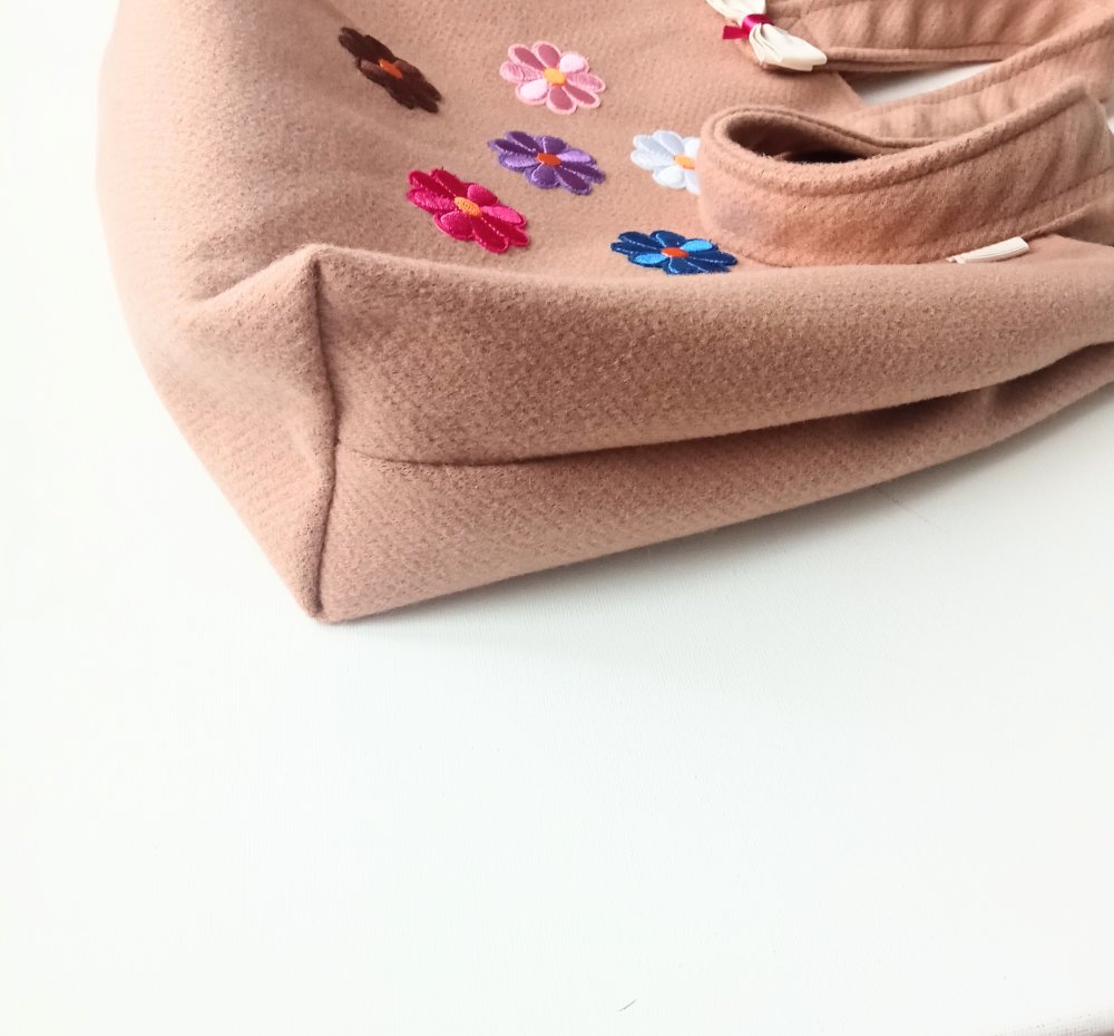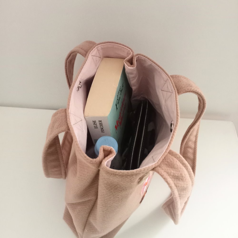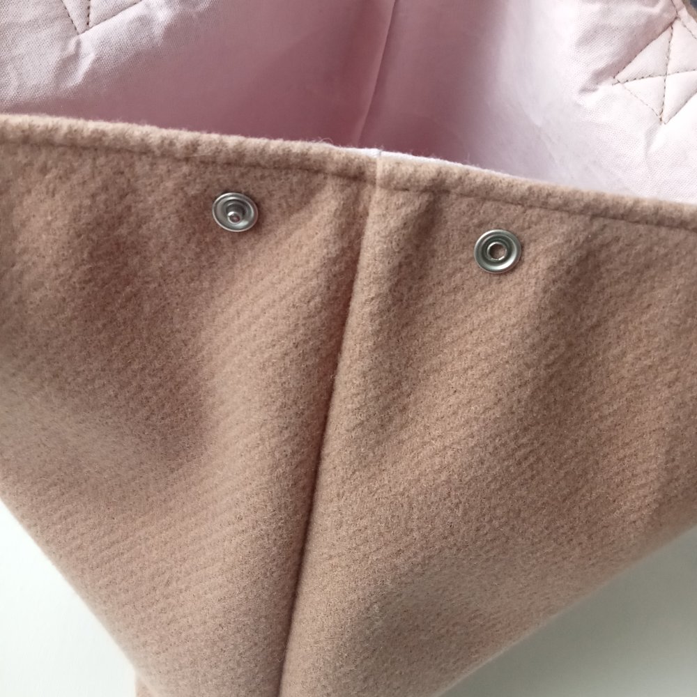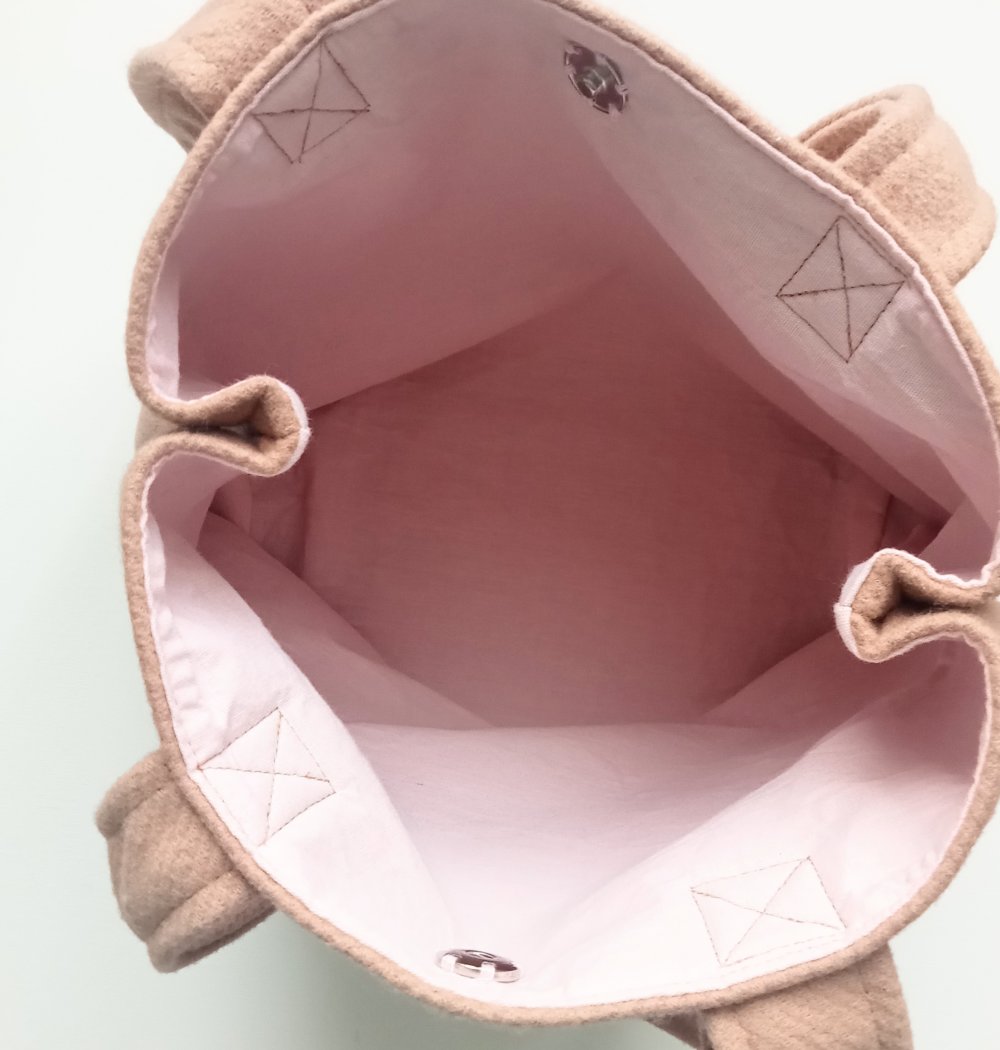 Sac en tissu avec fermeture bouton pression, doublé en tissu coton rose.