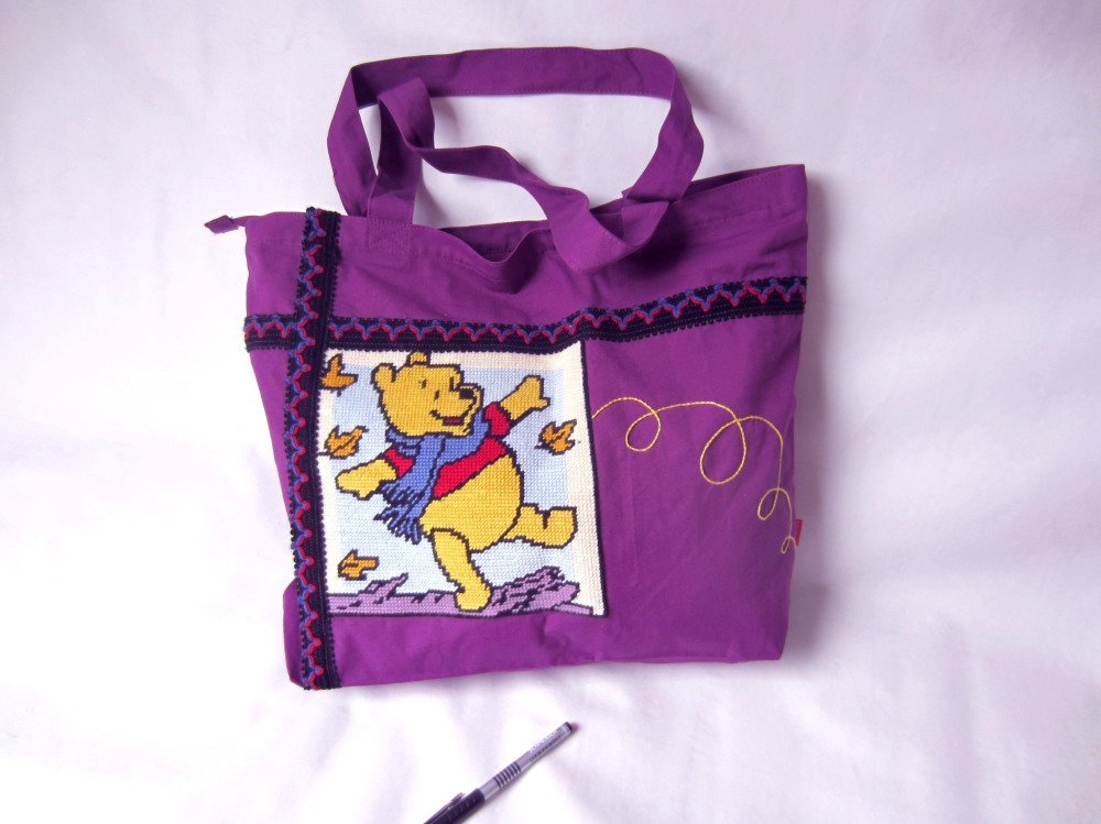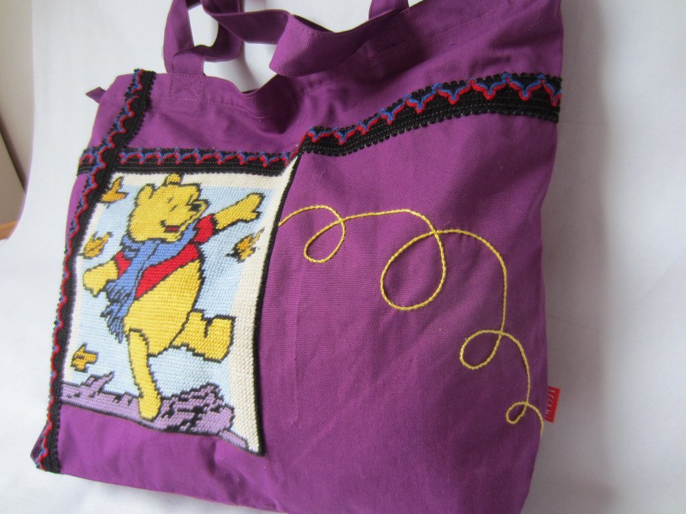 Un canevas du célèbre Winnie l'ourson (réalisé au demi-point de croix en retors DMC) a été appliqué sur l'avant du sac et cerné par un galon de laine aux couleurs assorties.