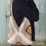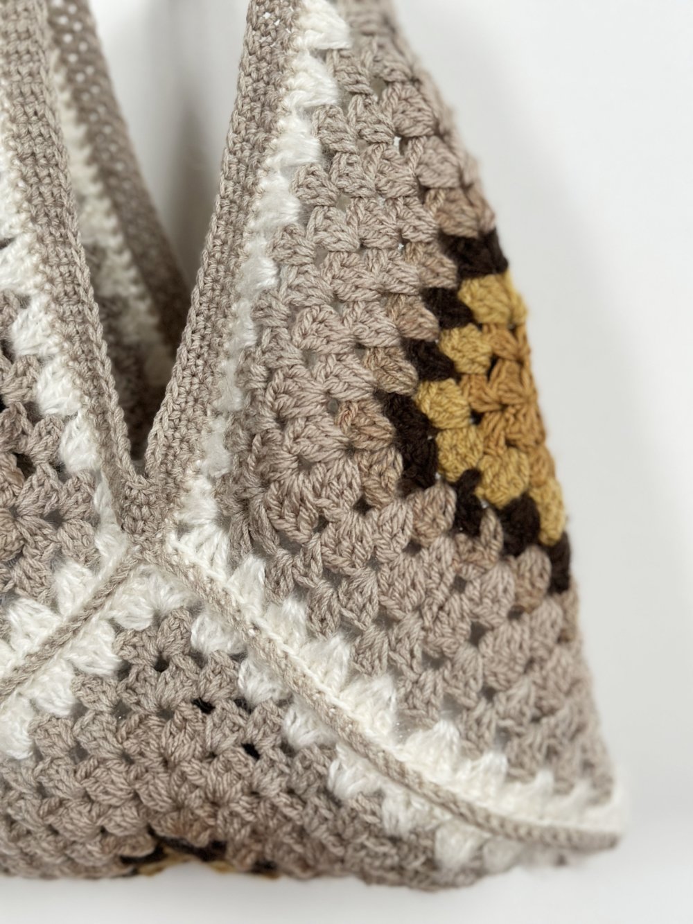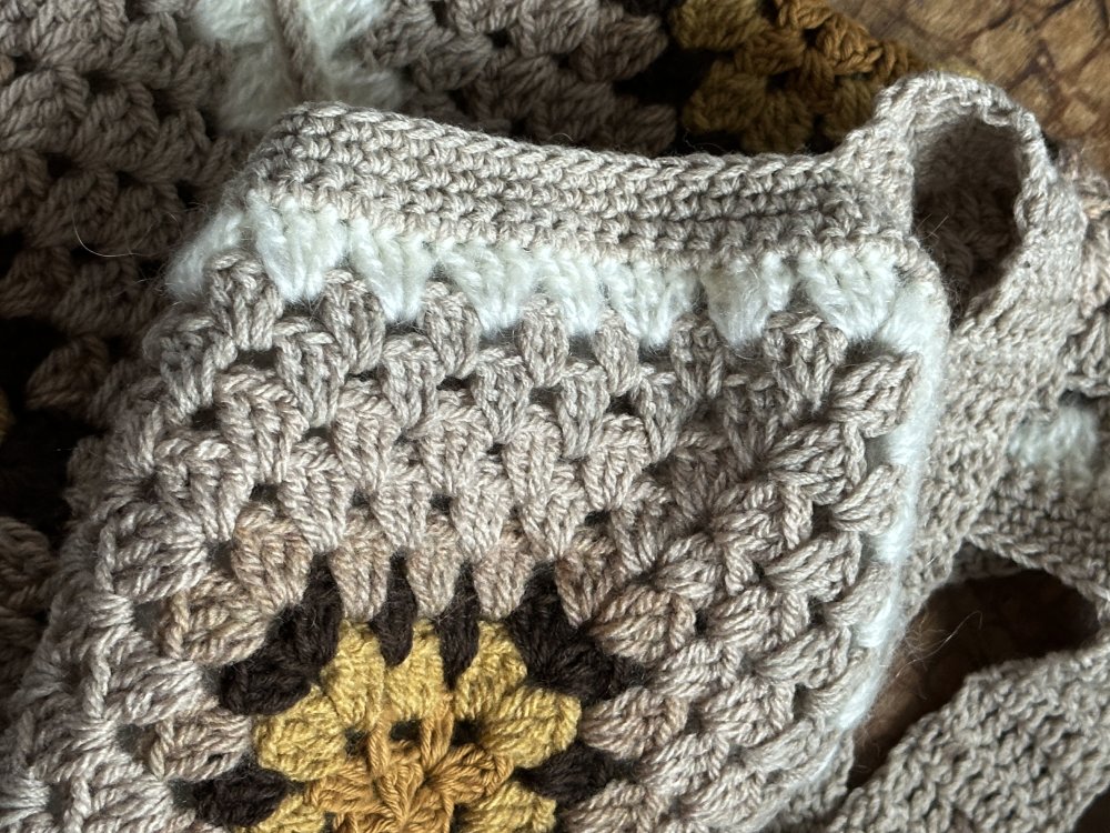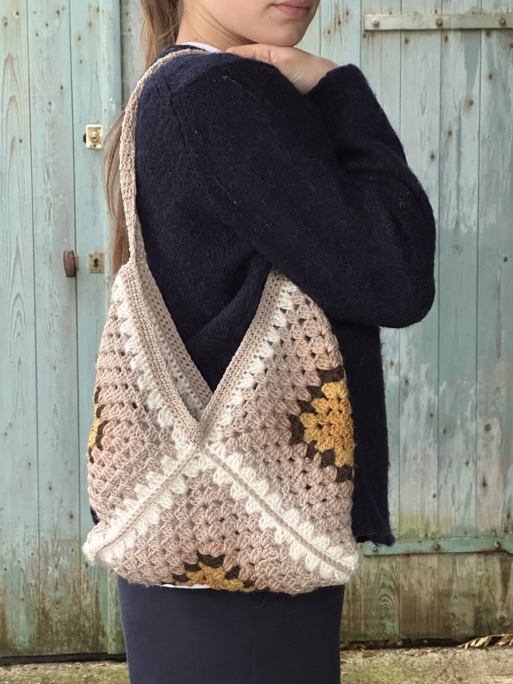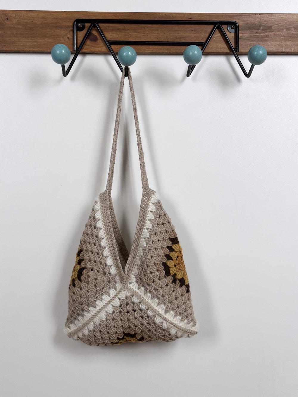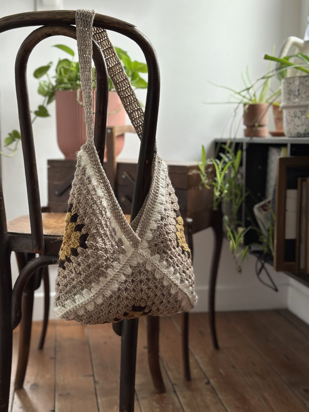Sac à main au crochet en carré granny dans un style vintage et bohème, tons de beige, idée cadeau pour femme