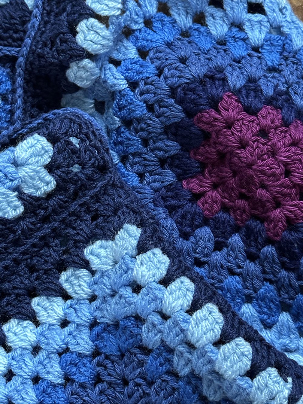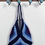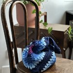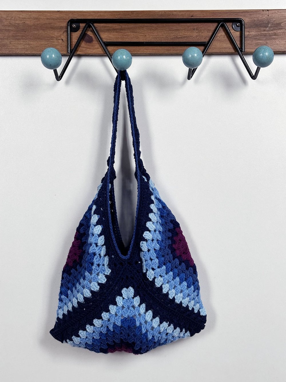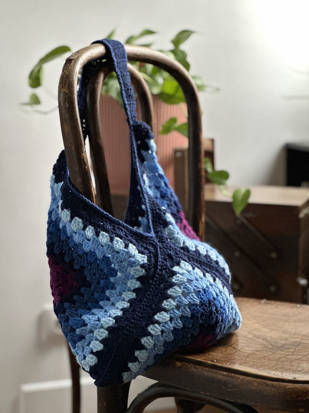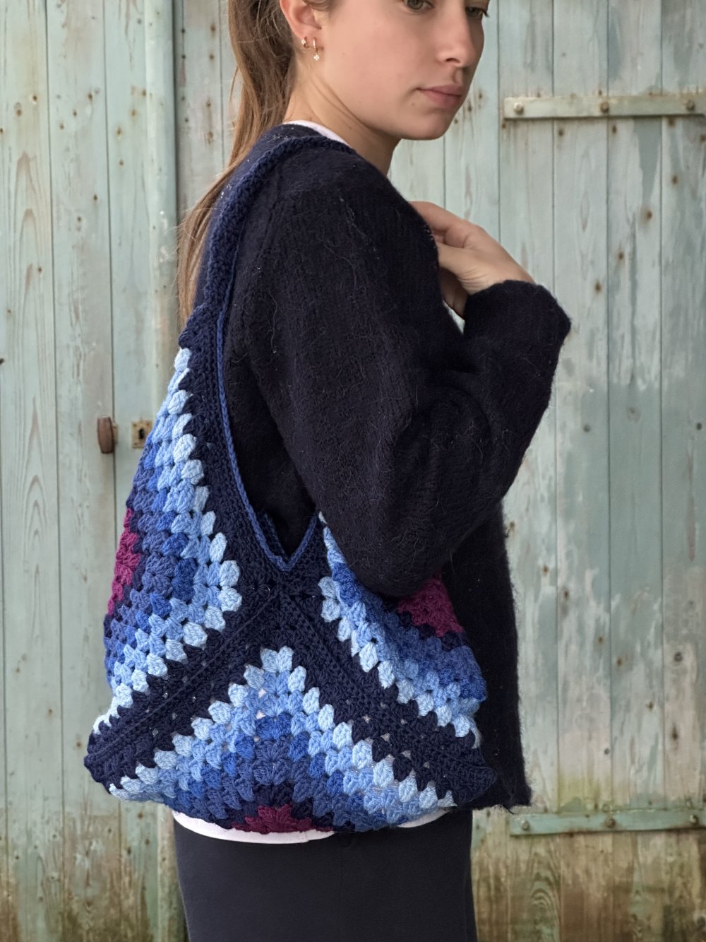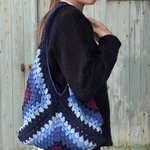 Sac à main au crochet en carré granny dans un style vintage et bohème, tons de bleu, idée cadeau pour femme