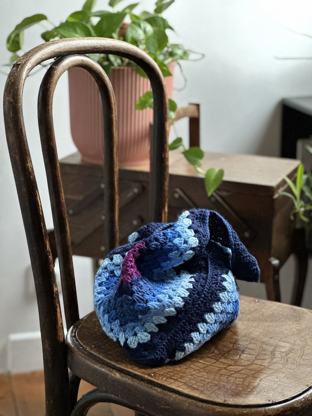 Découvrez le sac à main Peridot, un accessoire fait main au crochet avec des fils mélangés (laine–coton) issus de stock dormants, pour un engagement éco-responsable. Ses nuances de bleu et ses carrés granny lui donnent un style vintage, bohème et décontracté.