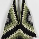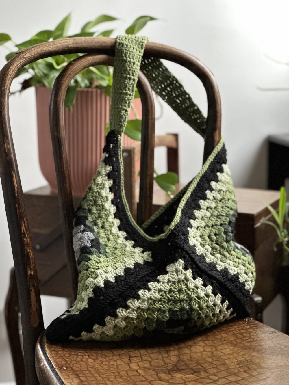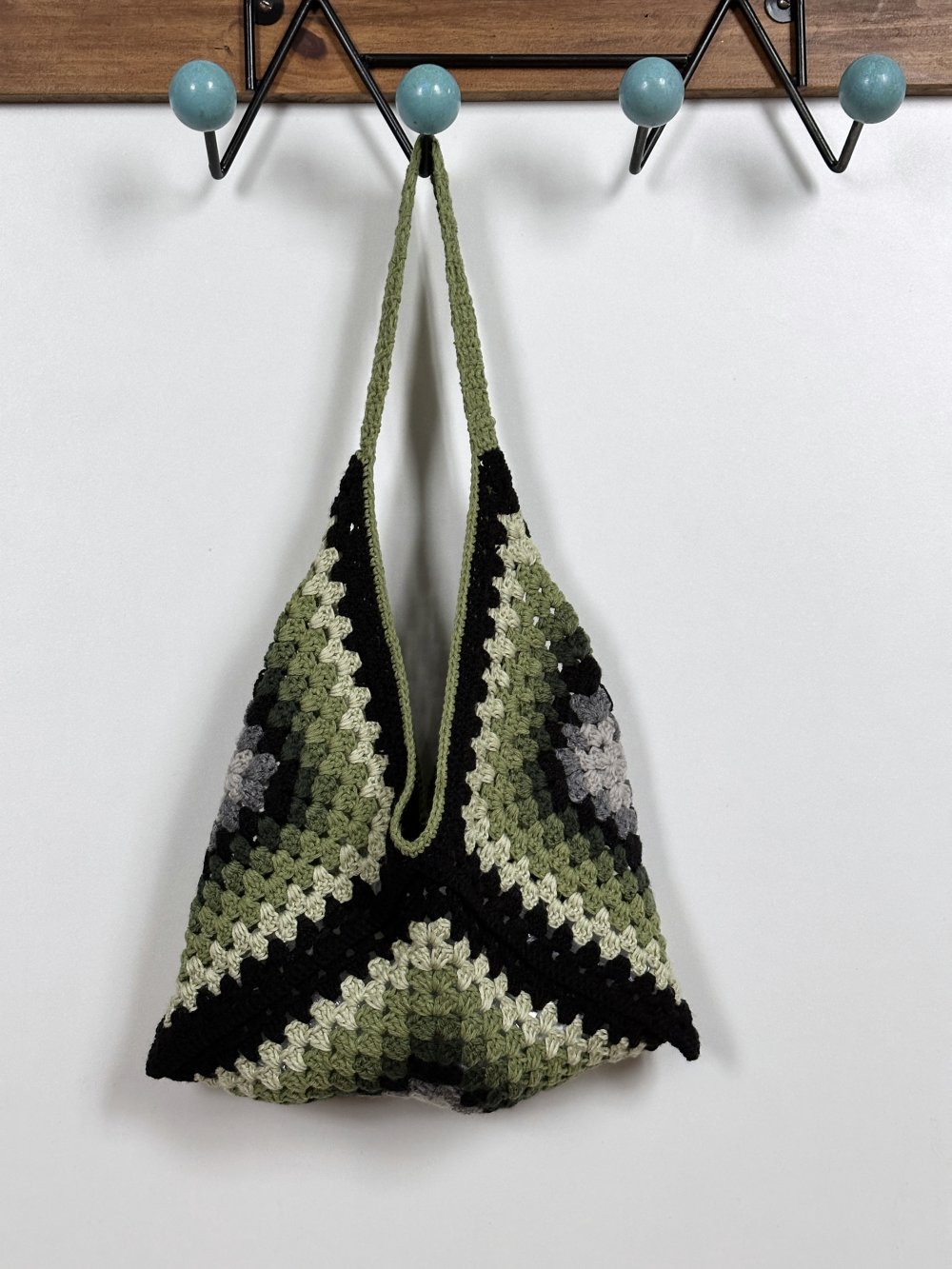 Sac à main au crochet en carré granny dans un style vintage et bohème, tons de vert, idée cadeau pour femme