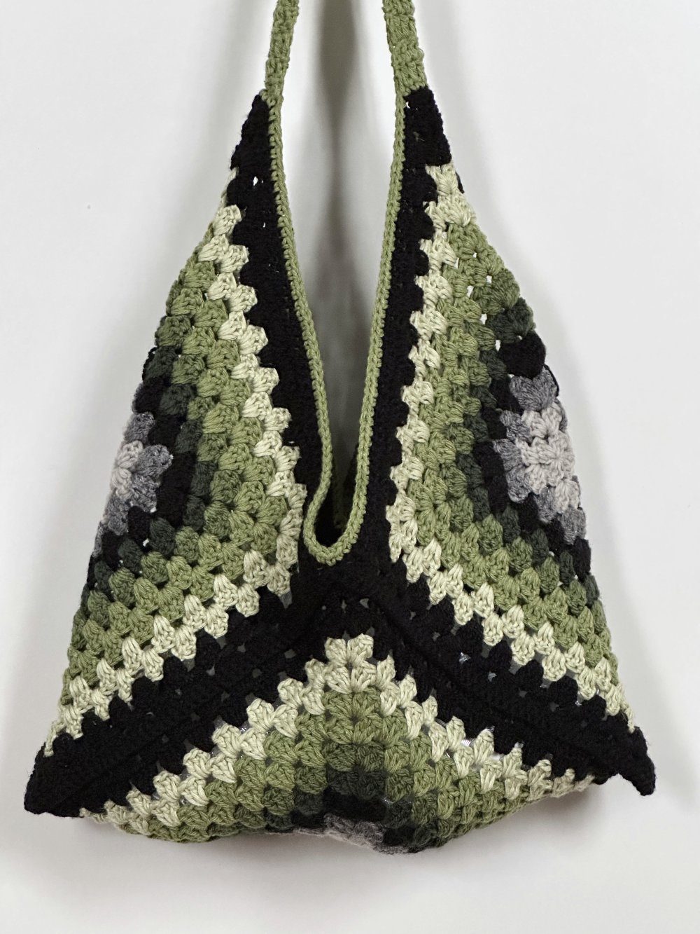Découvrez le sac à main Peridot, un accessoire fait main au crochet avec des fils mélangés (laine–coton) issus de stock dormants, pour un engagement éco-responsable. Ses teintes vertes et ses carrés granny lui donnent un style vintage, bohème et décontracté.
