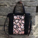 Sac à main brodé femme, tote bag à bandoulière , broderie fleurs sauvages , toile noire, liege marron, tissu fleurs roses et blanches