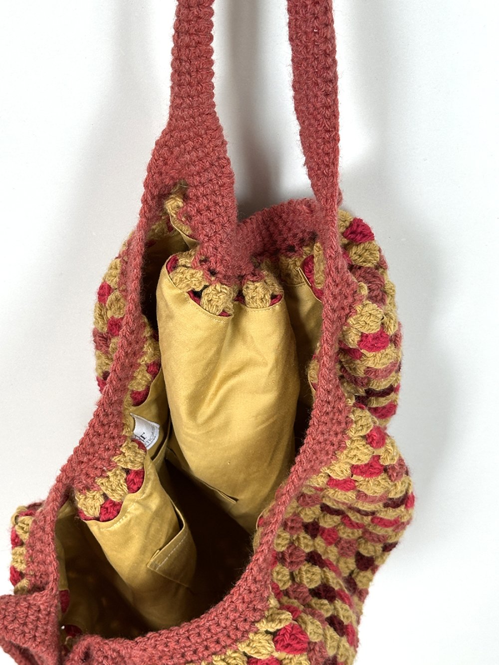 Découvrez le sac à main Olivenite, un accessoire fait main au crochet avec des fils acrylique très résistants issus de stocks dormants, pour un engagement éco-responsable.