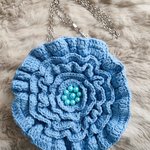 Sac à main en forme de fleur de couleur bleu ciel, avec des perles bleues brillant au coeur de la fleur. Le sac est fait main au crochet avec du fil cotton oekotex, chaîne argentée réglable pour porter le sac à l'épaule ou en bandoulière, doté d'un bouton magnétique pour le fermer