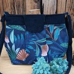 Un motif grandes palmes très chic décore ce sac à main. La couleur dominante est le bleu marine.