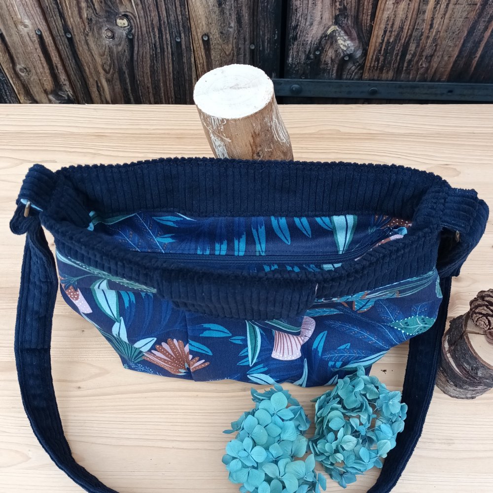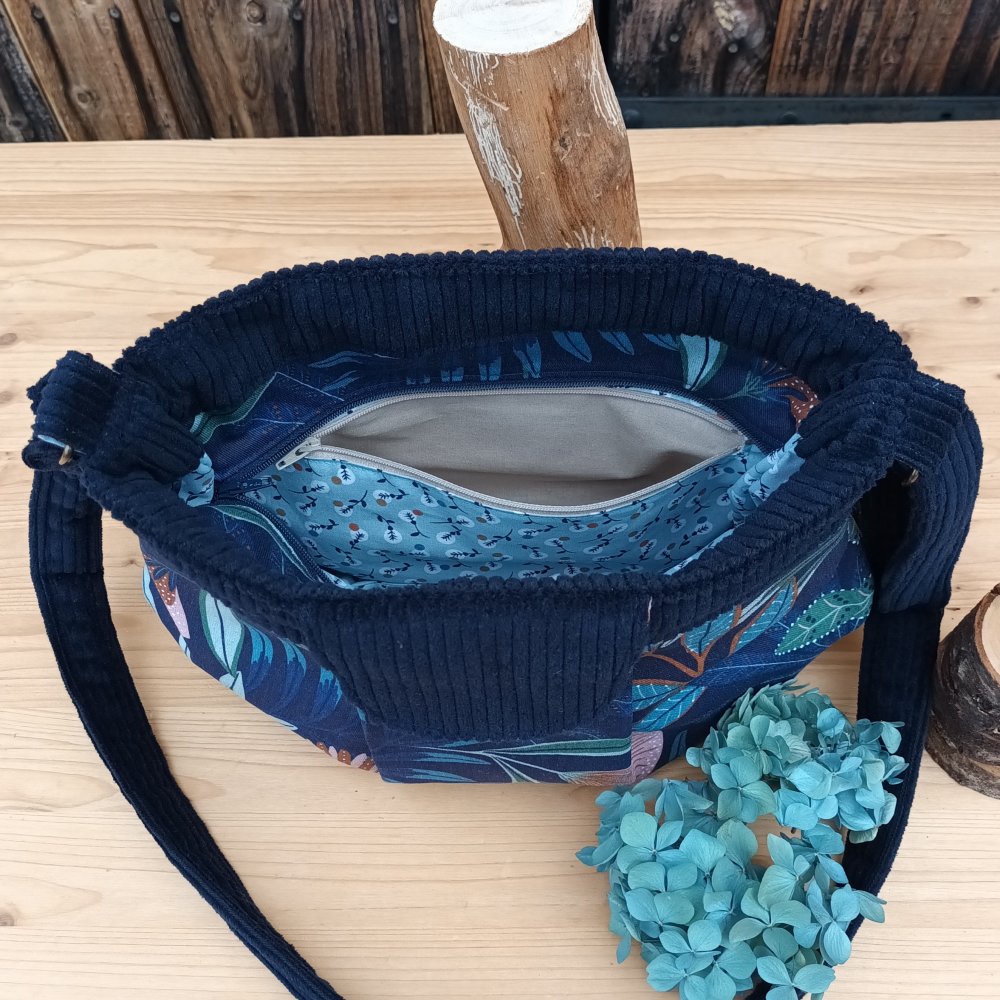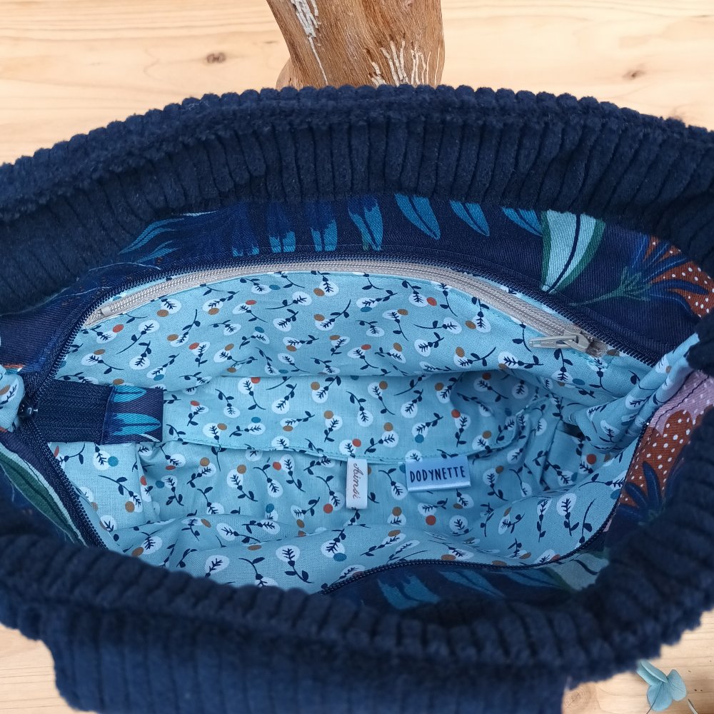 Le haut et l'anse de ce sac sont en velours côtelé bleu marine 100% coton.