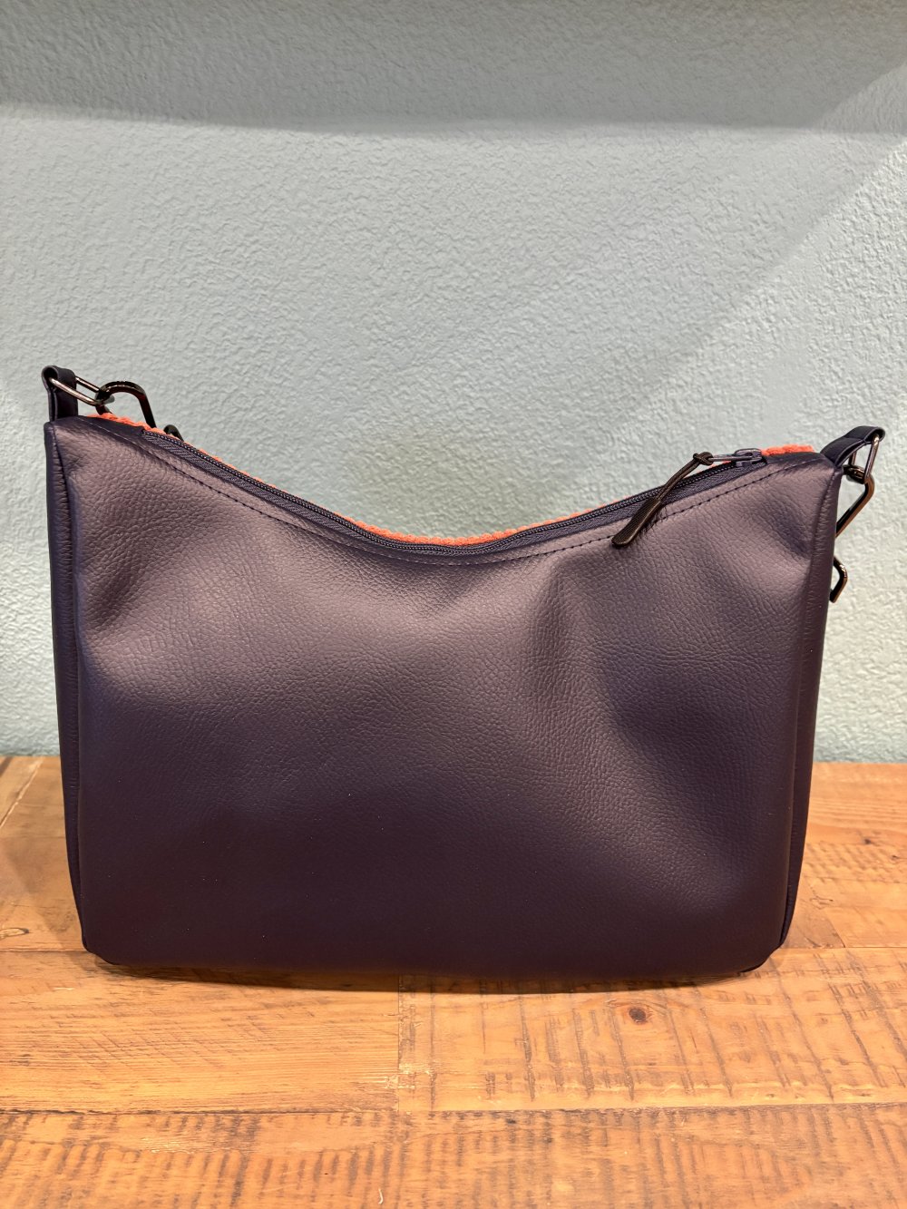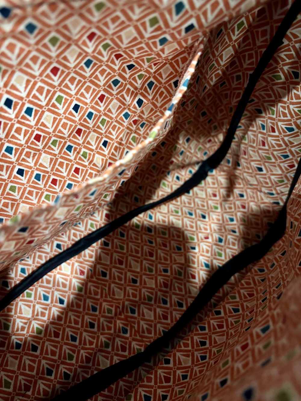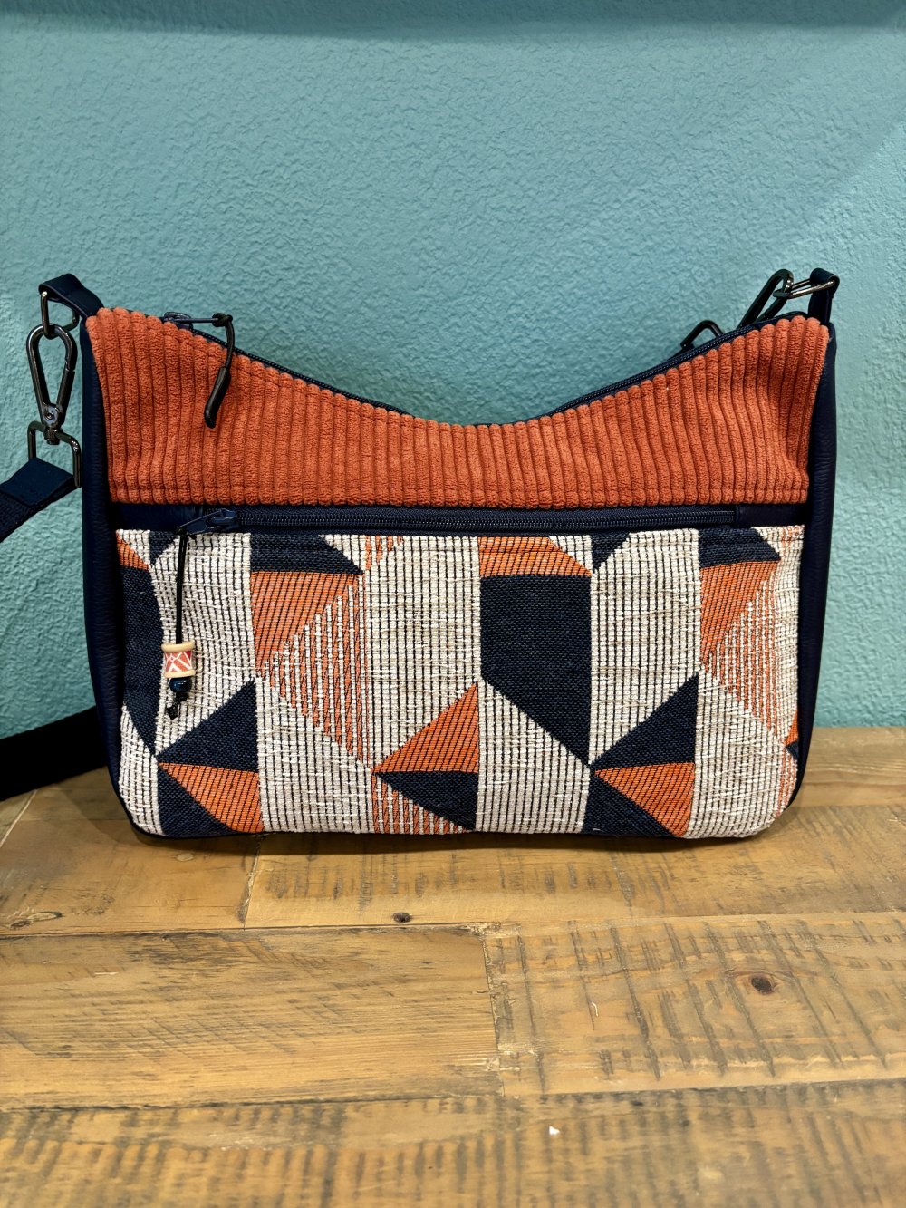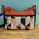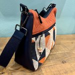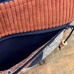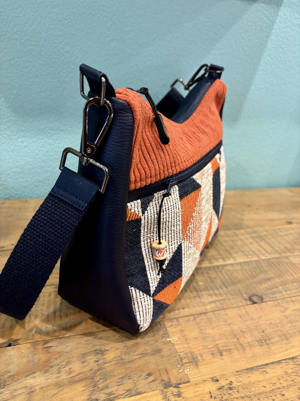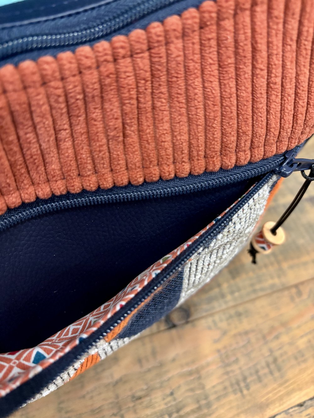 Sac à main en simili, velours côtelé et coton pour l'extérieur, cotonnade pour l'intérieur, fermé par une fermeture éclair