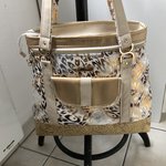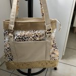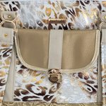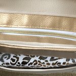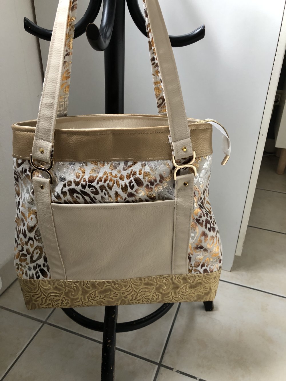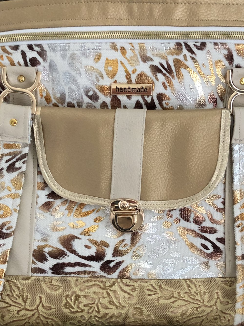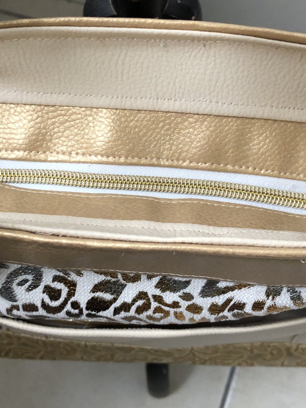 Sac en simili doré et blanc très élégant et se porte très bien décontracté .Devant une poche fermée avec fermoir doré puis une autre zippée .Derrière une poche plaquée Deux anses épaule où main reliées à deux connecteurs dorés .fermeture éclair pour plus de sécurité.fond avec des pieds mesure