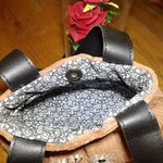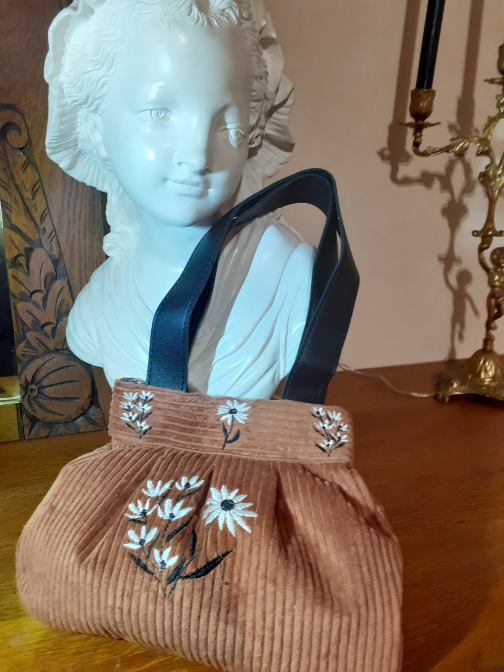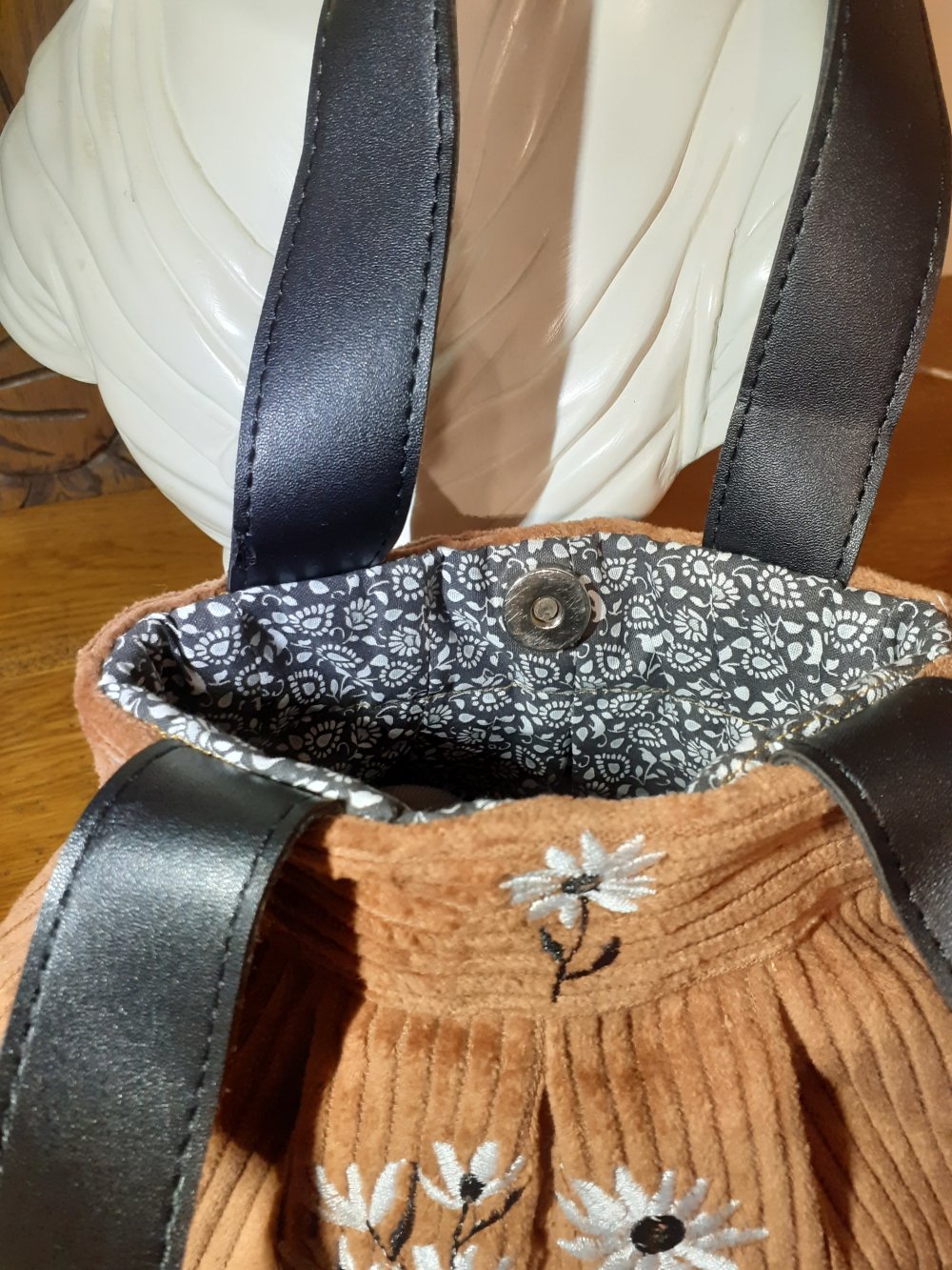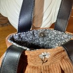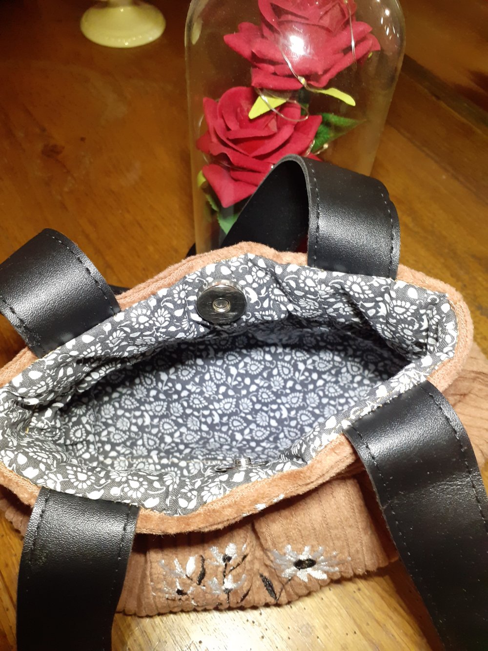 Petit sac à main en velours orné d'une fleur brodée à la machine il est doublé d'un tissu en coton imprimé fermeture à l'aide d'un bouton-pression aimanté