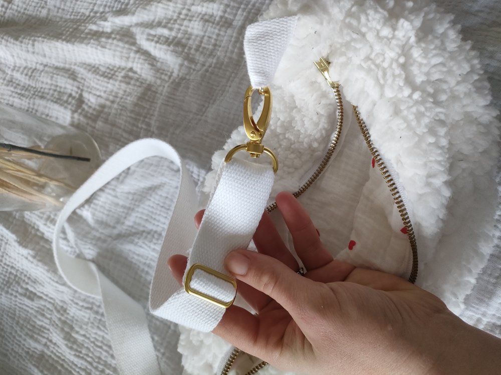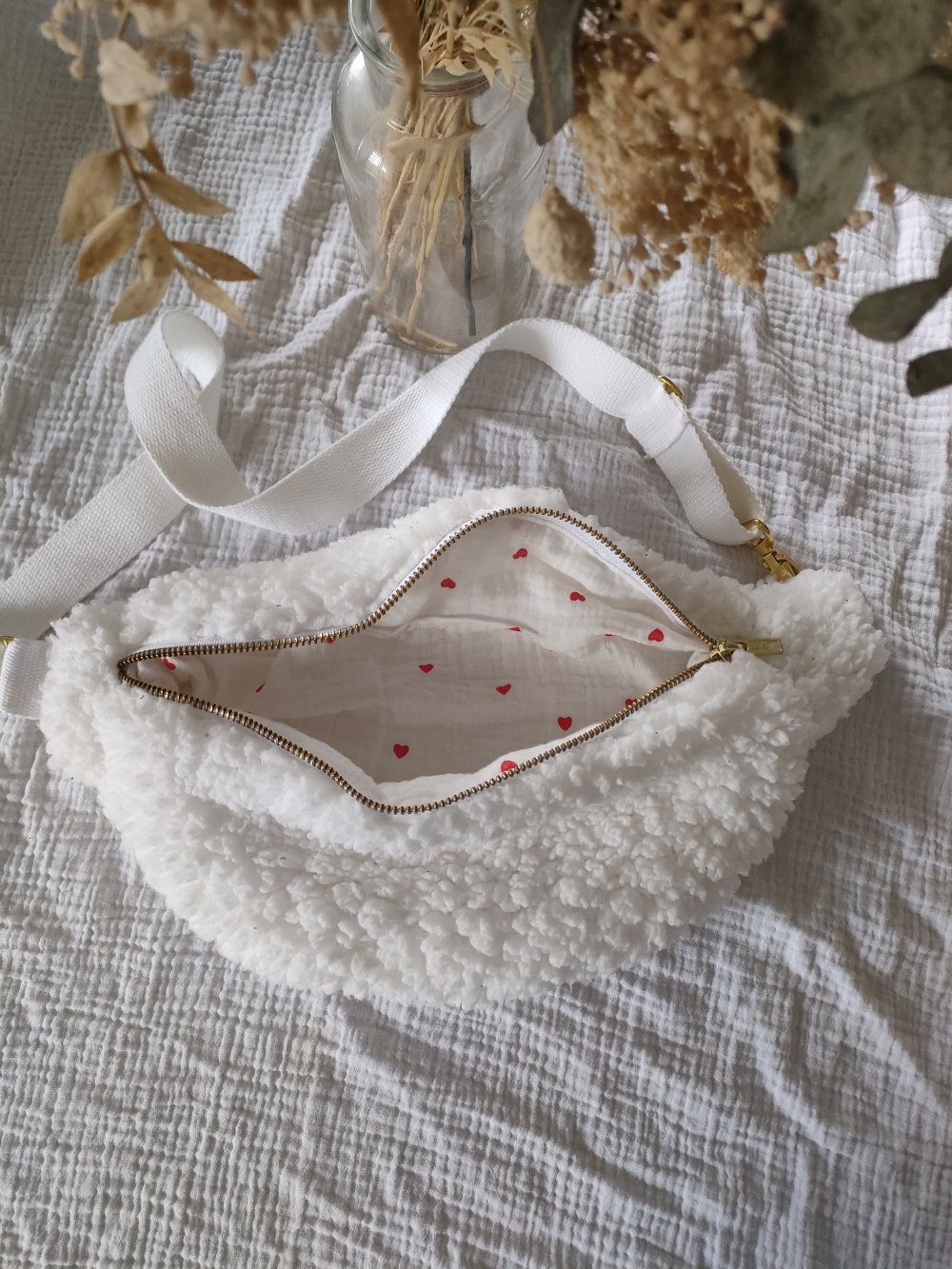 Sac banane en sherpa blanche et intérieur en double gaze de coton blanche et petit coeurs rouge.