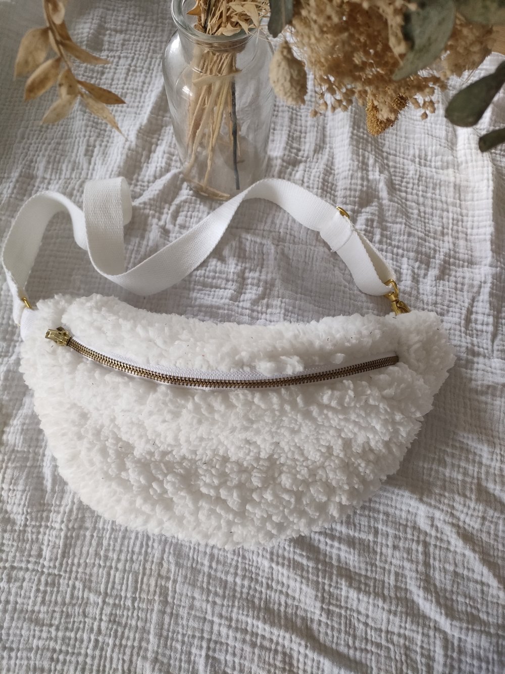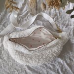 Sac banane fait main extérieur en sherpa, intérieur en double gaze et une sangle réglable.