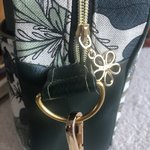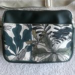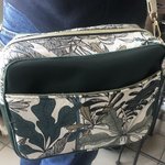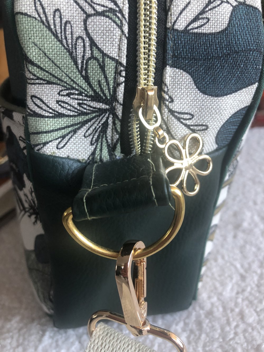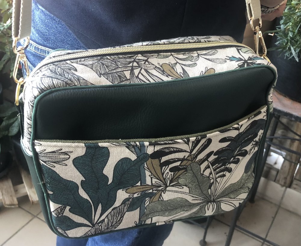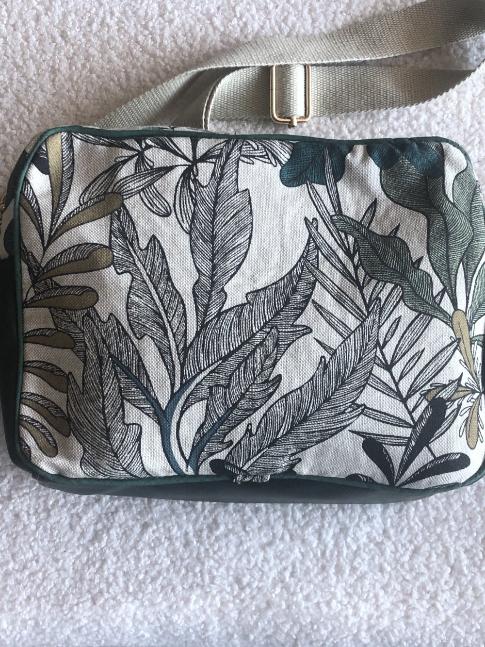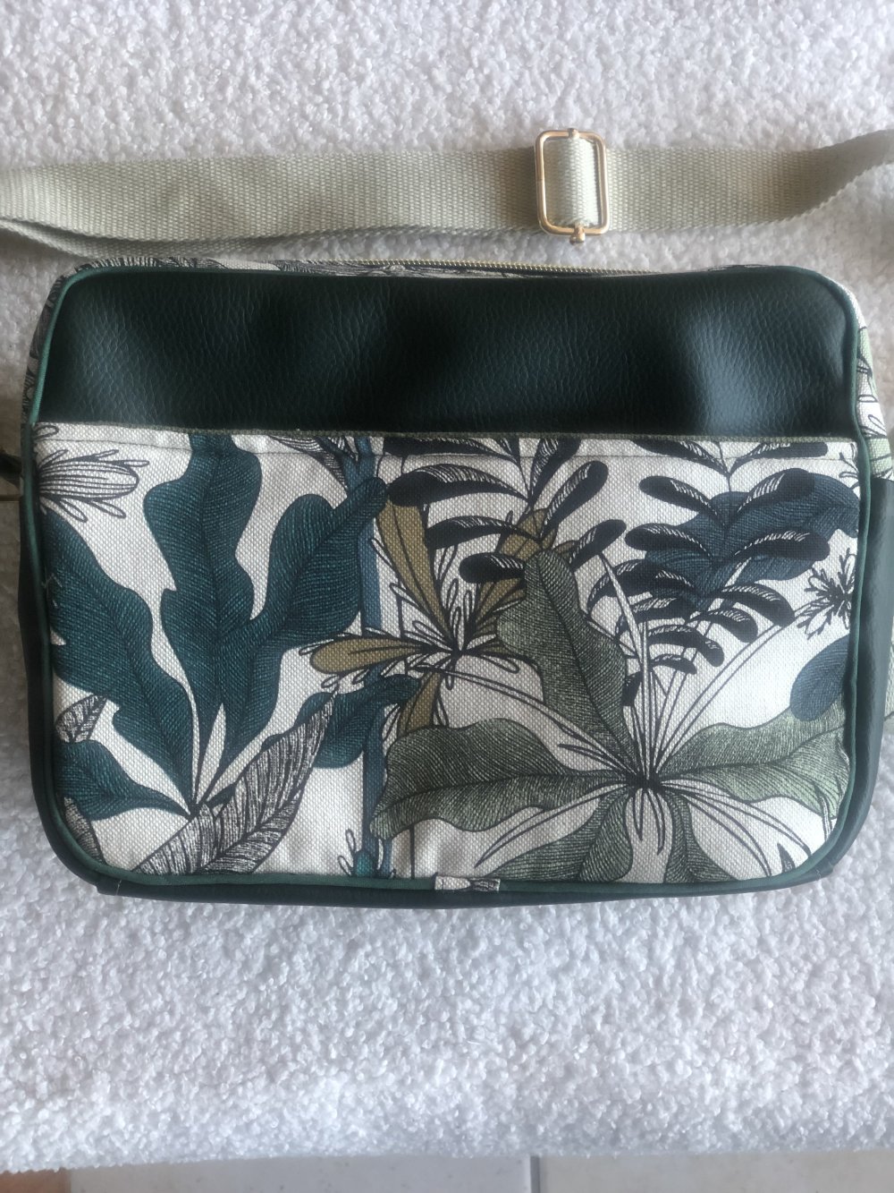 DEVANT 1 POCHE PRESSION. LE CORP TISSU ÉPAIS .LE FOND SIMILI VERT FONCÉ.PASSEPOIL VERT FONCÉ POUR UNE JOLIE FINITION .FERMETURE ÉCLAIR DORÉ EMBOUT PETITE FLEUR .BANDOULIÈRE BEIGE VERDÂTRE .ENTIÈREMENT DOUBLÉ.GRANDE CAPACITÉ DE RANGEMENTS