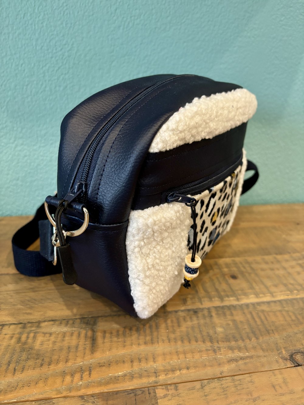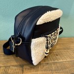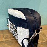 Un sac bandoulière dans des tissus effet mouton et enduit