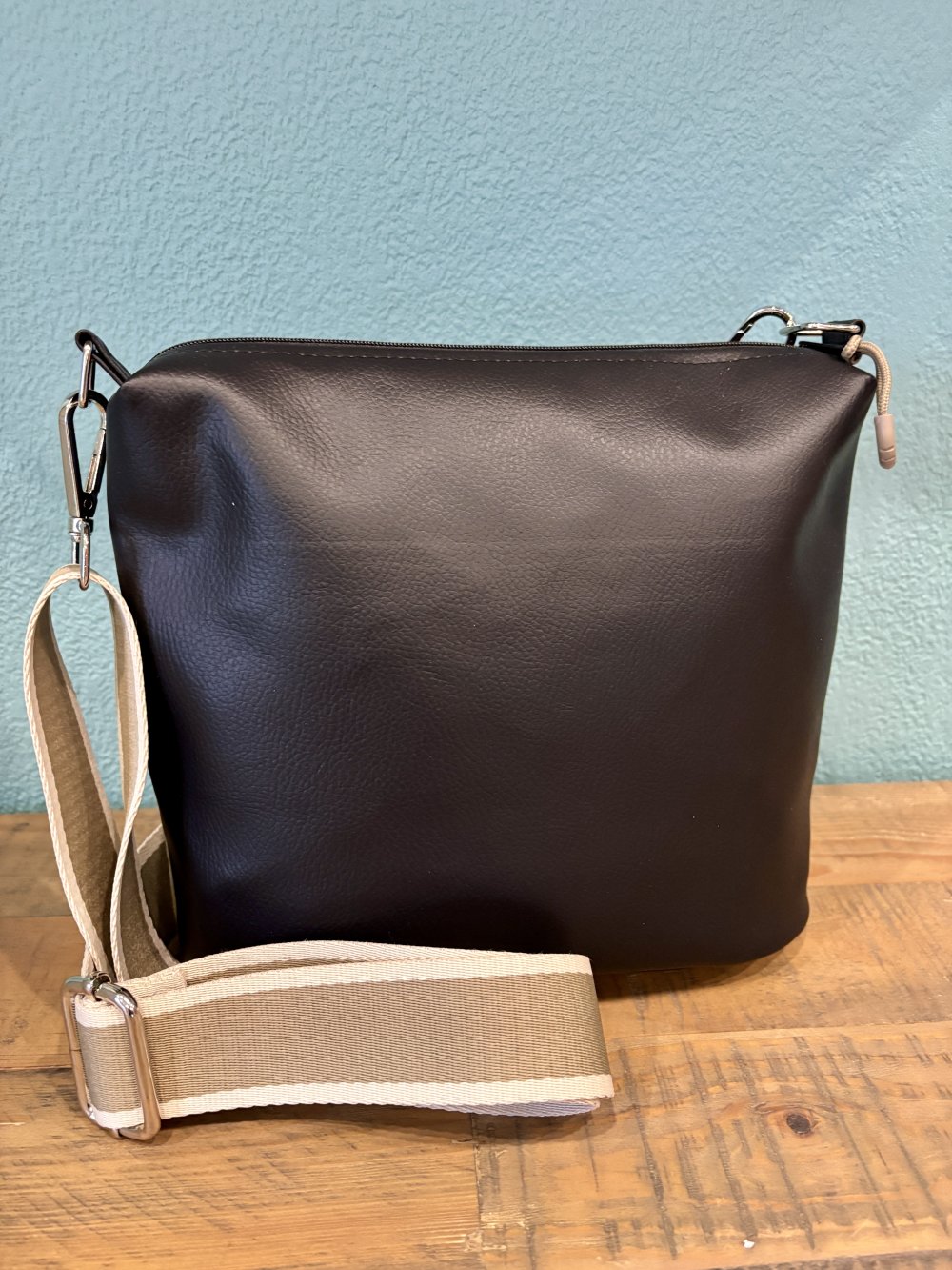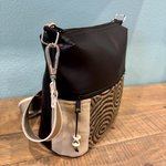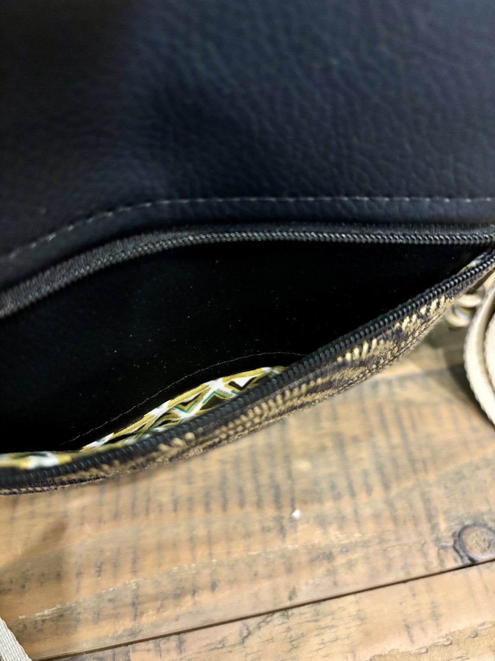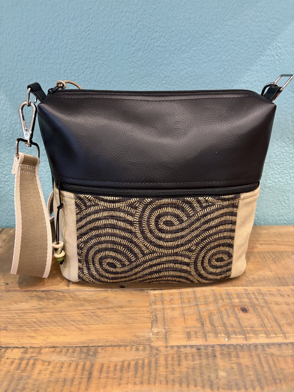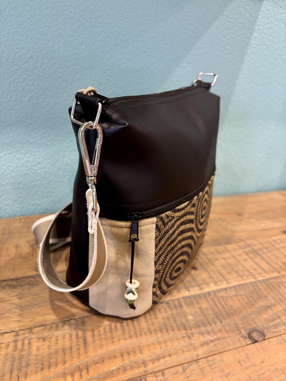 Sac bandoulière en simili noir et velours taupe, intérieur coton 1 poche